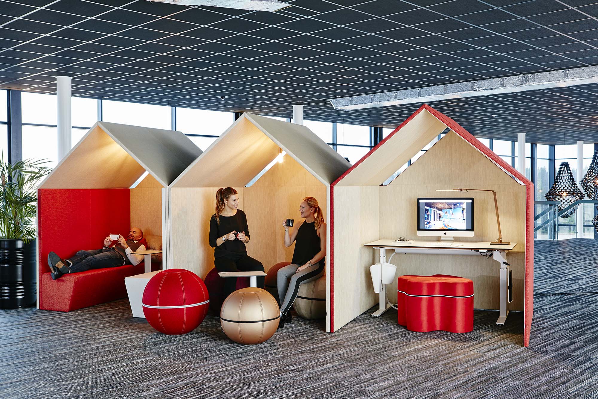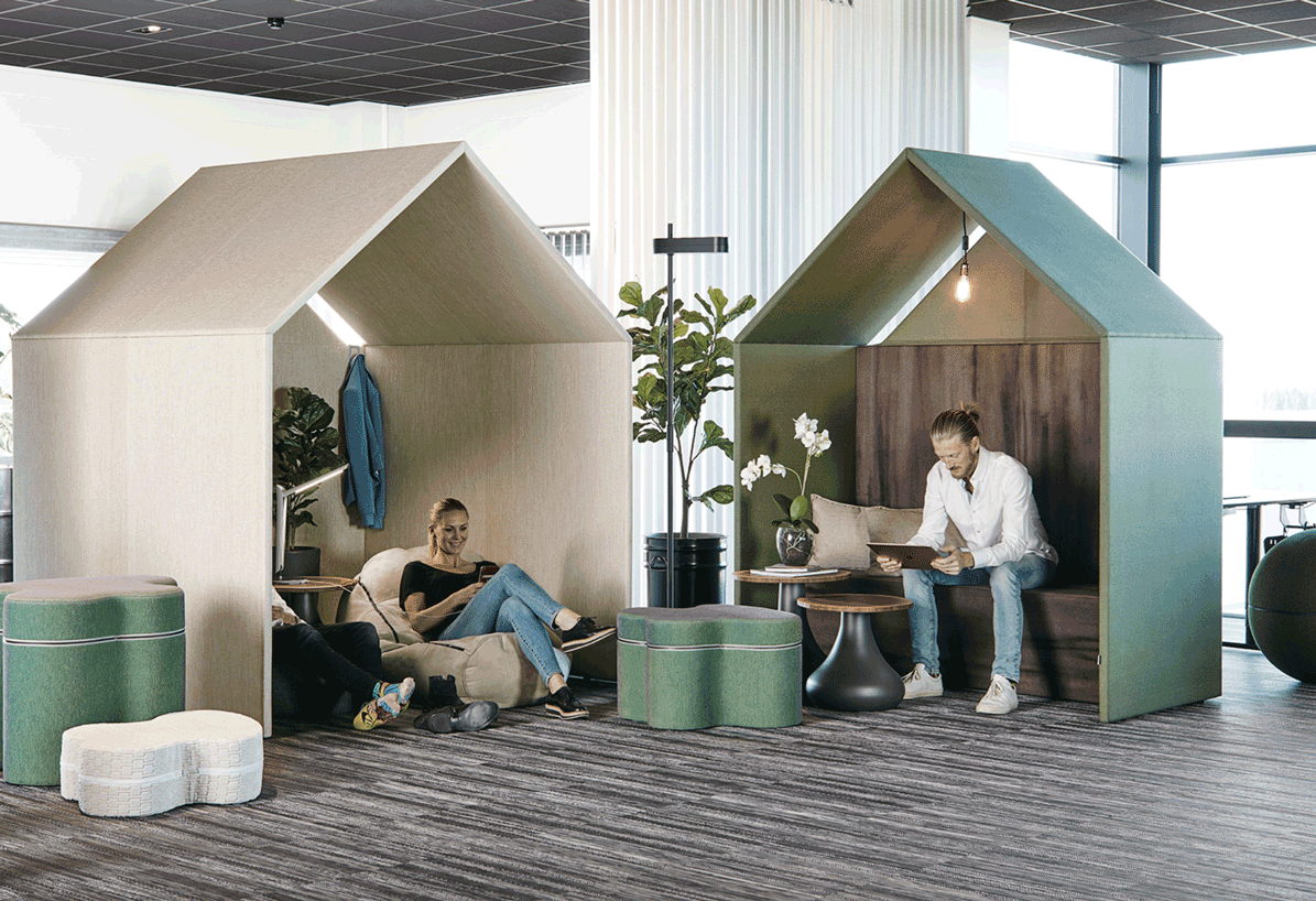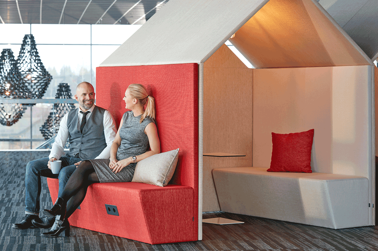 Husets enkle og rette linjer, er inspirert av det klassiske spillet Monopol og gir en tidløs form til det populære og praktiske rom-i-rom konseptet. Ved plassering på rekke kan huset brukes i flere formål, som en individuell arbeidsplass, et lite sitte-og-stå møterom eller et avslappings sted sammen med The Hut Sofa. Kan leveres med tilbehør som kabelkanal og lampe.