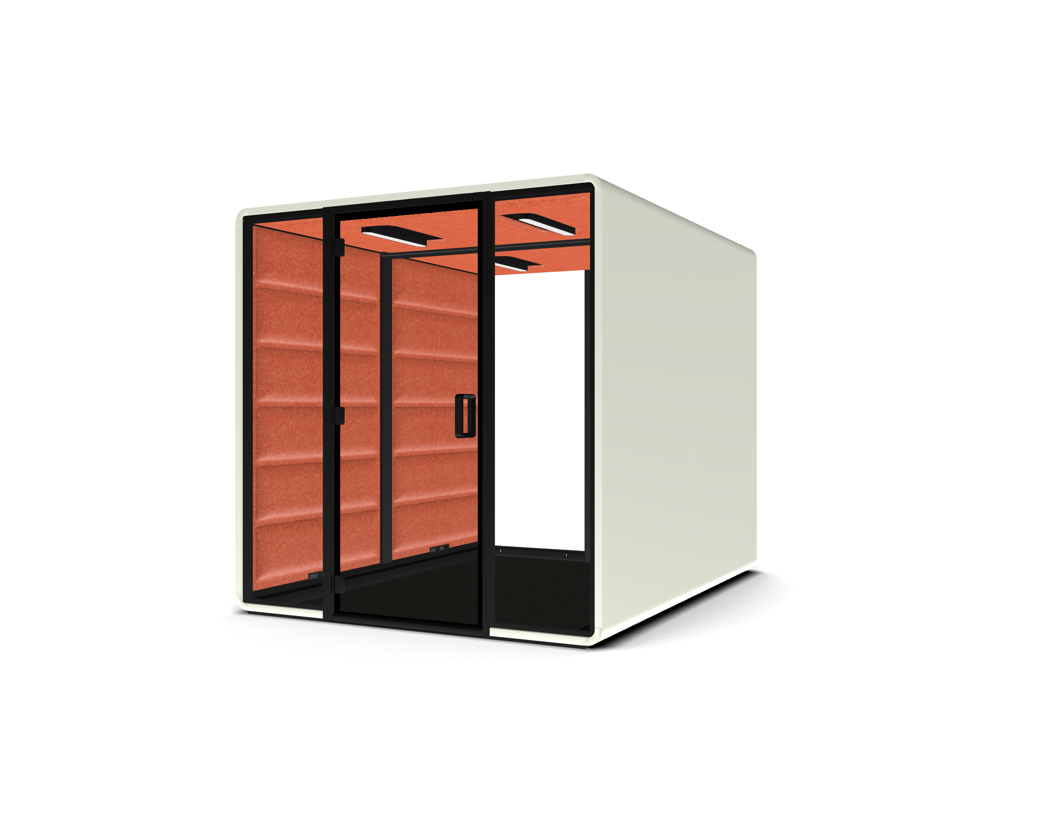 HushFree L Access er en større akustisk pod med universell utforming, som gir enkel tilgang for alle brukere, inkludert de med bevegelsesutfordringer. Den romslige designen gir god plass til samarbeid og kreativt arbeid. HushFree L Access kan utstyres med et stort skrivebord som tilvalg, og LED-belysningen gir utmerket arbeidslys, noe som sikrer at du kan jobbe effektivt og komfortabelt. Poden er klassifisert som ISO 23351 Klasse B, som gir god lydisolasjon og integritet. Sofaer og bord er tilvalg