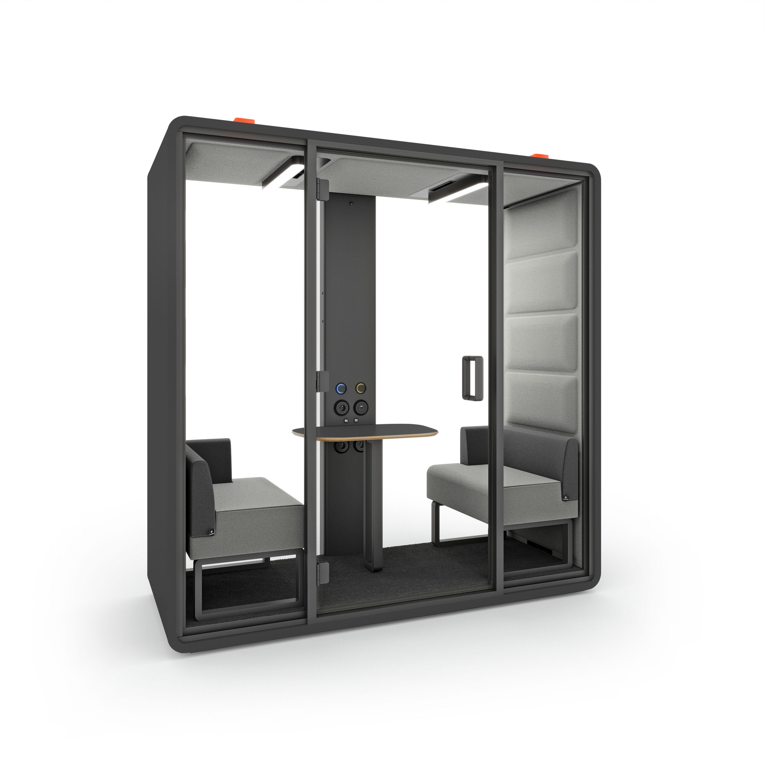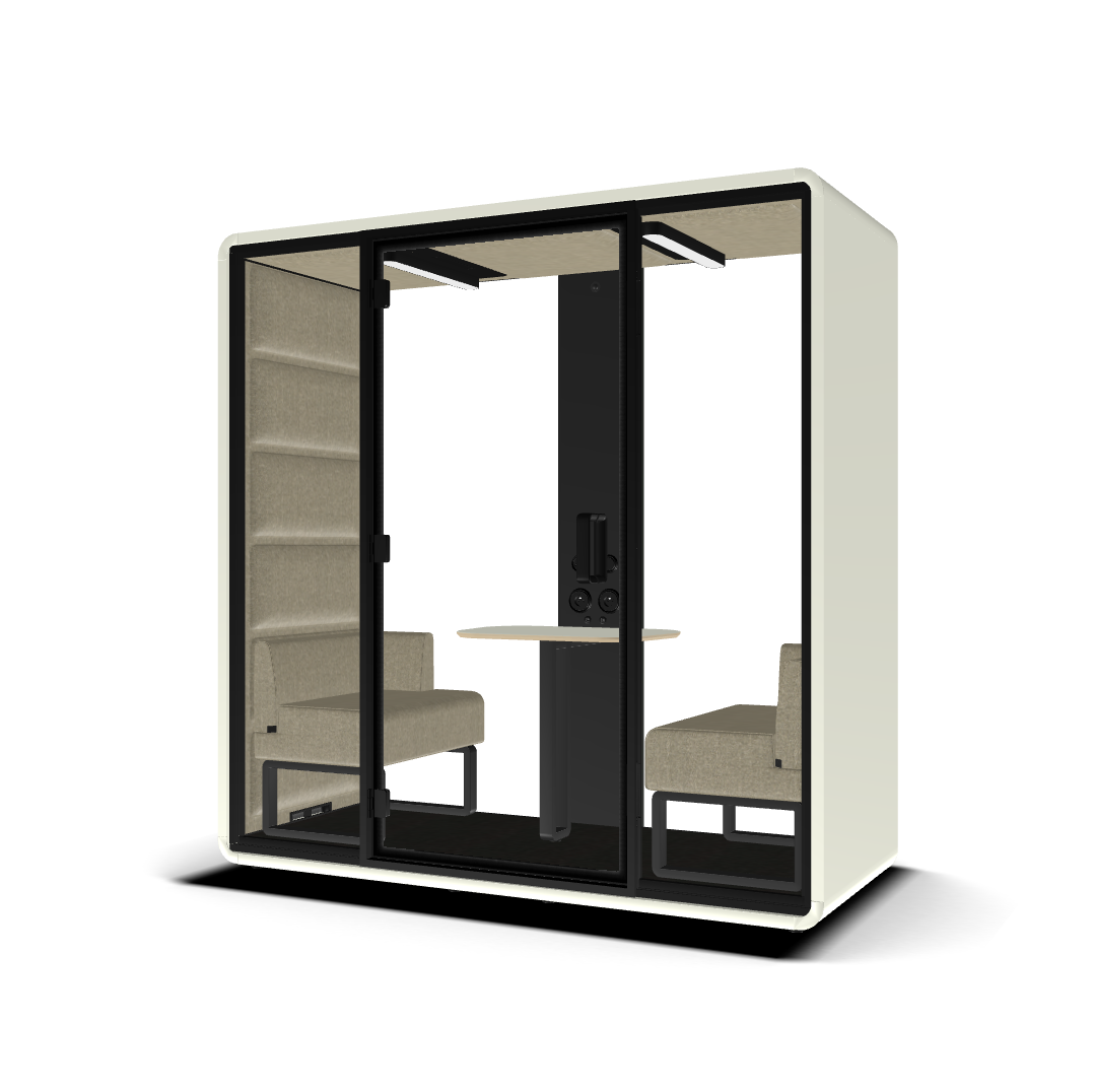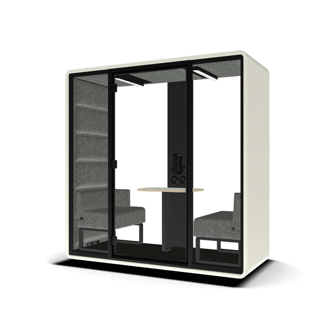 HushFree.XM er en akustisk pod designet for tomannsmøter, som takket være sin kompakte størrelse også passer godt inn i mindre kontorlokaler. Den er ideell for intime møter og ansikt-til-ansikt samtaler. HushFree.XM har et belysningssystem med en intensitet på 500 lux på bordnivå, som gir utmerket arbeidslys og sikrer at du kan jobbe effektivt og komfortabelt. Den er også utmerket for konseptuelt arbeid. Poden er klassifisert som ISO 23351 Klasse B, som gir den høy grad av lydisolasjon og integritet. Sofaer og bord er tilvalg.