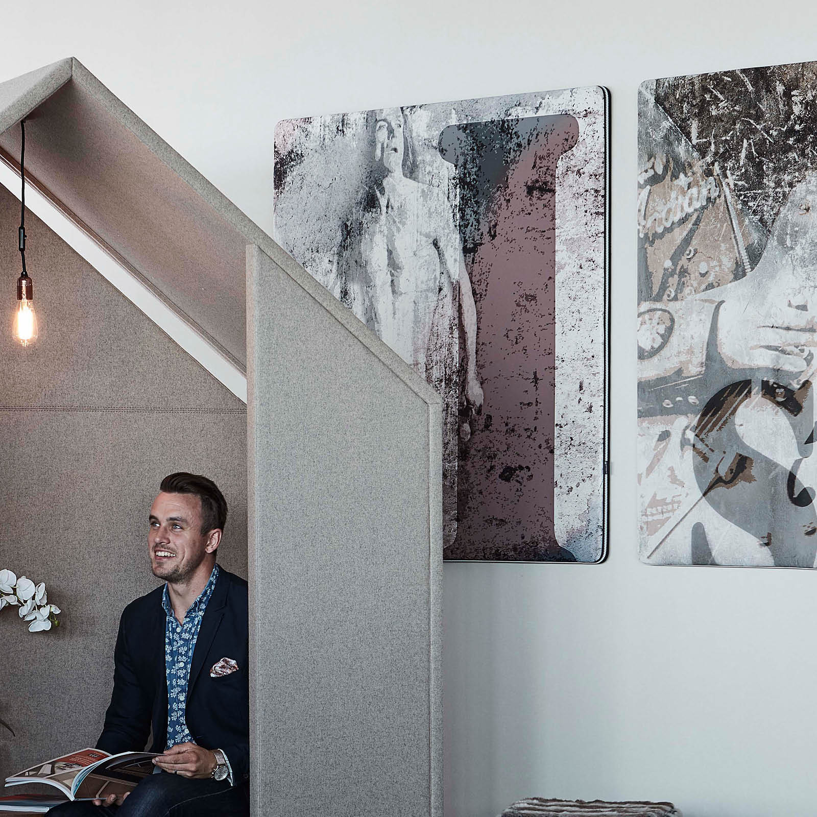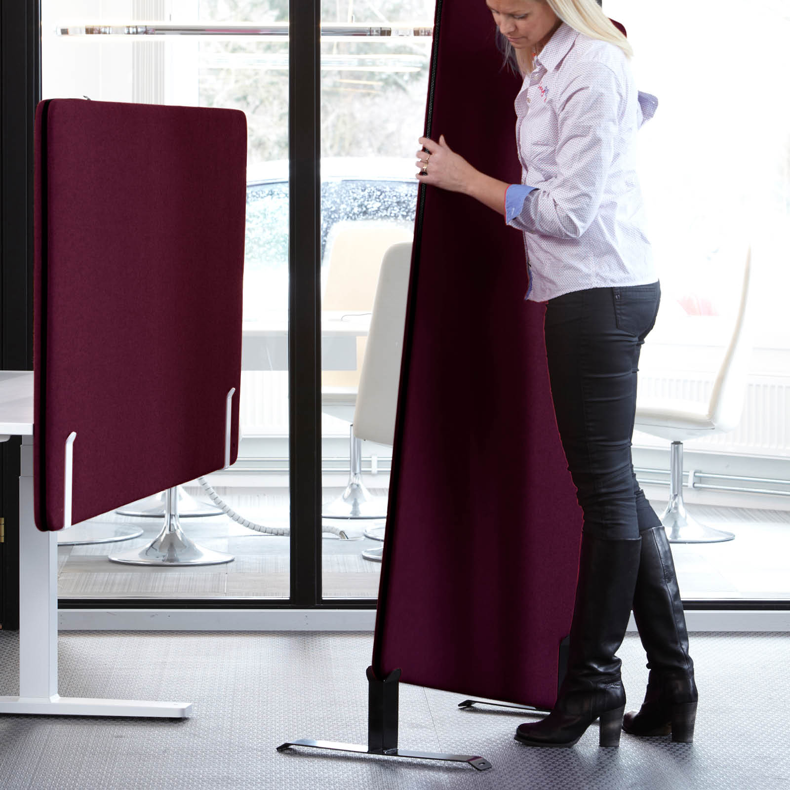 En lydabsorberende skjerm som kan brukes som gulvskjerm, bordskjerm eller veggabsorbent. Velg stoff og glidelås eller søm fra vårt brede produktsortiment.