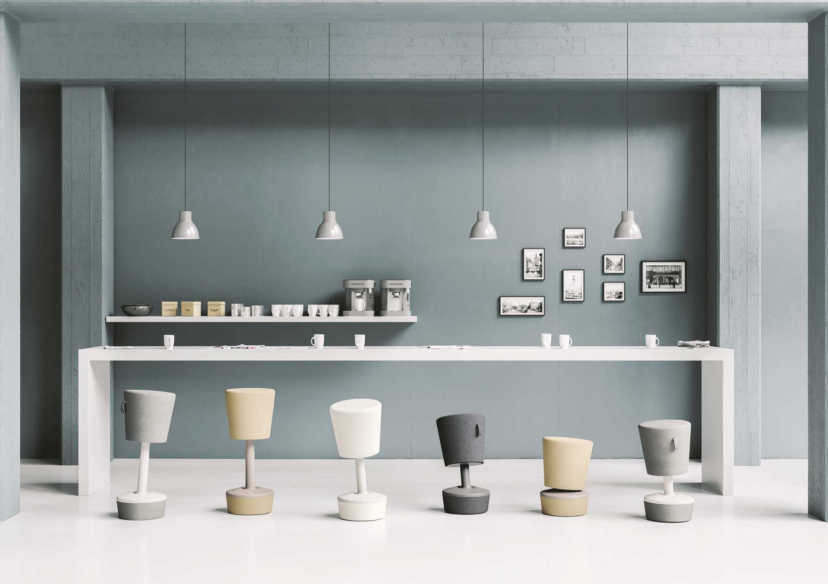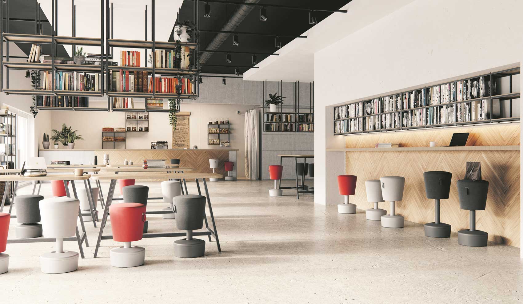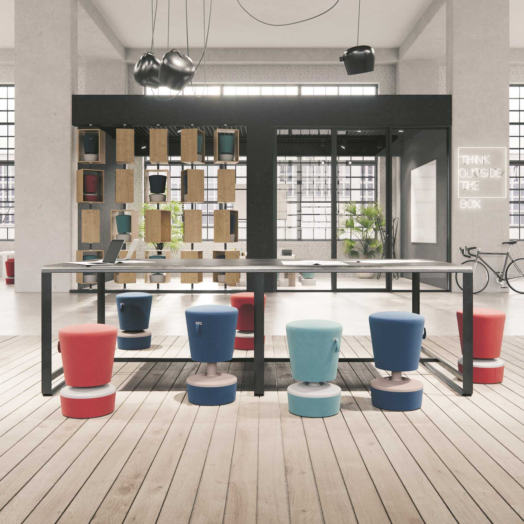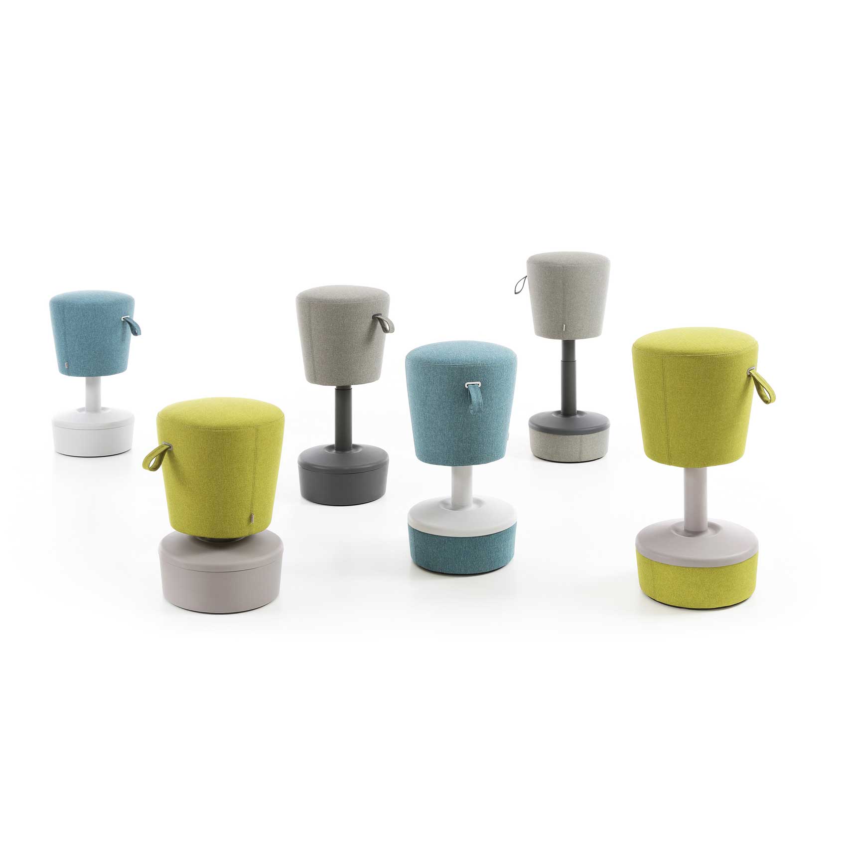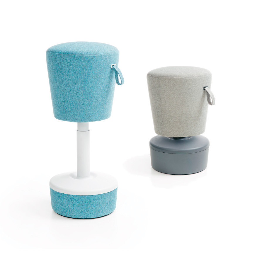 En stol/pall med et lekent uttrykk. Formen oppfordrer til bevegelse og variasjon, og den kan benyttes i mange ulike arealer.