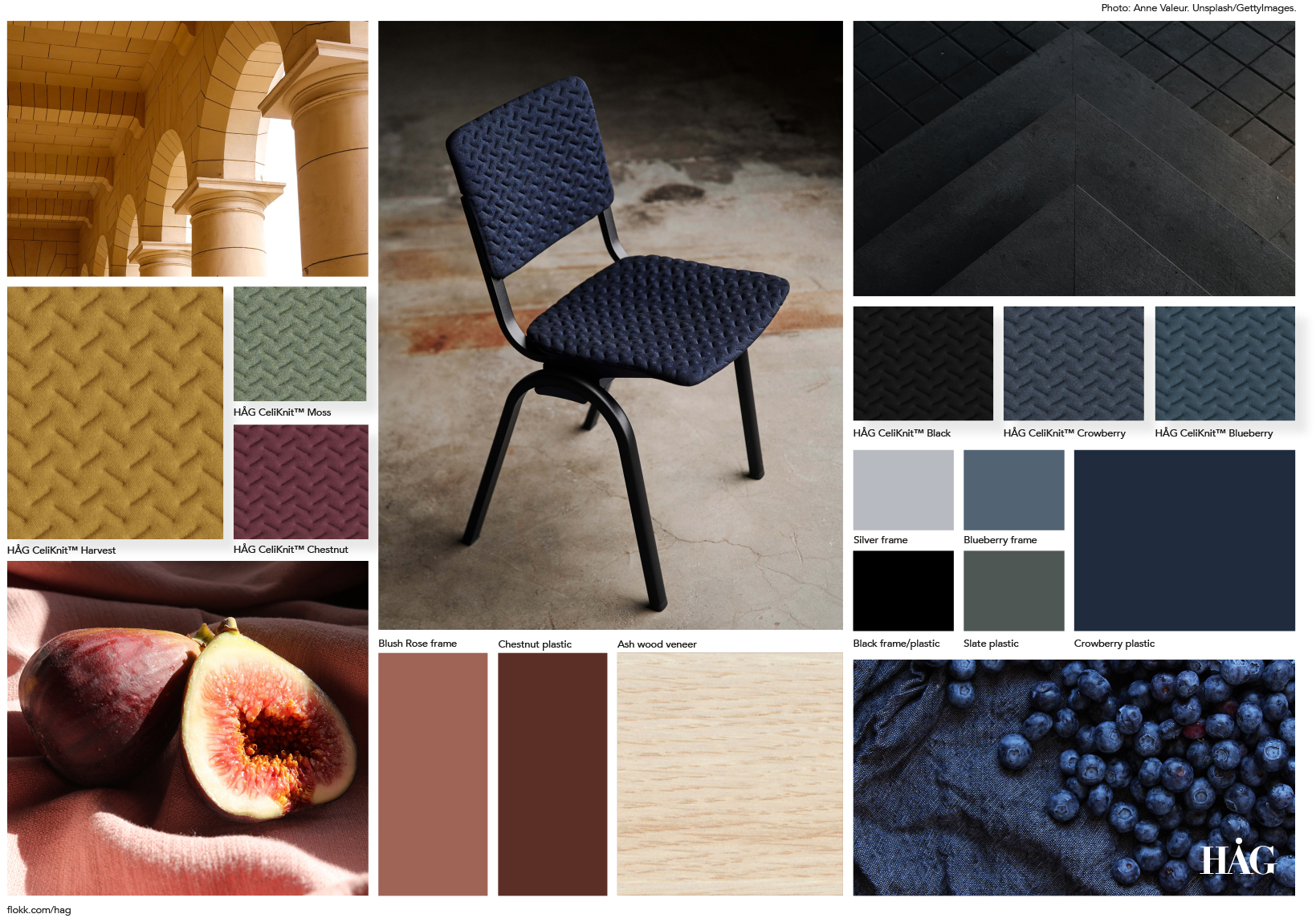 Tekstil CeliKnit: Black, crowberry, blueberry, moss, harvest og chestnut.