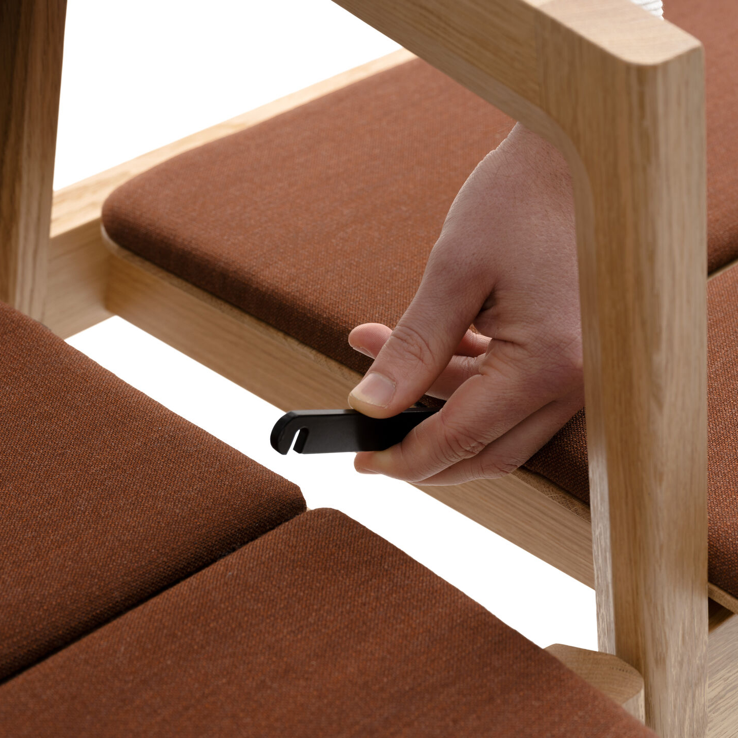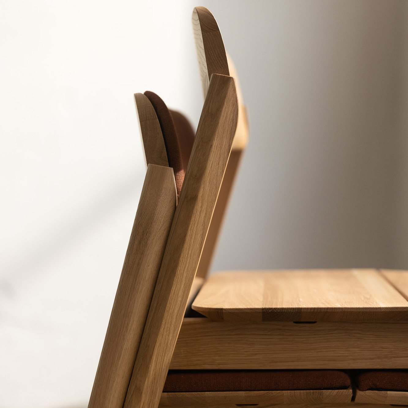 Knekk er ikke prangende i sin form, men vennlig og imøtekommende i sin funksjon. Den skaper automatisk en sittestilling som gjør at du lener deg mot bordet for diskusjon eller et måltid, uten å måtte sette deg frem på stolen.