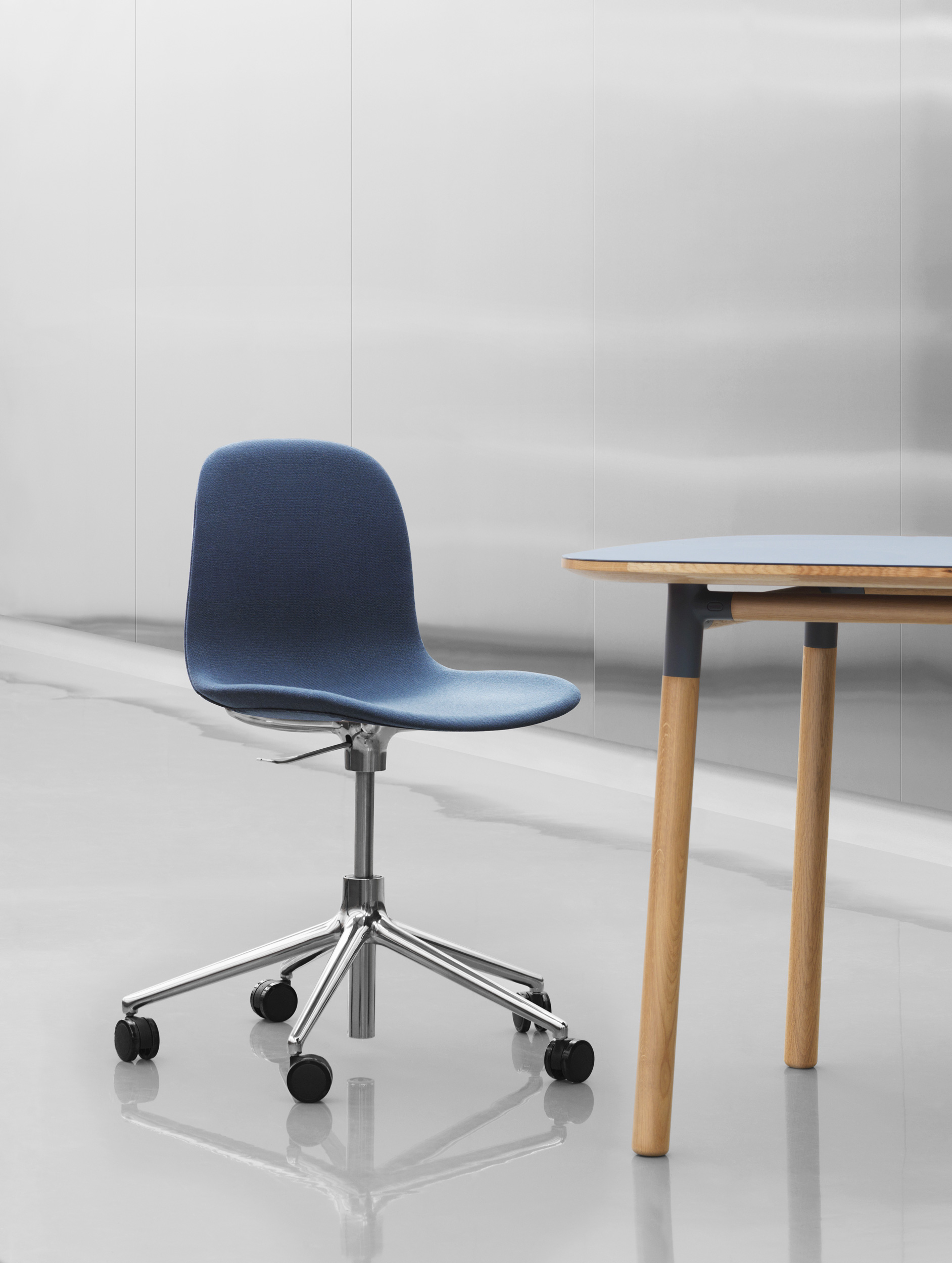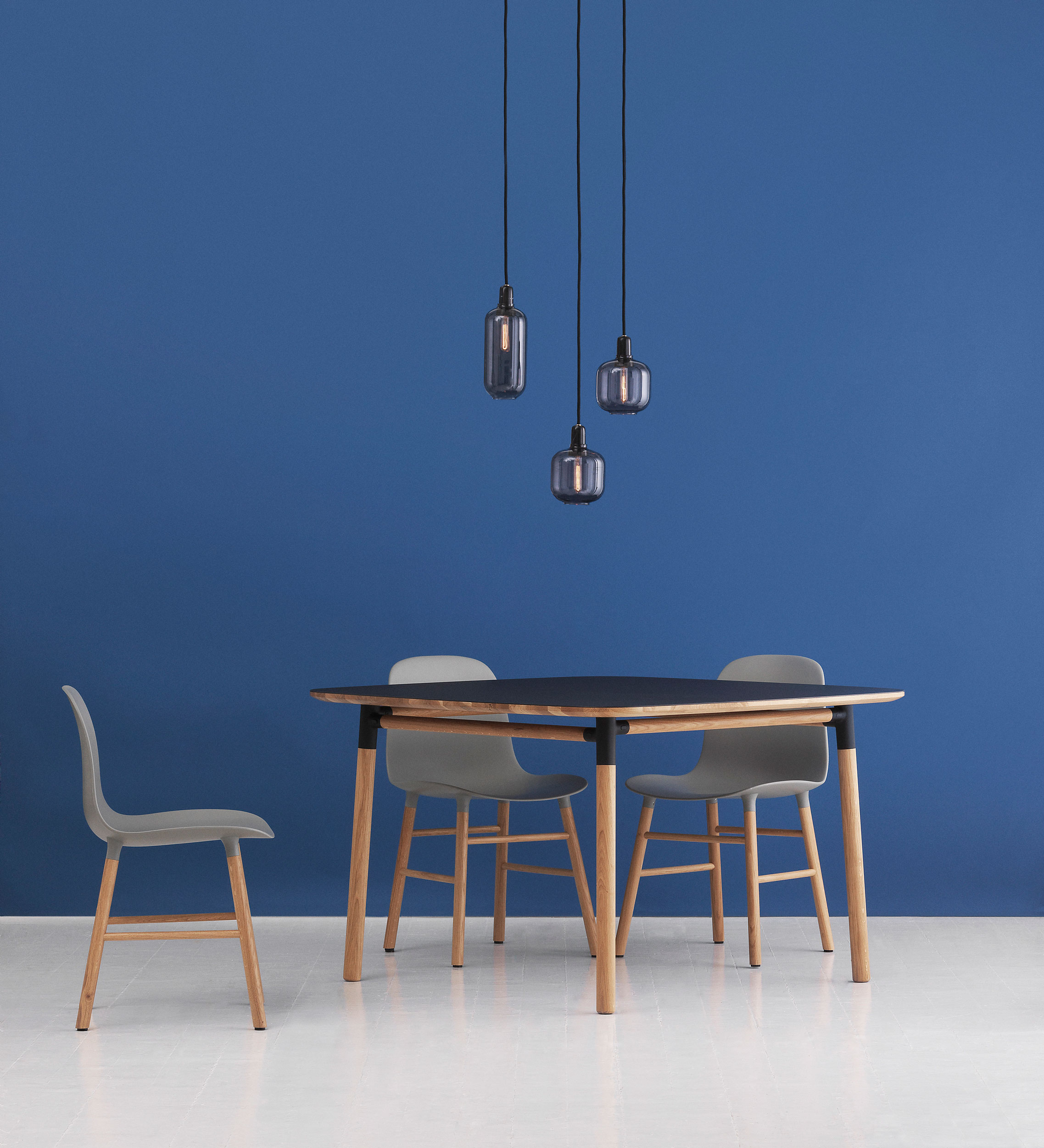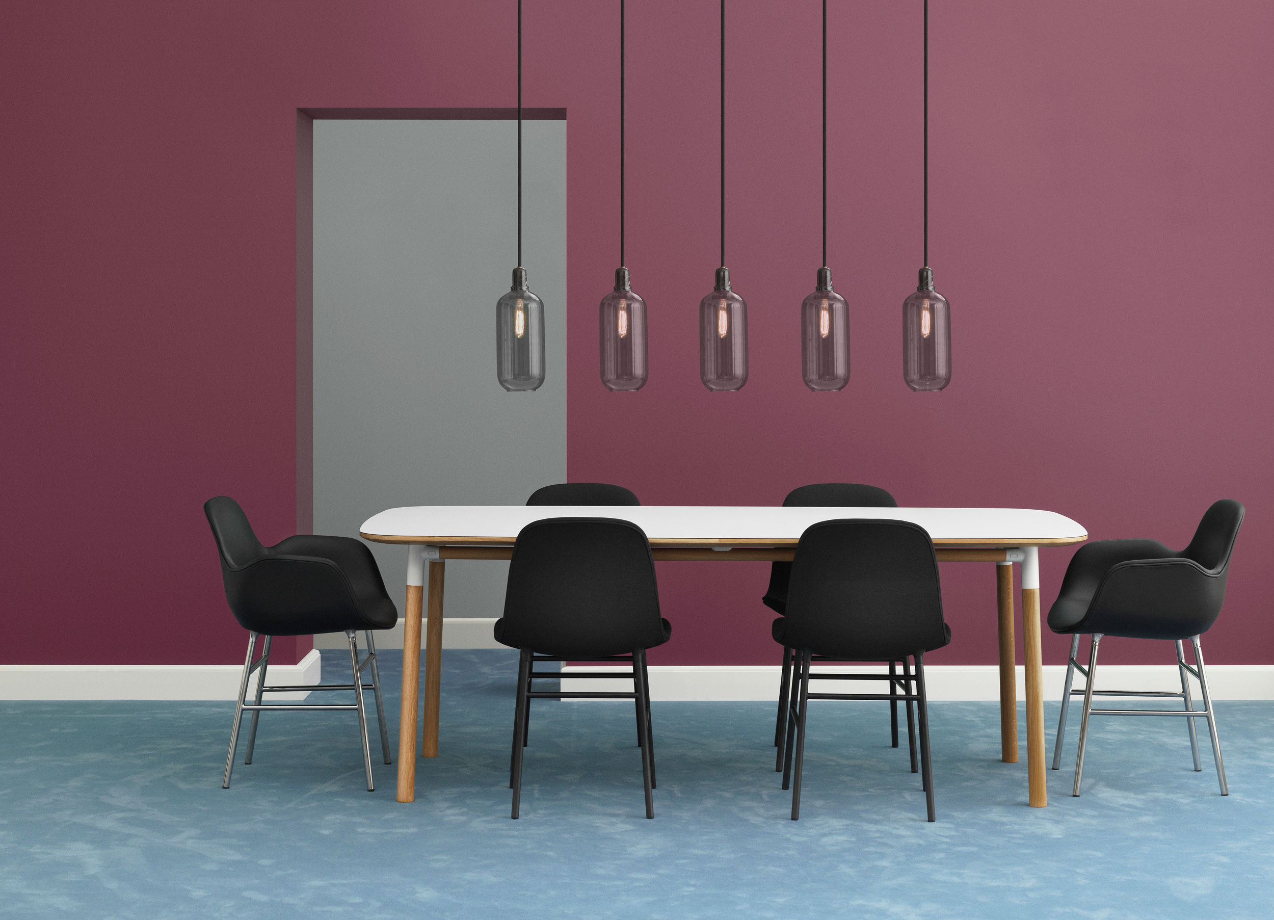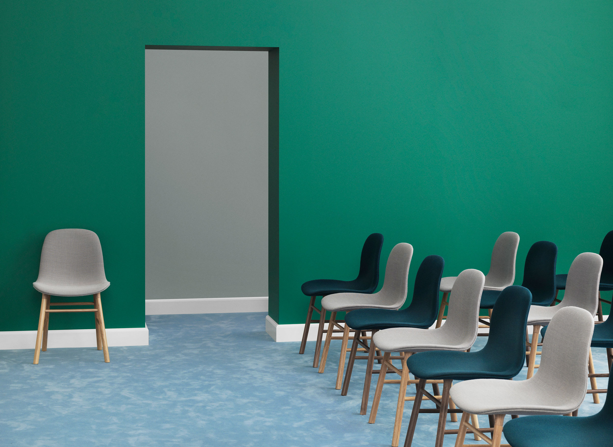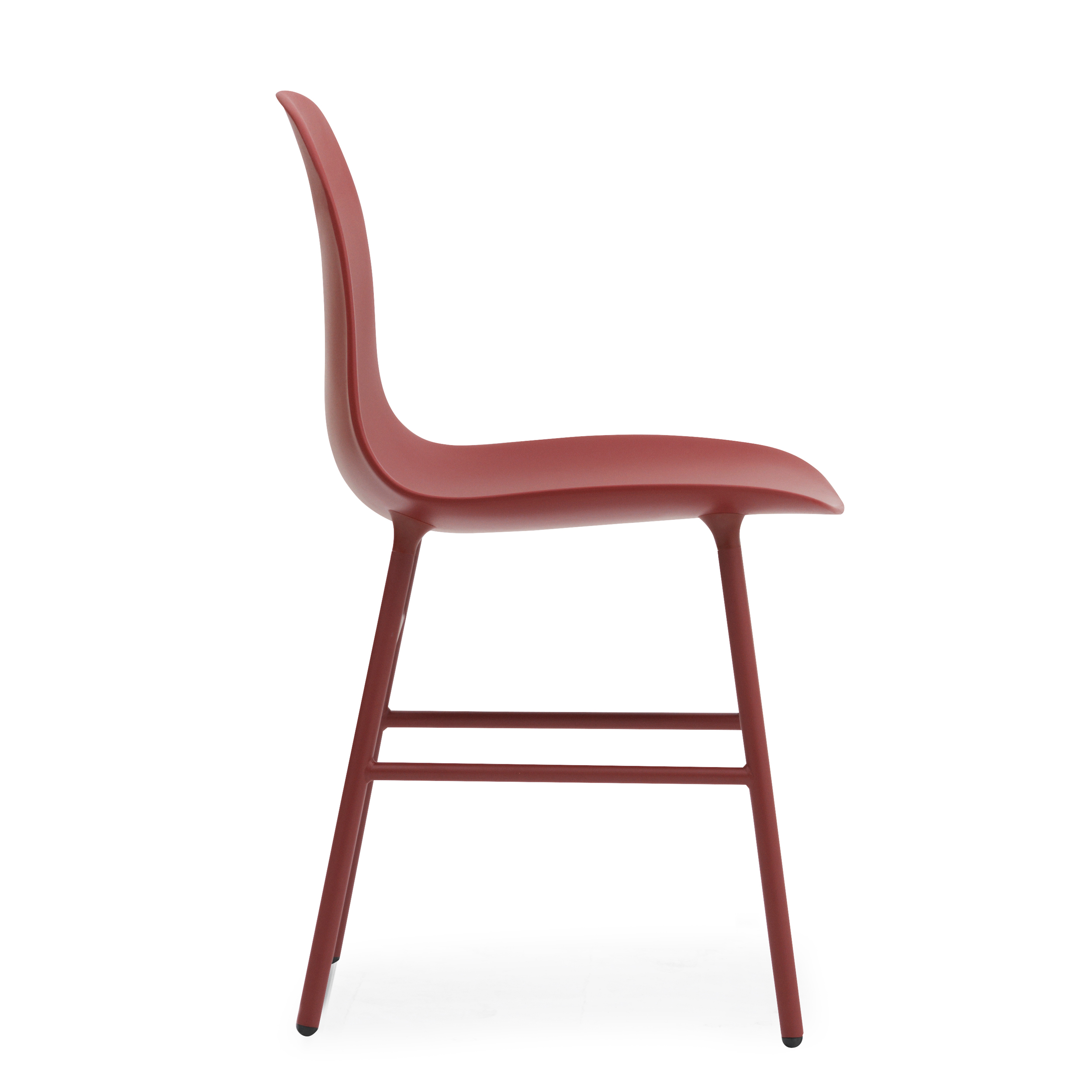 Form stol. Sete i plast tilgjengelig i fargene hvit, sort, grå, blå, grønn eller rød. Ben fås i lakkert eik, lakkert valnøtt eller stålben i samme farge som sete. Form fås også fullpolstret i utvalgte tekstil- og hudkvaliteter.