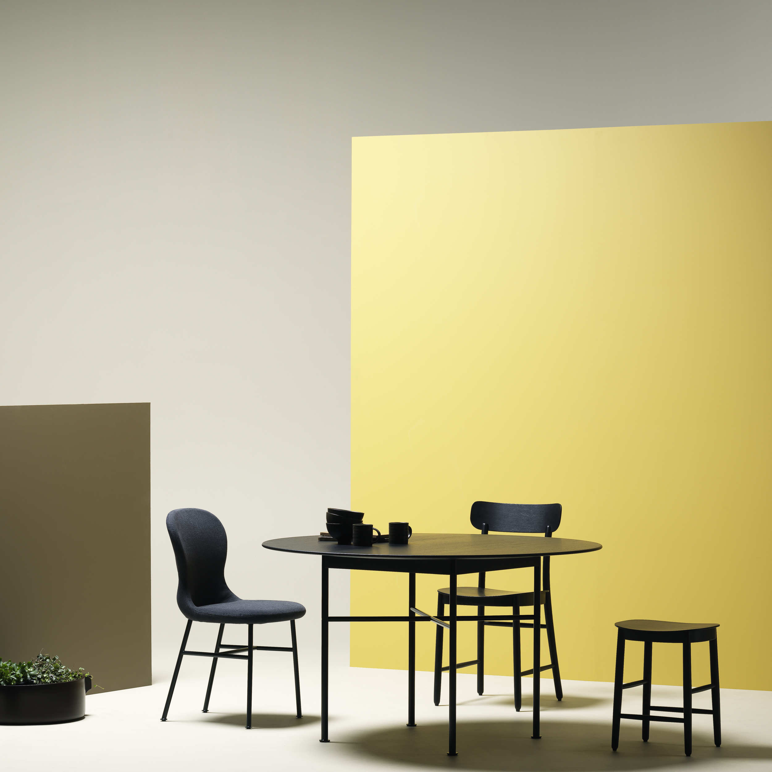 Materialer i formskåret kallskum, med ben i metall eller tre.  Velg mellom polstring i lær, stoff eller en kombinasjon. Ben lakkert i 5 standard RAL-farger. Understell i eik kan beises i 7 standarfarger.