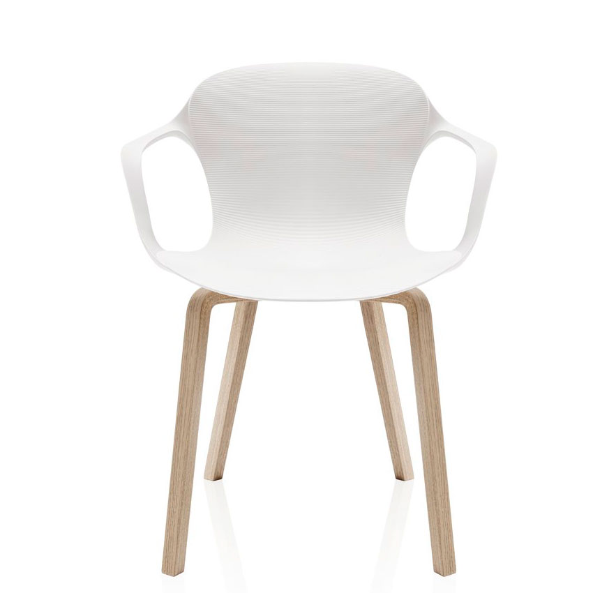 NAP™, designet av Kasper Salto, fås i mange varianter: med 4 ben (av stål eller tre), meier og som lav eller høy barstol, alle finnes med eller uten armlener. Skallens rygg har en høyglans overflate og fronten er matt med riller som fremhever stolens geometri. Velg mellom fargene Milky White og Pepper Grey. Understellet fås i forkrommet stål eller pulverlakkert i farger som matcher stolens skall. Trebena er i naturlig eikefinér. Stolen fås med tilbehør som setepolstring i stoff, rekkekobling og transportvogn. Sittehøyden er standard 45 cm, men er også tilgjengelig i 47,5 cm.