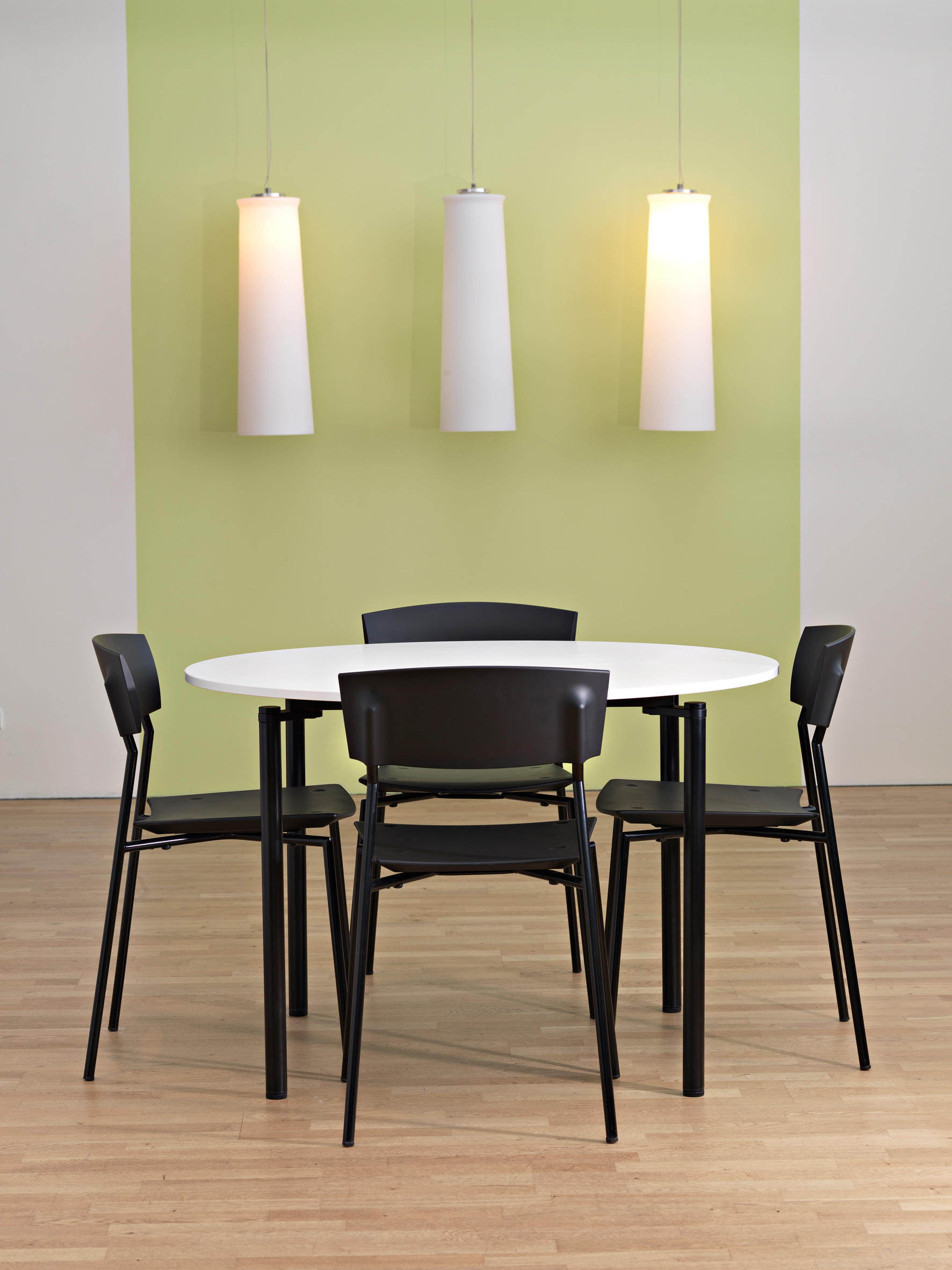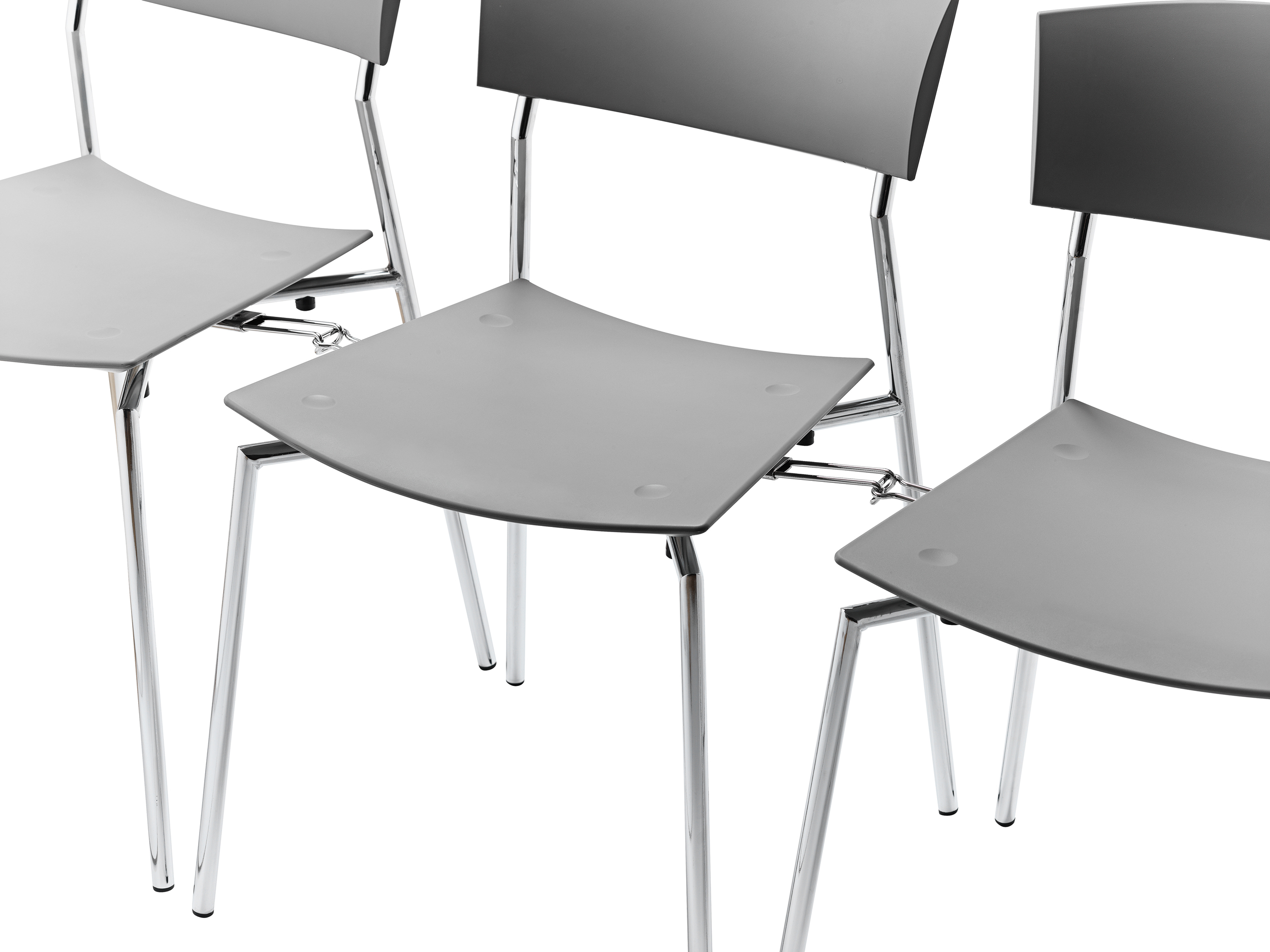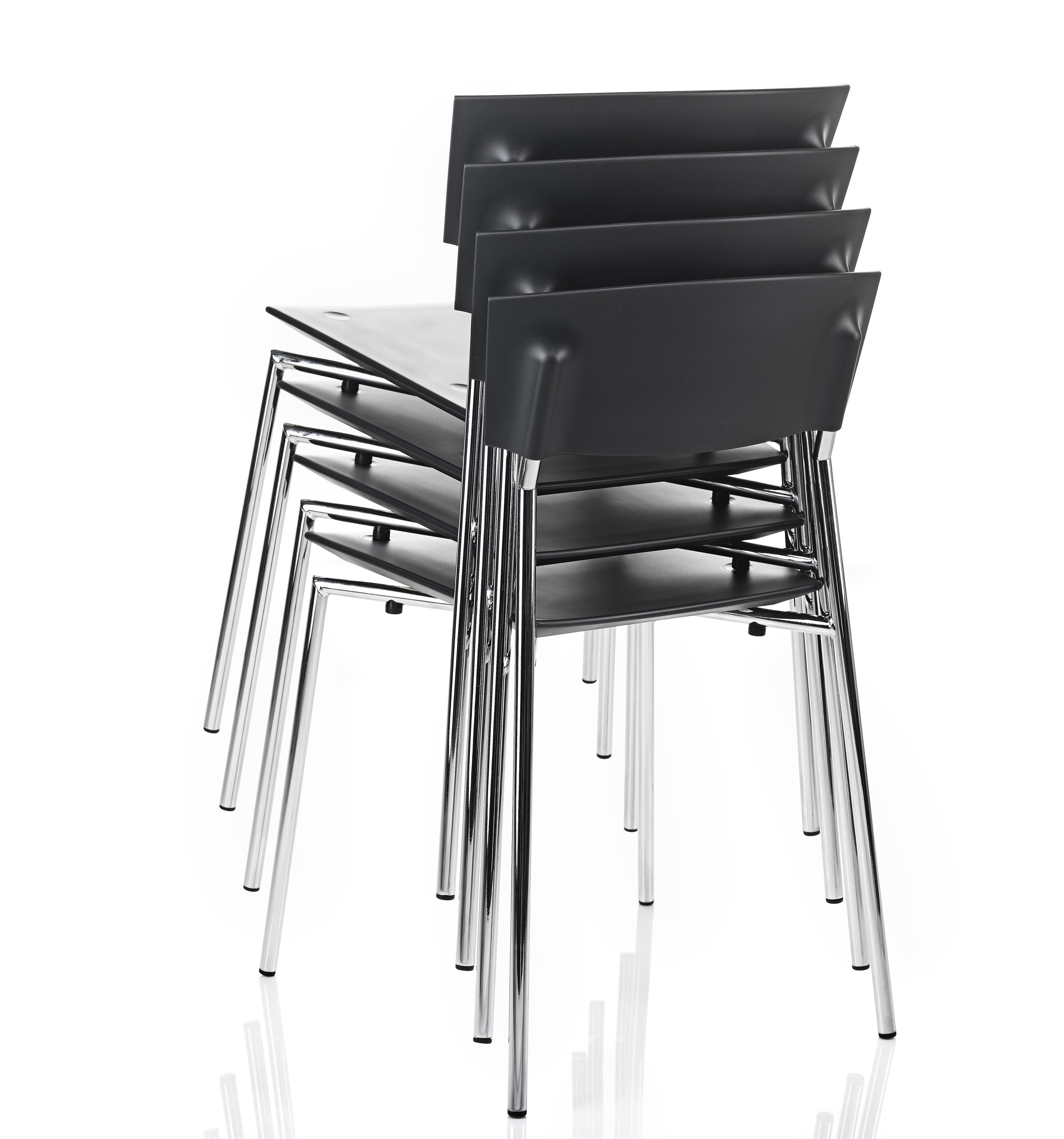 Pure: Understellet består av helsveist rør i 19mm, og fås lakkert i matchende farger som skallet samt i krom og satin. Stoloppheng for plassering under bord leveres som tilleggsutstyr. PURE stolen stabler 8 stk på gulv, 10 stk i vogn, som er tilbehør. PURE stolen kan leveres med filt knotter som tillegg