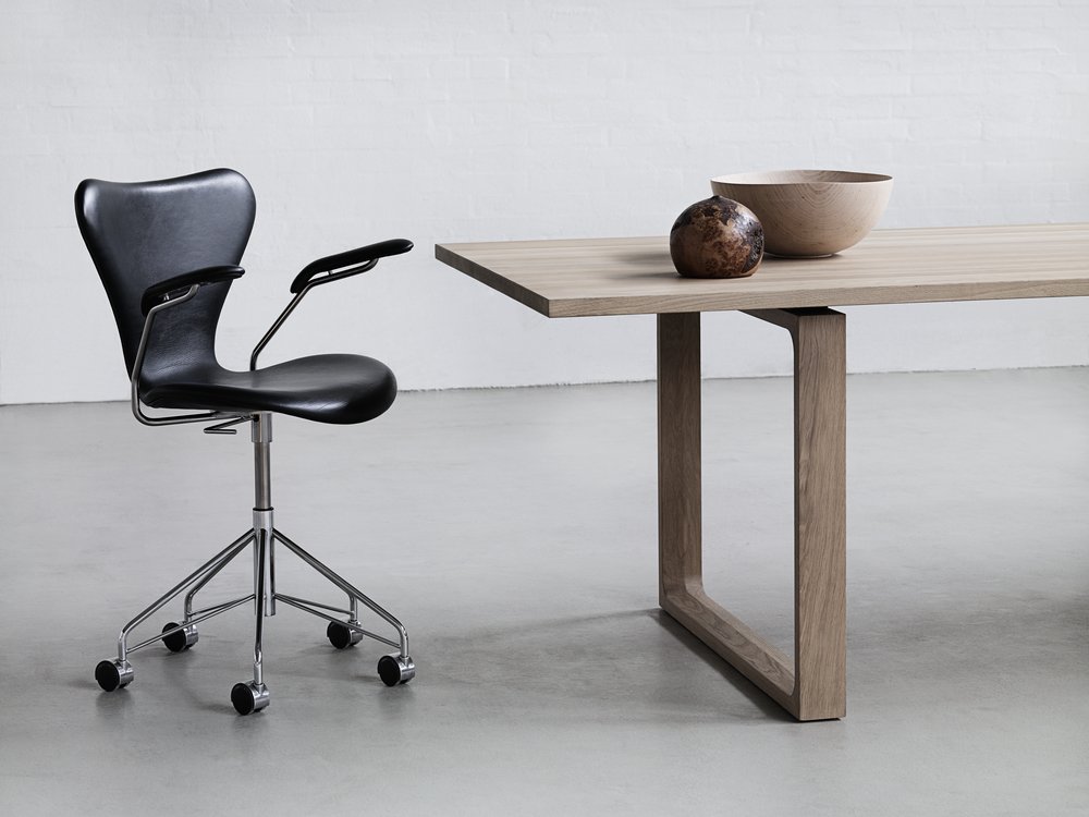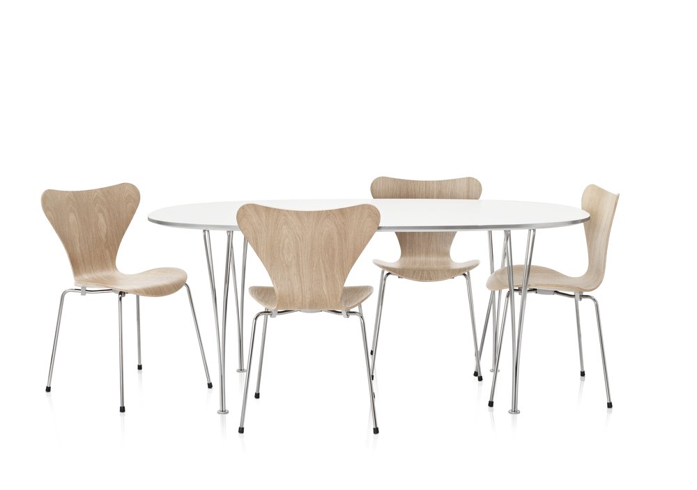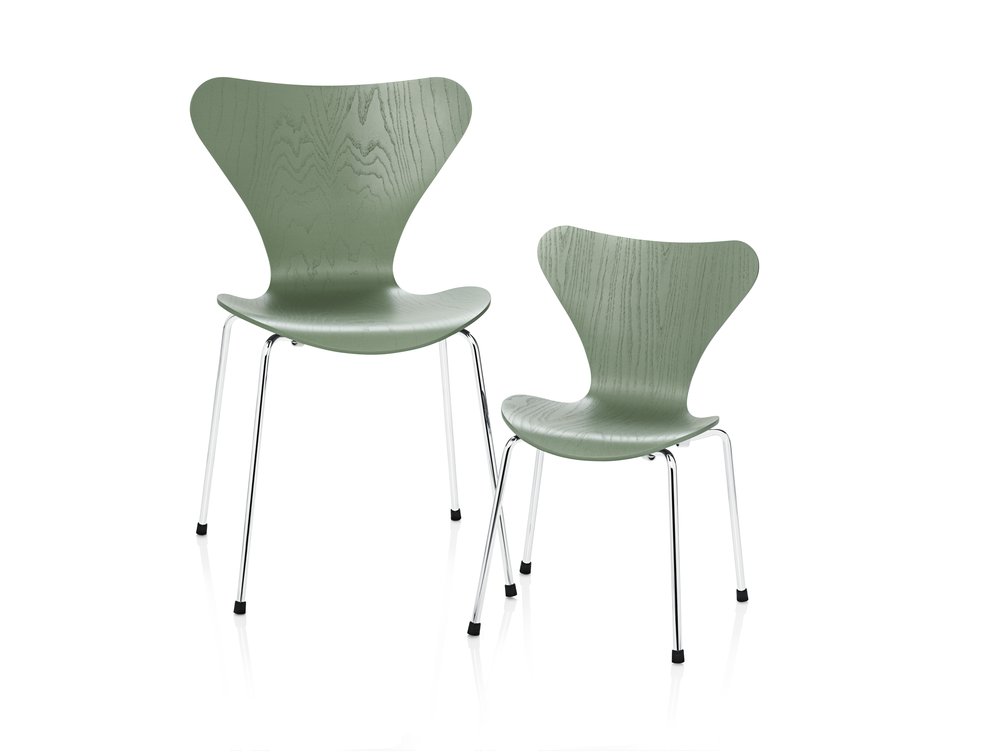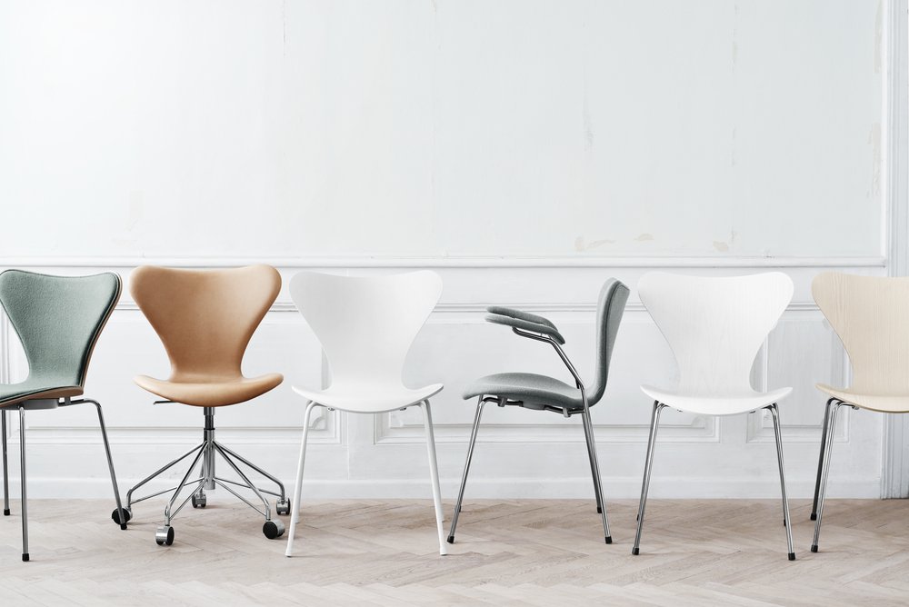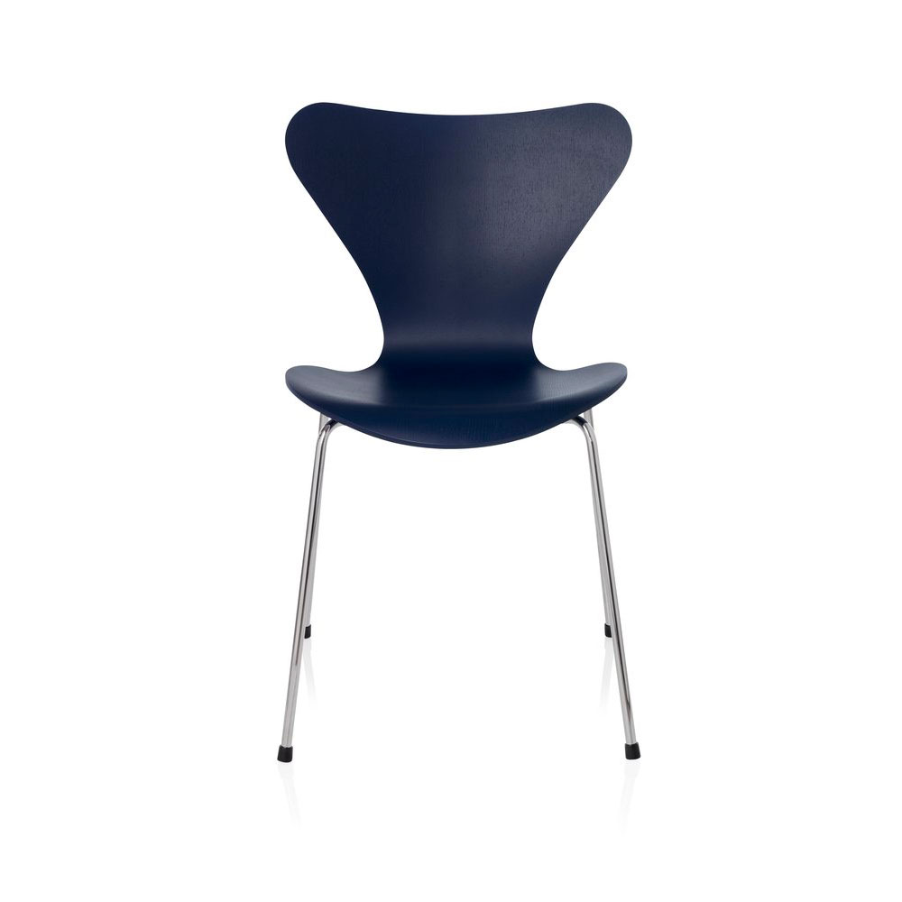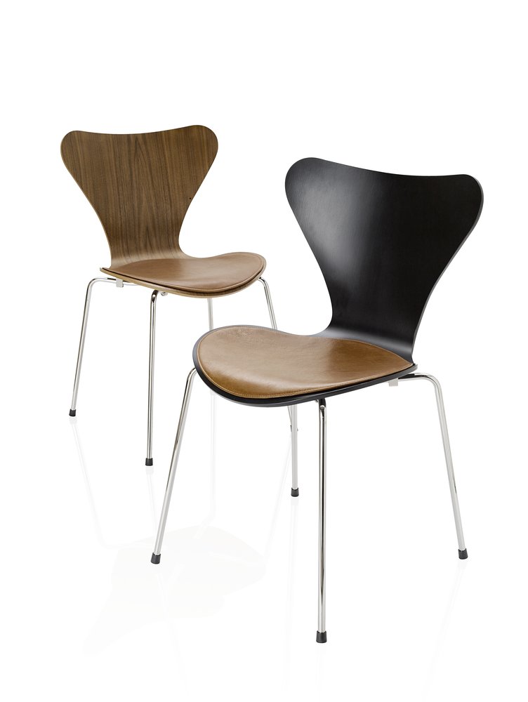 Arne Jacobsen designet Serie 7™ i 1955. Stolen fås i ti forskellige typer finér: ahorn, bøk, ask, kirsebær, oregon furu, elm, eik, valnøtt, innfarget eik og fullt innfarget eik, alle med klar lakk, samt i farget ask og lakk i 12 forskjellige farger. Stolen er laget av formpresset, knivskåret finér. Forsidepolstring og fullpolstring fås i et stort utvalg av tekstil og skinn kvaliteter. Understellet fås i fire forskjellige utgaver: 4 ben (stabelbar), høydejusterbart hjulkryss og som høy og lav barstol. Understellet er laget av forkrommet stål. Understell med 4 ben leveres med 3 standard sittehøyder 44, 46,5 og 48,5 cm. Modellen 3107 fås dessuten i en monokrom versjon med ben pulverlakkert i farger som matcher stolens skall. Fås med tilbehør som koblingsbeslag, skriveplate, deksel for stabling av polstrede stoler, transportvogn og seteputer.