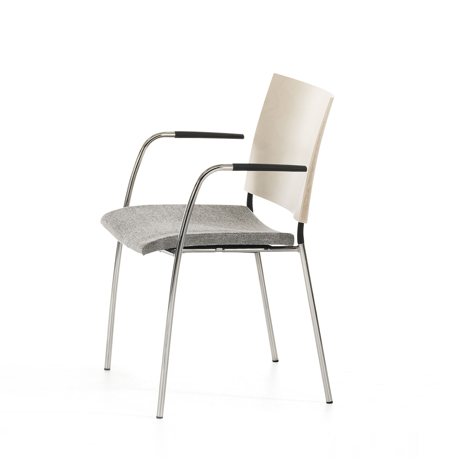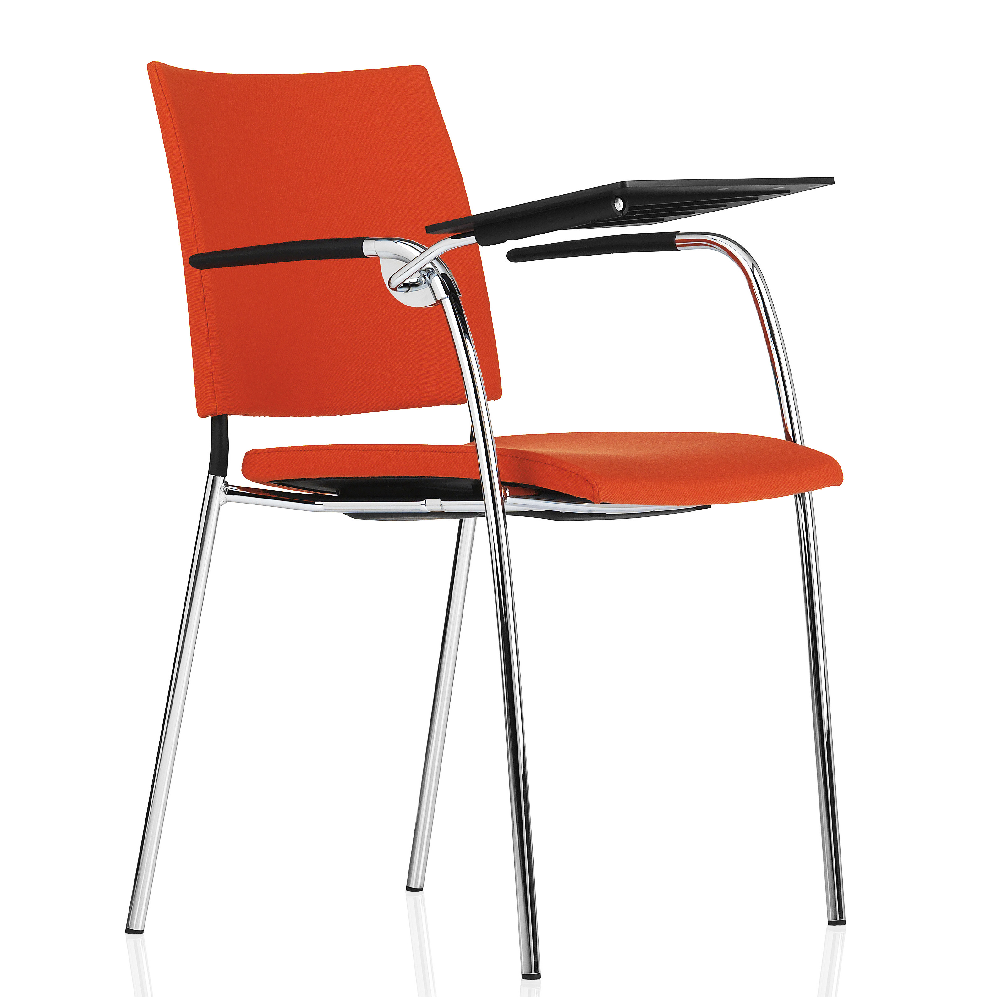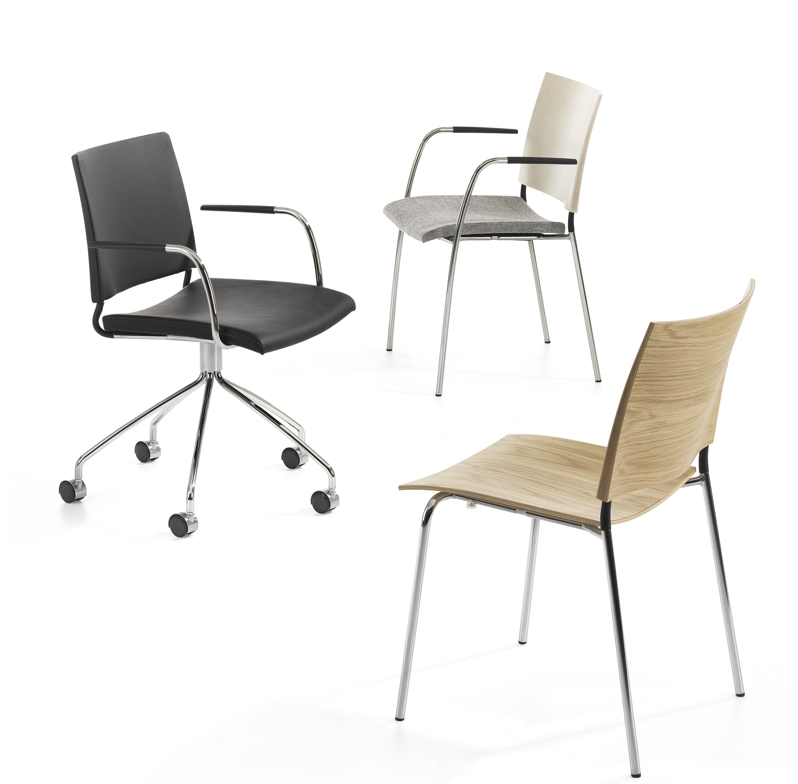 På kledd modell har stolen stabelbeskytter. Opsjon med koblingsbeslag og skrive-/laptopskive for feste på høyre eller venstre side. Stolen leveres med 4 ben med eller uten lener, 4-fot kryss m/glidefot og armlener og 5-fot kryss med hjul og armlener.