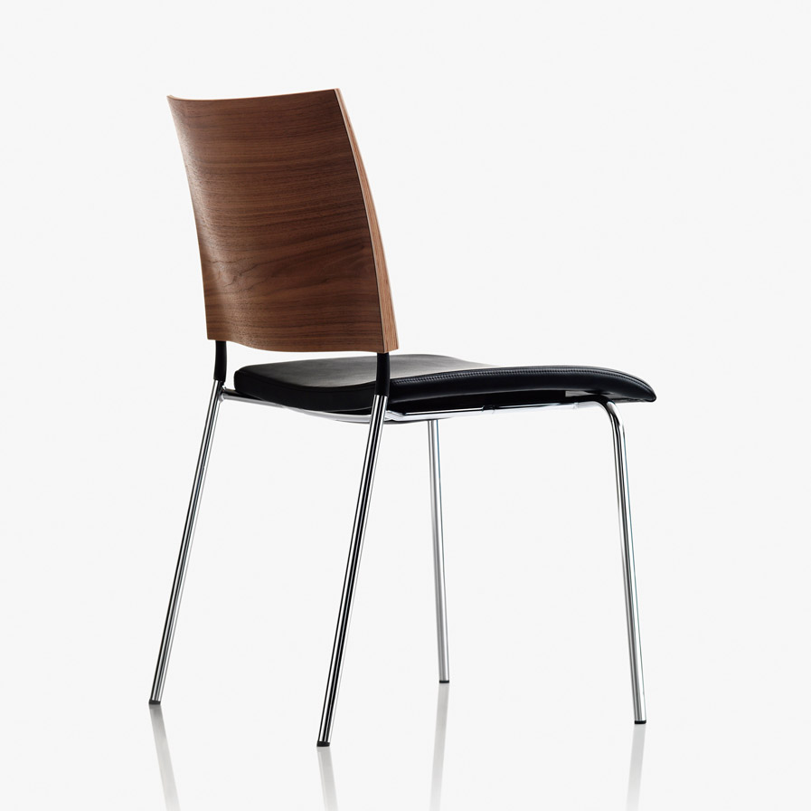 Ben/stativ i Ø18 mm lakkert eller forkrommet stålrør. Fjærstål i overgang sete/rygg. Sete og rygg i bjørk, bøk, eik eller valnøtt, alt. beiset. Alternativ kledd sete eller kledd sete og rygg.