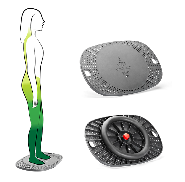 På Back App 360 står du og balanserer behagelig i alle retninger. Dette gir utfordring til muskler og ledd spesielt i ankel, legg, kne og hofte og gir treningseffekt hele veien opp til rygg og nakke. Back App 360 stimulerer blodsirkulasjonen i bena, spesielt i leggene. Back App 360 forebygger skader i ankler, knær og hofter. Ved å skru den røde knotten opp eller ned kan du enkelt justere nivået på vippebevegelsen. Den myke ringformede dempeanordningen gjør vippebevegelsen behagelig for alle brukere.
