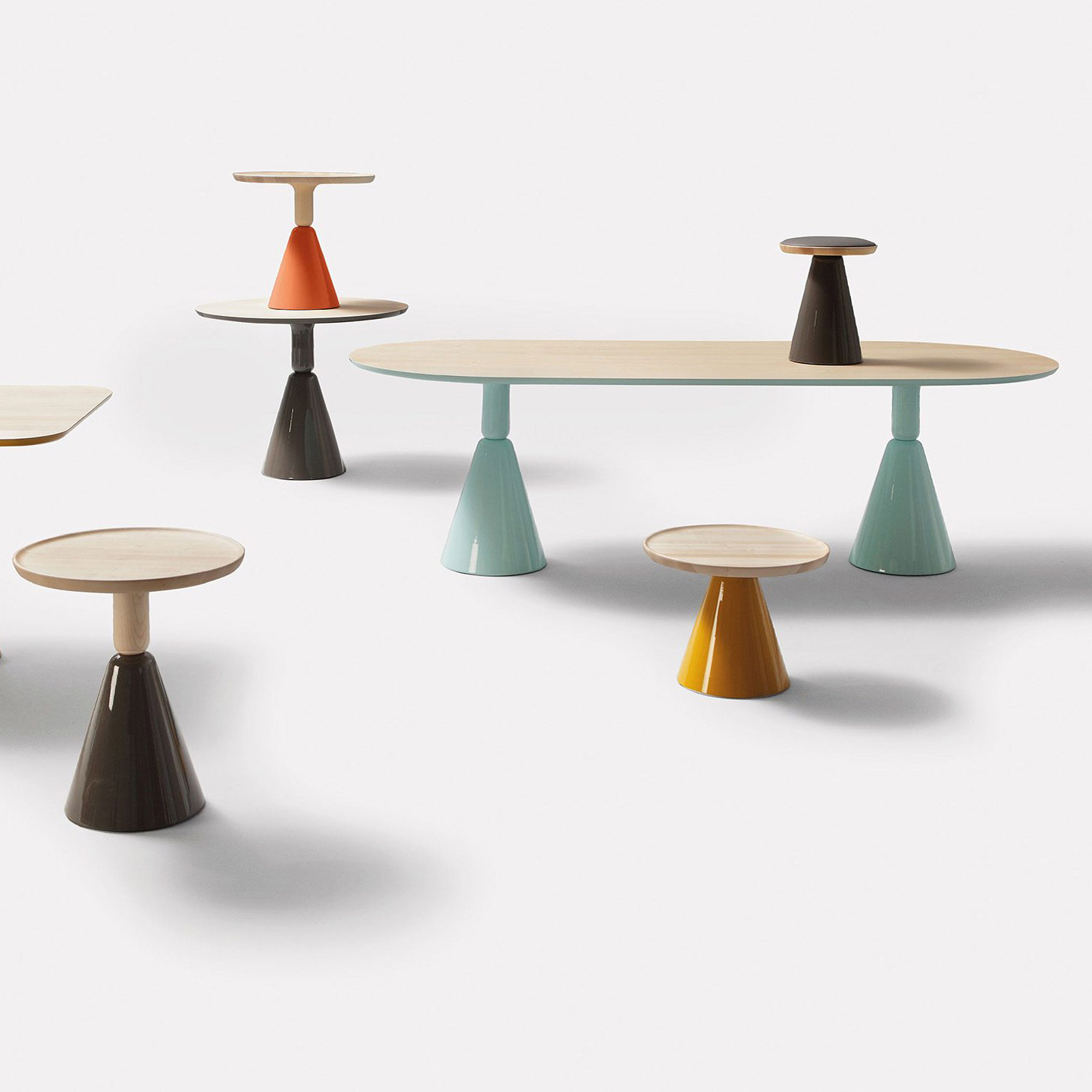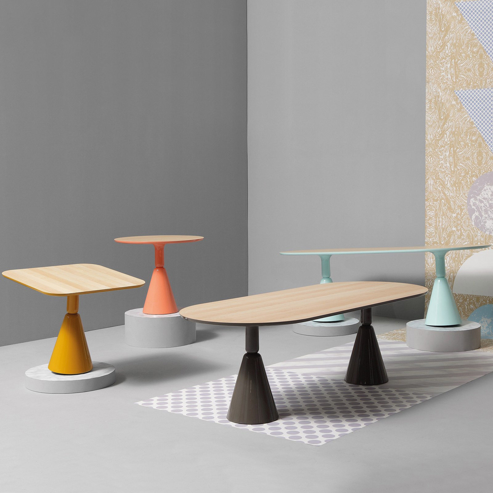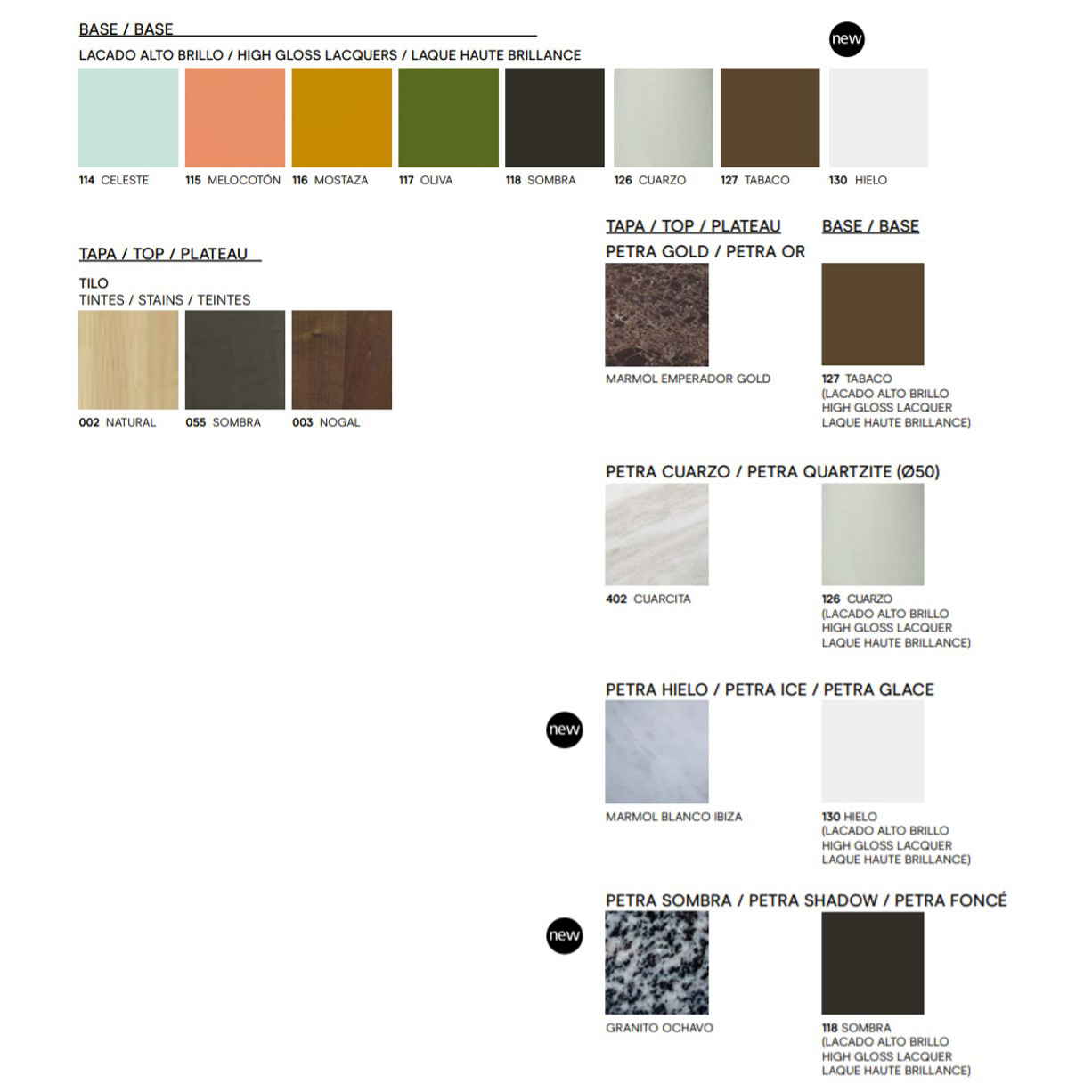 Pion serien har også en rekke bord som lar deg leke med materialkontraster. High-gloss base kan kombineres med granitt eller marmorplate, tre eller lær.