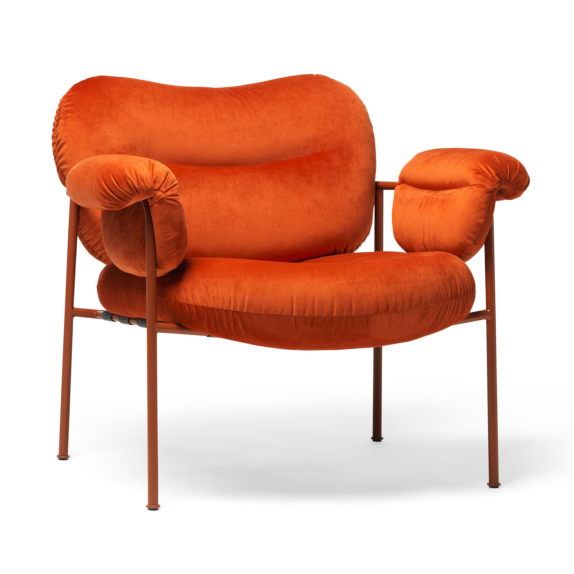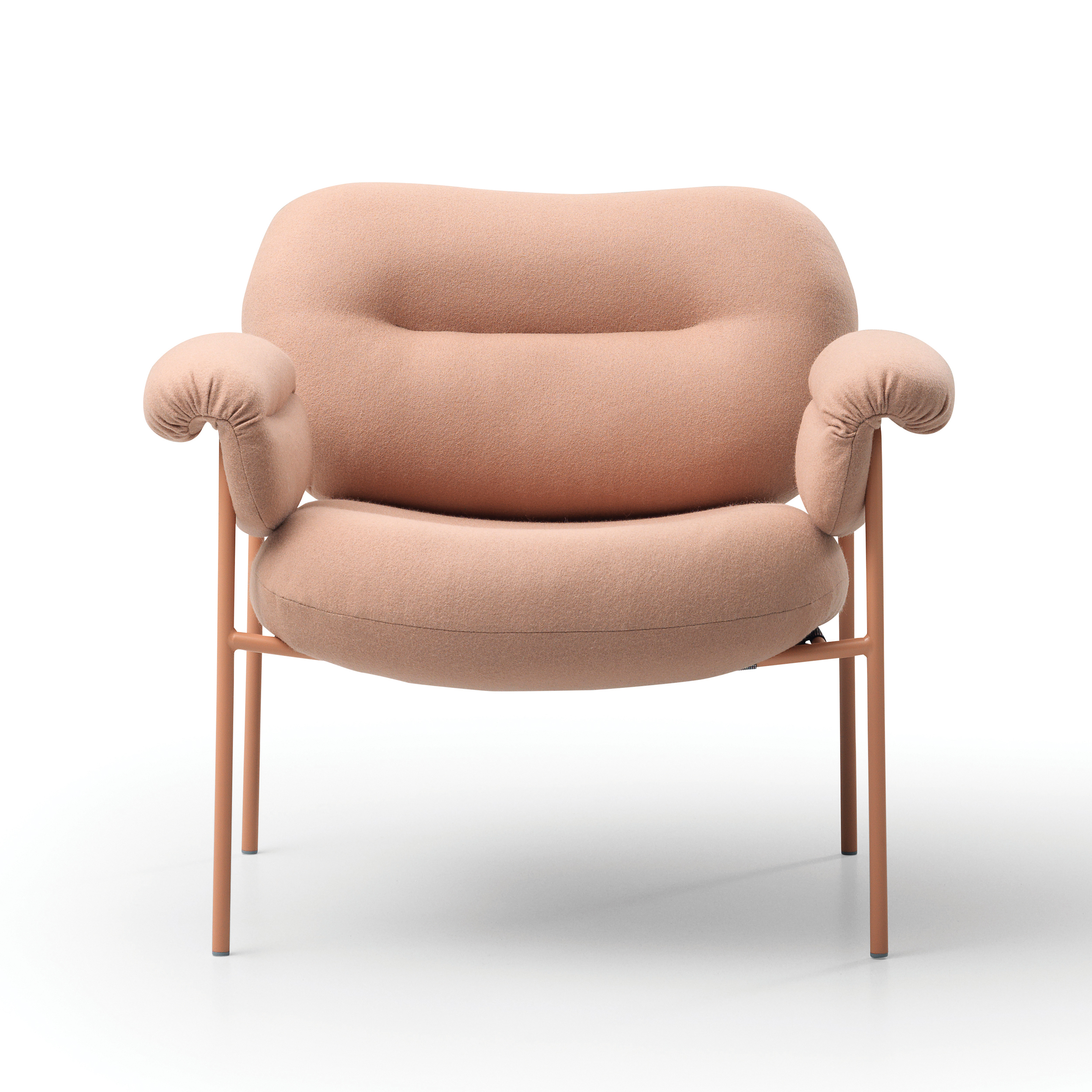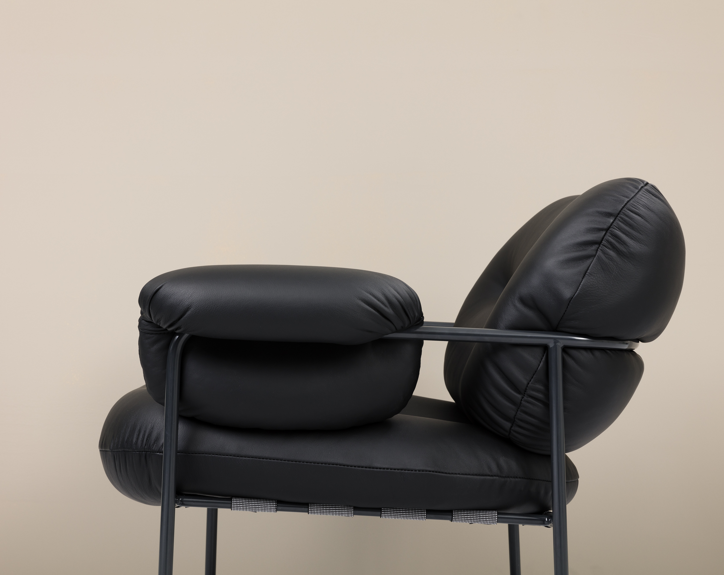 Komfort er inspirasjonen bak Bollos frekke karakter med sjenerøs polstring og lubne utseende. De myke volumene omfavner den smale basen i metall og danner en spenning mellom stolens konstruksjon og putene.
