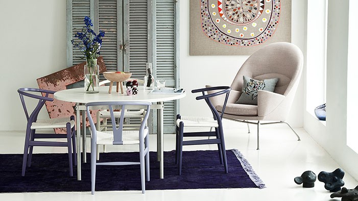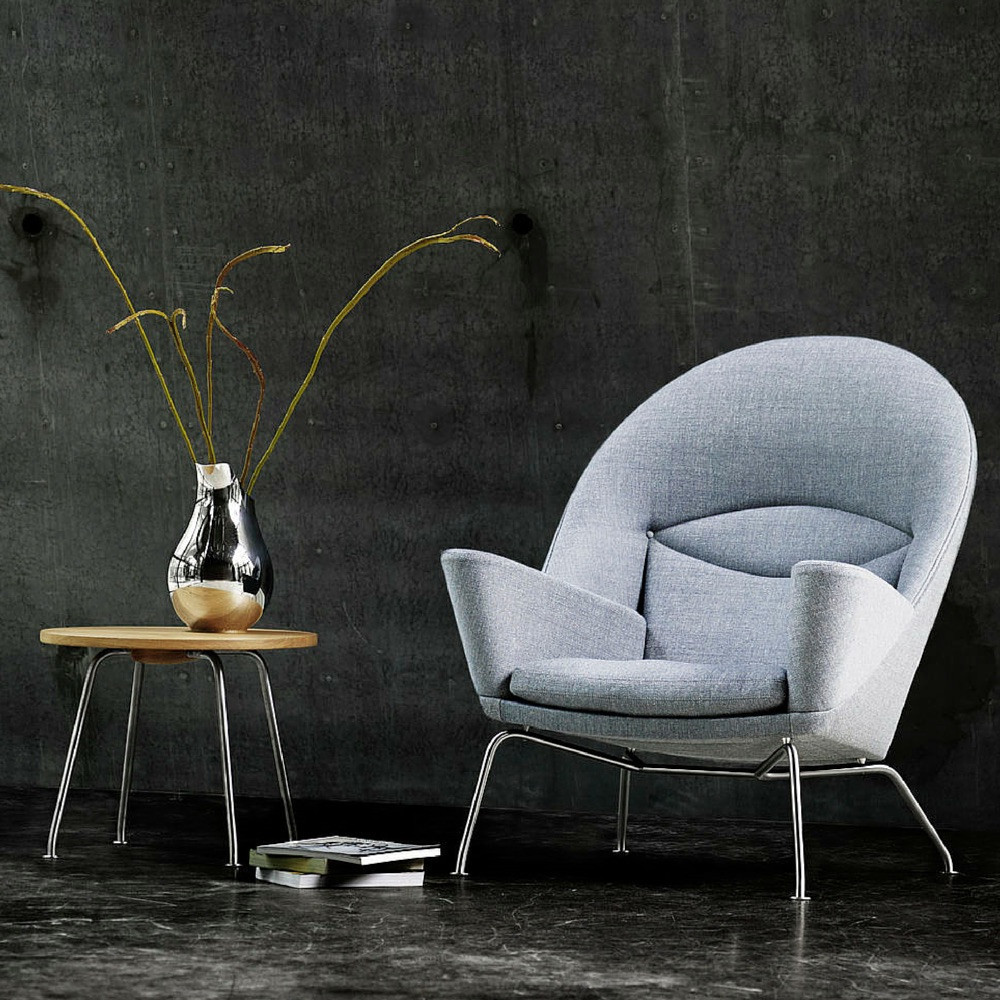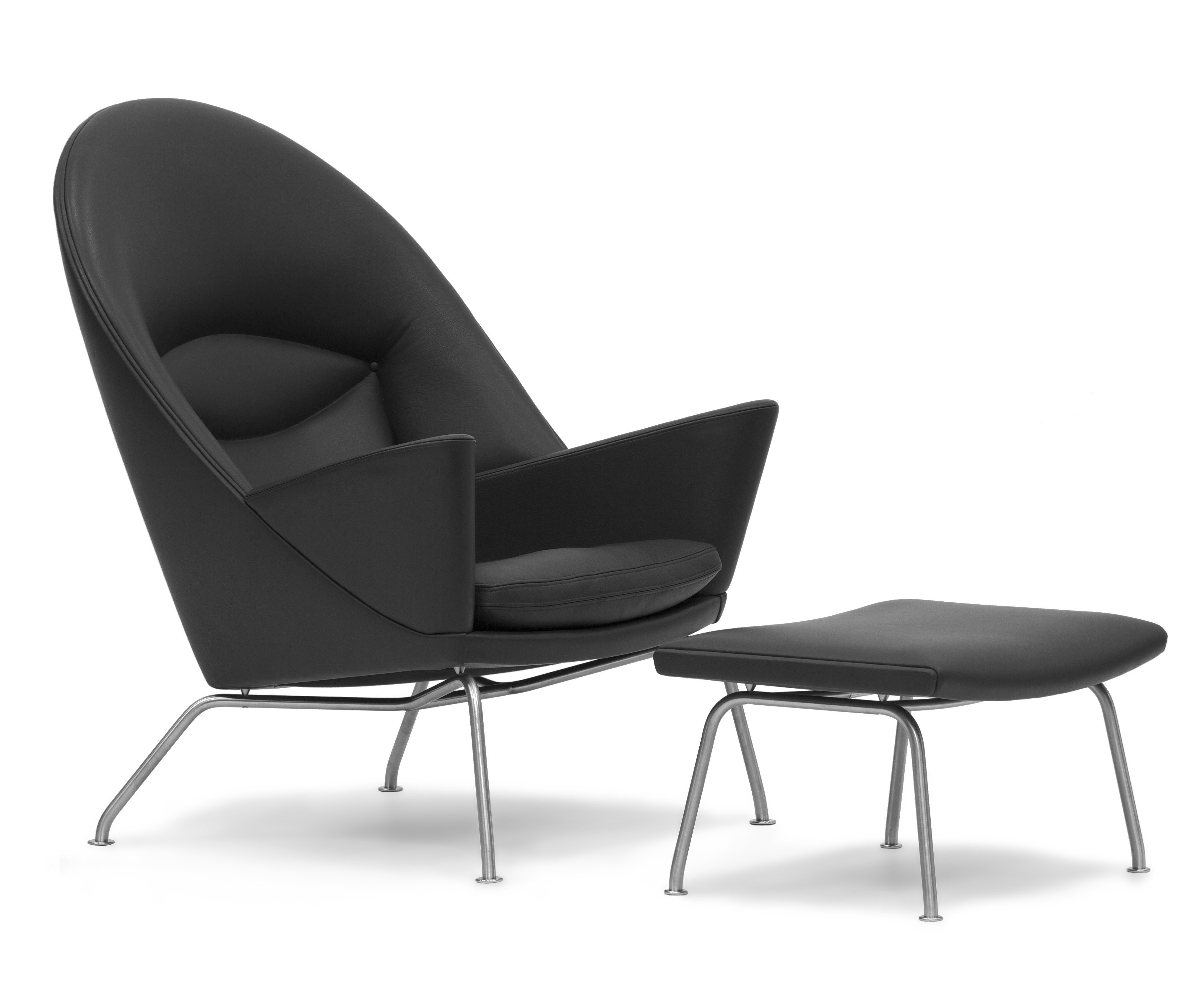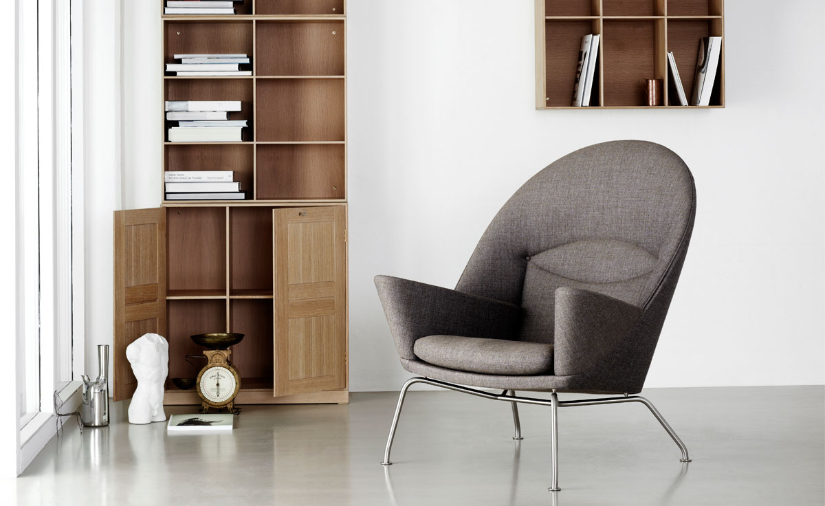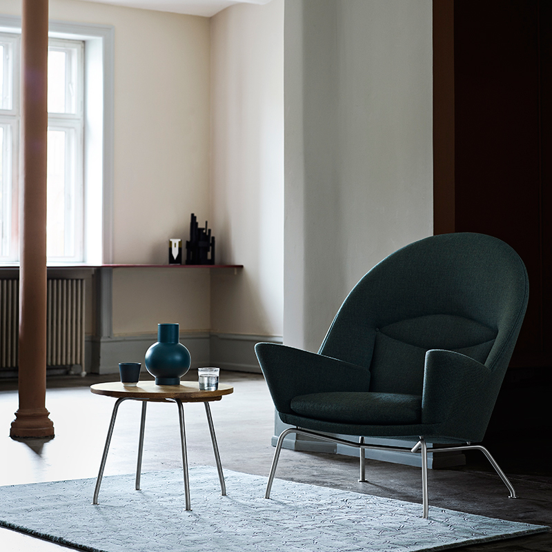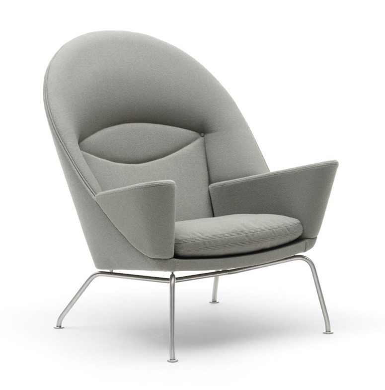 En meget komfortabel polstret lenestol, som Hans J. Wegner designet i 1960, men som først har kommet i produksjon nå – så det er nesten snakk om en nyhet fra Wegner. Lenestolen har en romslig, polstret overdel med en bred avrundet rygg og store armlen – en flott kontrast til det lette understell. Stolen fungerer både som et samlingspunkt i stuen eller i grupper. Stolen kan polstres i stoff eller skinn etter ønske. Ben i rustfritt stål. Stolen fås med skammel CH446.