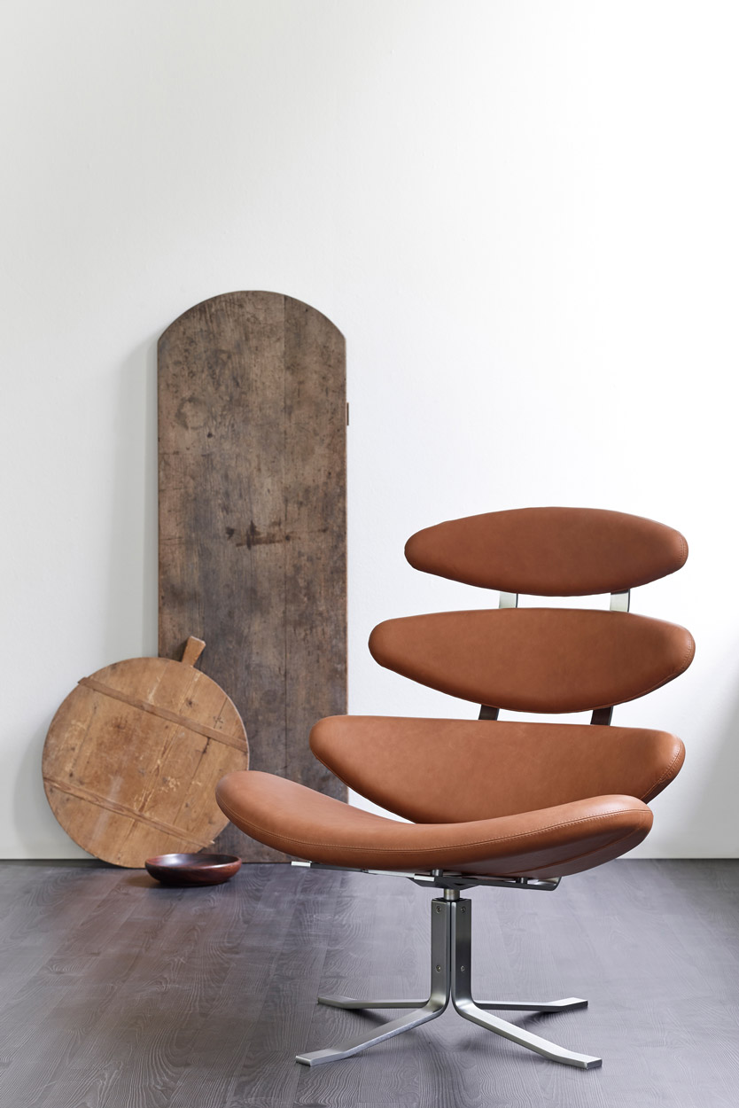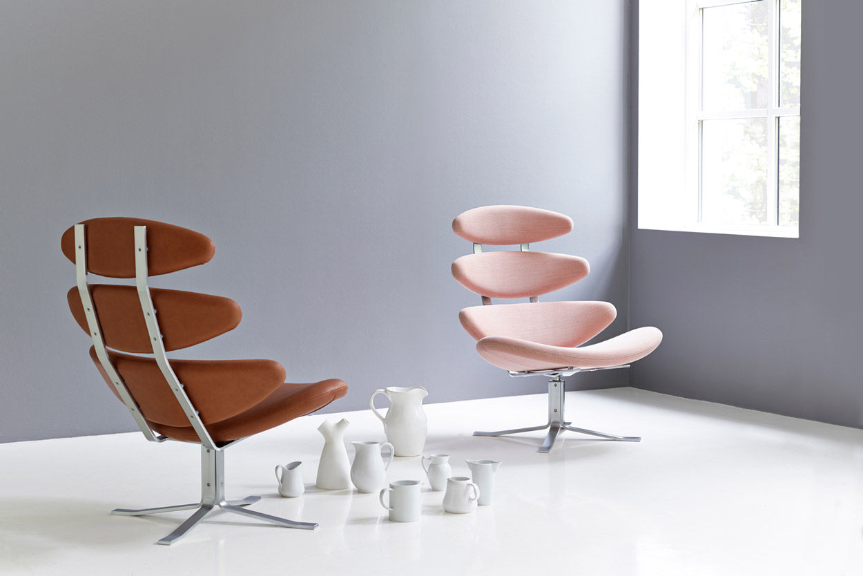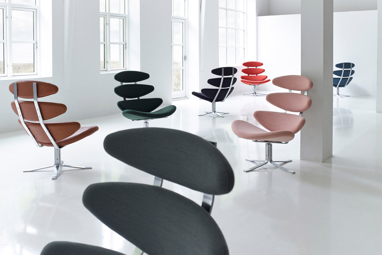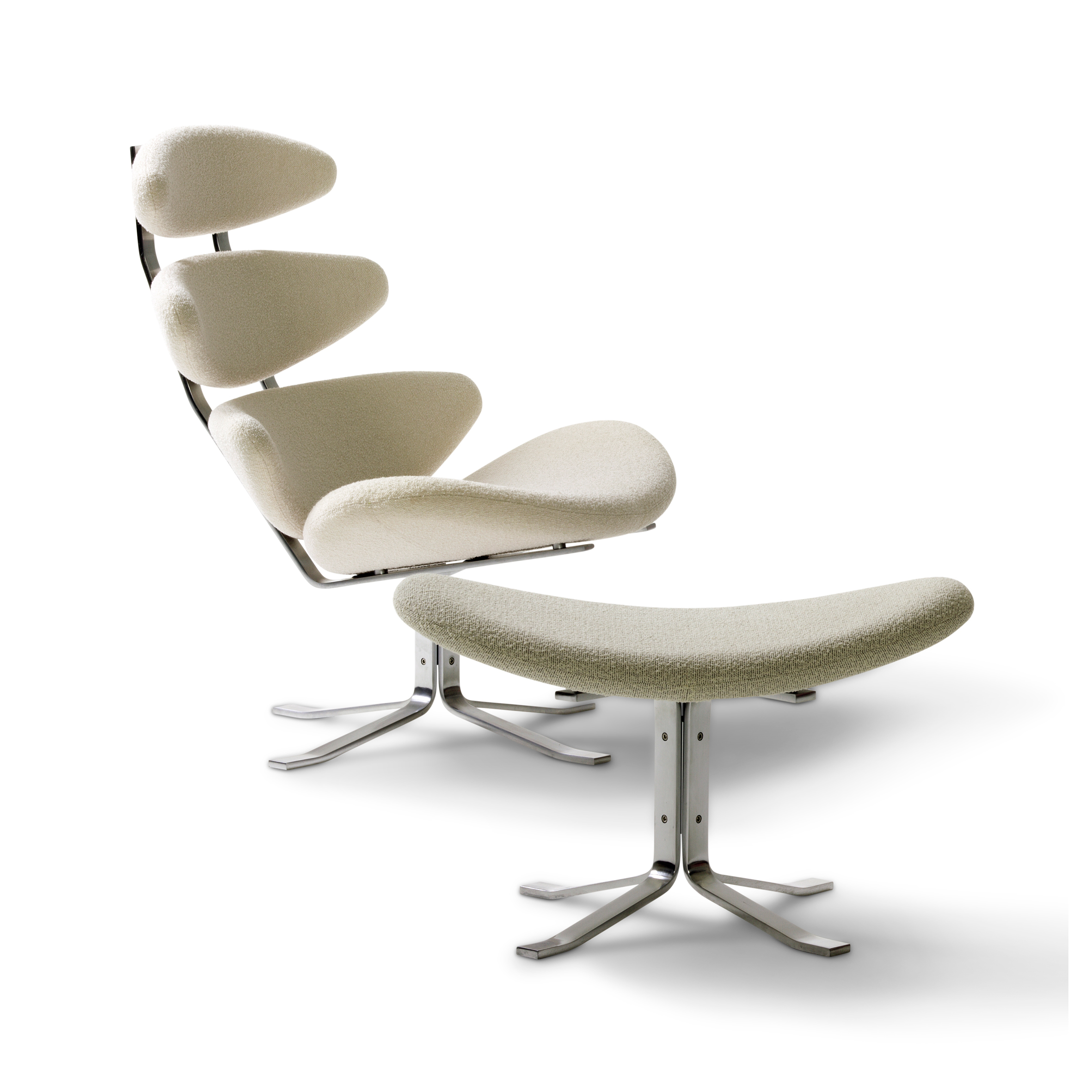 Da Poul M. Volther designet Corona i 1964 skapte stolen stor begeistring. Corona er lett, men med skulpturell tyngde på samme tid. Denne kombinasjonen har gjort Corona til en stjerne i utallige filmer, moteshow og musikkvideoer. Stolens omfavnende form refererer direkte til den menneskelige anatomi med ryggsøyle og ribben. Velg blant mange standard tekstiler og skinn kvaliteter. Svingbart understell i matt forkrommet stål. Kan fås med tilhørende fotskammel og bord i samme serie.