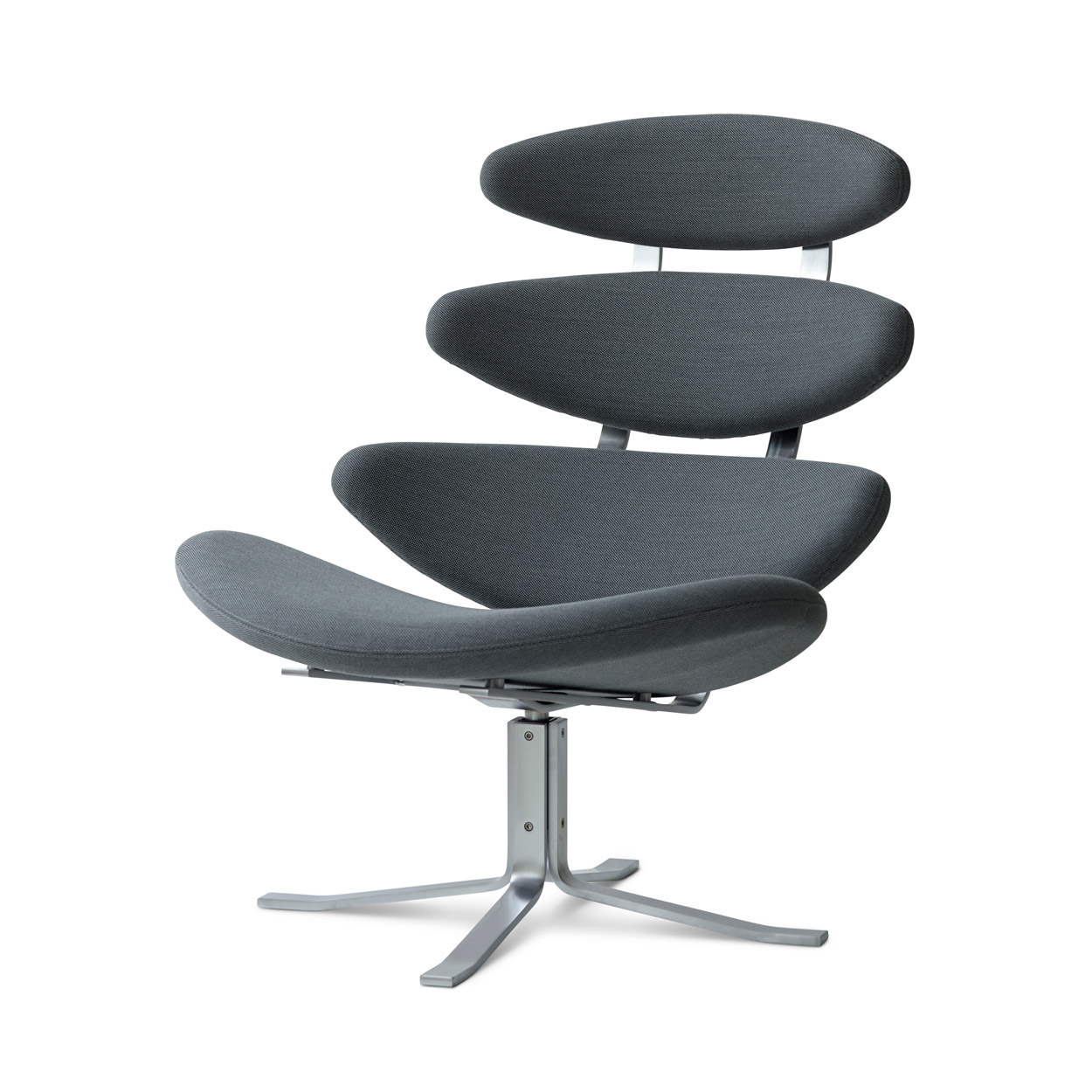 Da Poul M. Volther designet Corona i 1964 skapte stolen stor begeistring. Corona er lett, men med skulpturell tyngde på samme tid. Denne kombinasjonen har gjort Corona til en stjerne i utallige filmer, moteshow og musikkvideoer. Stolens omfavnende form refererer direkte til den menneskelige anatomi med ryggsøyle og ribben. Velg blant mange standard tekstiler og skinn kvaliteter. Svingbart understell i matt forkrommet stål. Kan fås med tilhørende fotskammel og bord i samme serie.
