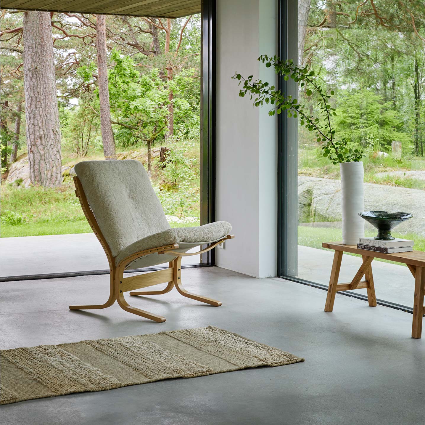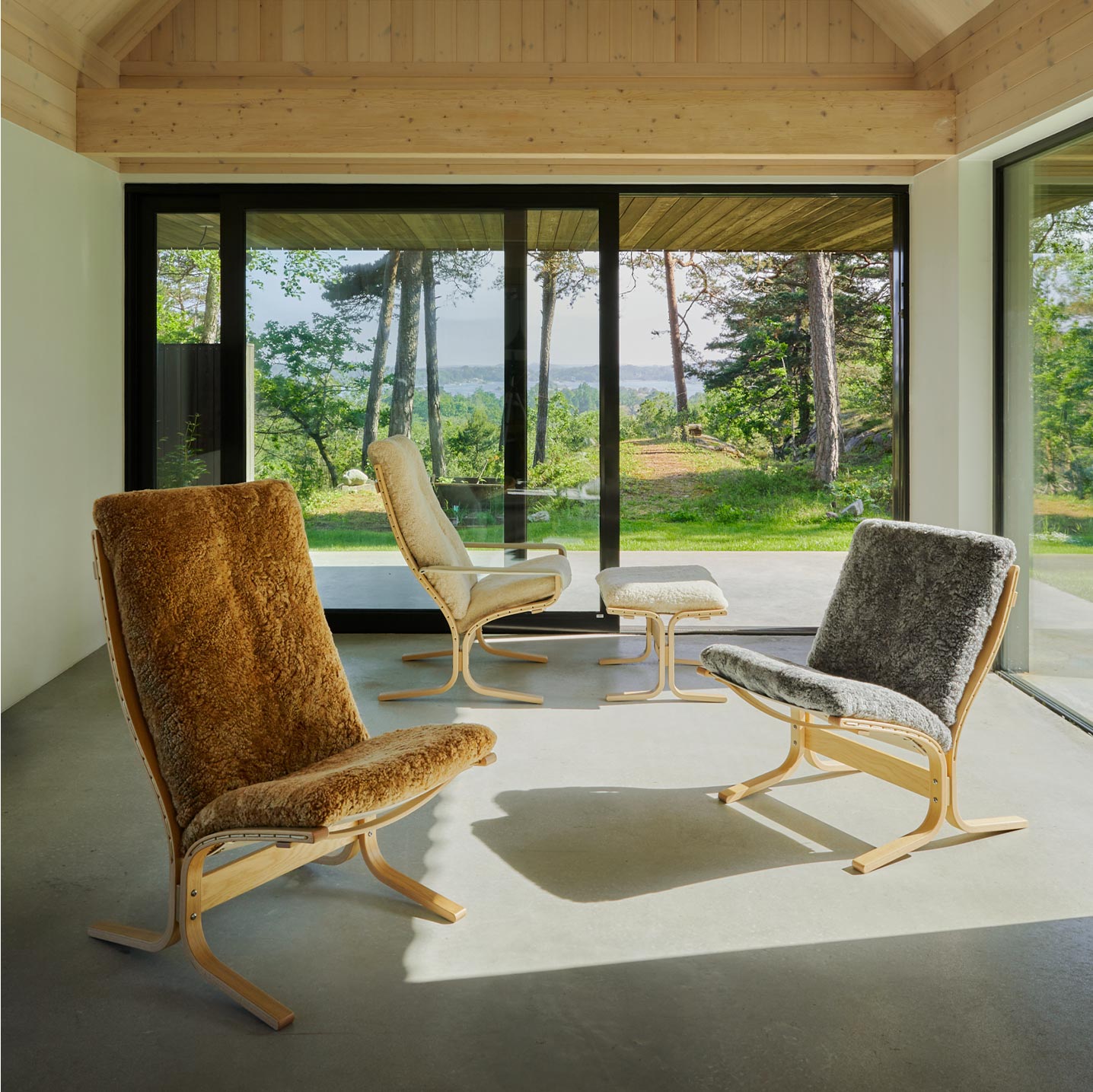 For å hylle Siestas tradisjoner og bruk av naturlige materialer fikk stolen en ny drakt i 2021. Saueskinn har blitt brukt av menneskeheten i århundrer på grunn av sine egenskaper som varme og slitestyrke. «Ovis» betyr sau på Latin, derav navnet: Siesta Ovis. Stolens myke og hyggelige uttrykk inviterer deg til å bli sittende i timesvis og er det perfekte stedet å slappe av. Tilgjengelig med høy og lav rygg og med og uten armlene. Fotskammel er også tilgjengelig. Kommer i et stort utvalg i skinn og tekstil. Rammen kommer i eik eller sort.
