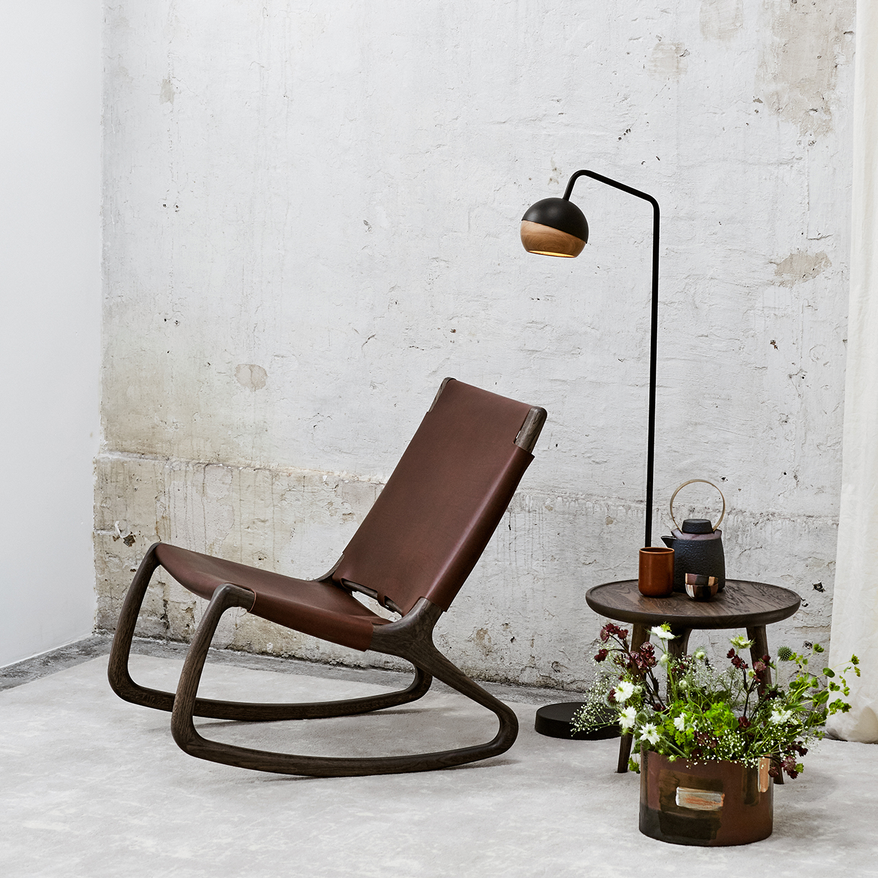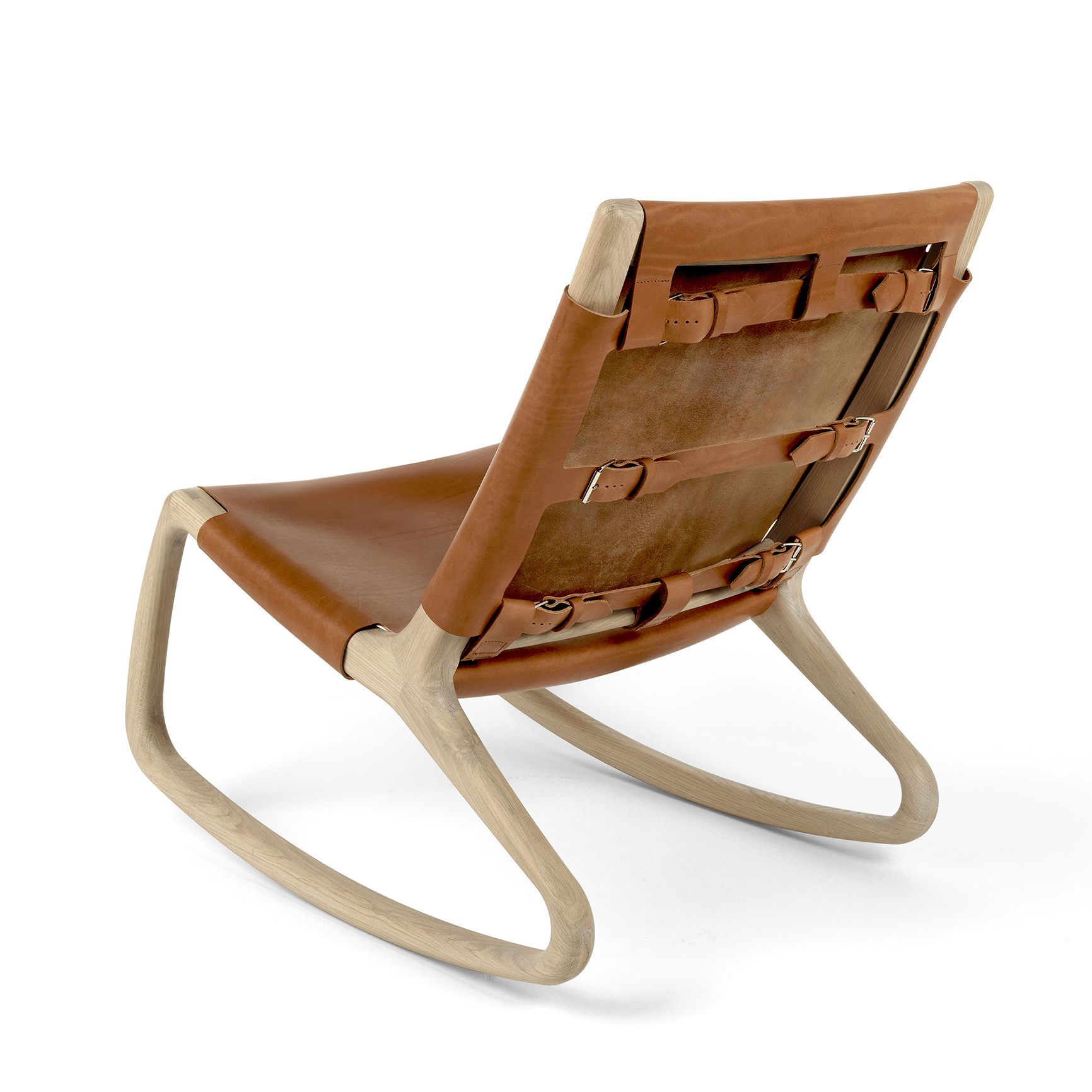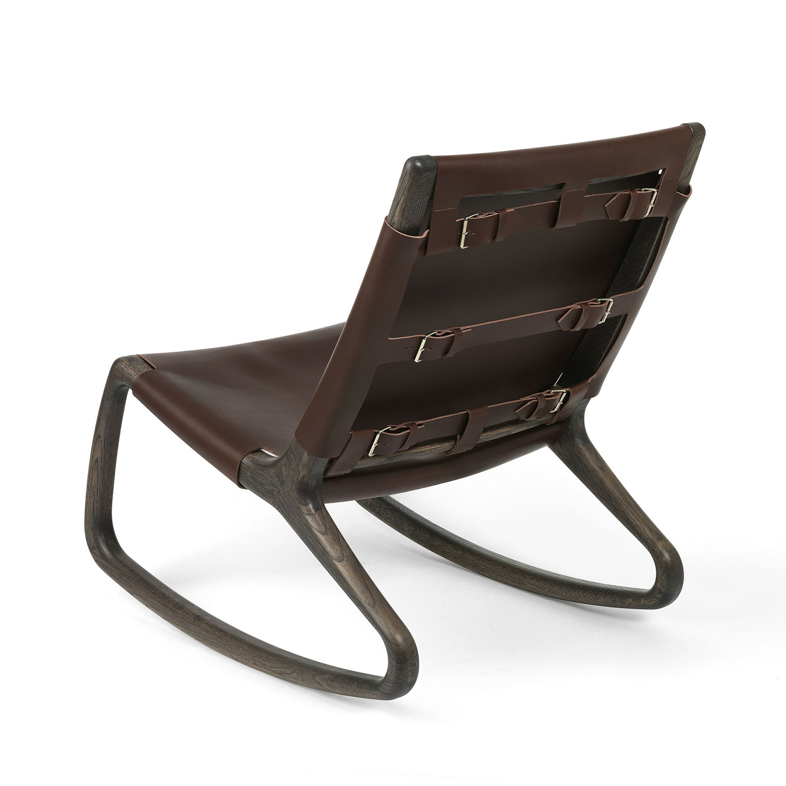 Rocker lenestol kombinerer gamle salbelte teknikker, med tradisjonell bearbeiding av tre, noe som gir stolen et tidløst og karakteristisk design. Kombinasjonen av høykvalitets skinn og den solide eiken med synlige detaljer, gir gyngestolen både komfort og slitestyrke. Skinnet er nøye utvalgt fra en serie av vegetabilske garvede skinn fra Sørensen Leather, som lages uten bruk av krom eller kjemikalier. Naturlige ufullkommenheter gir karakter og lar den eldes vakkert over tid.