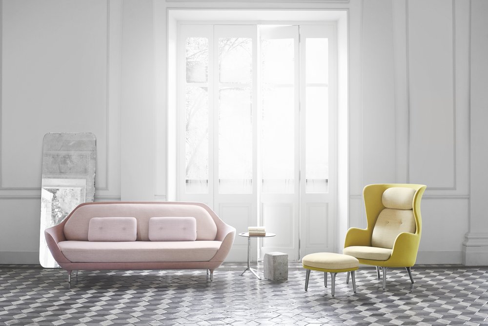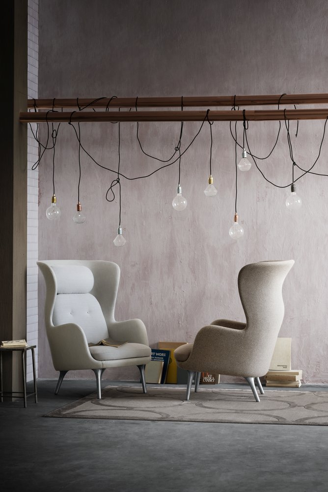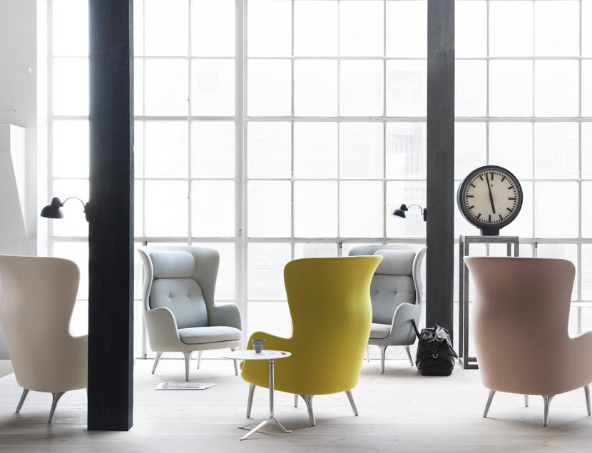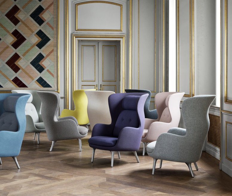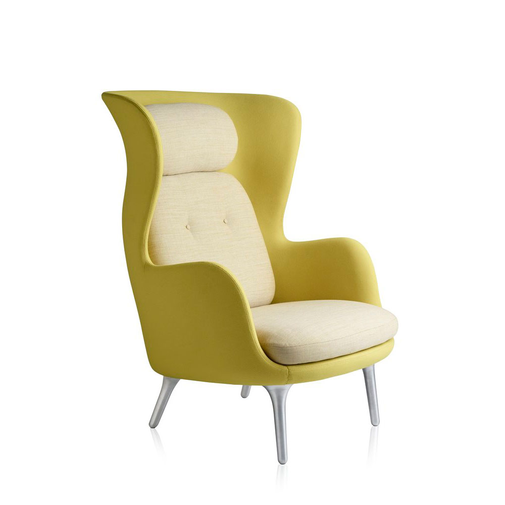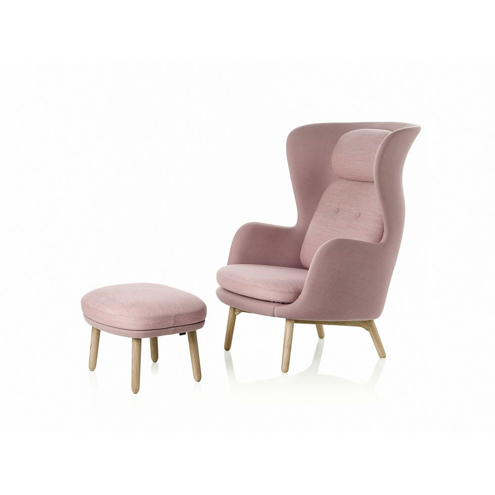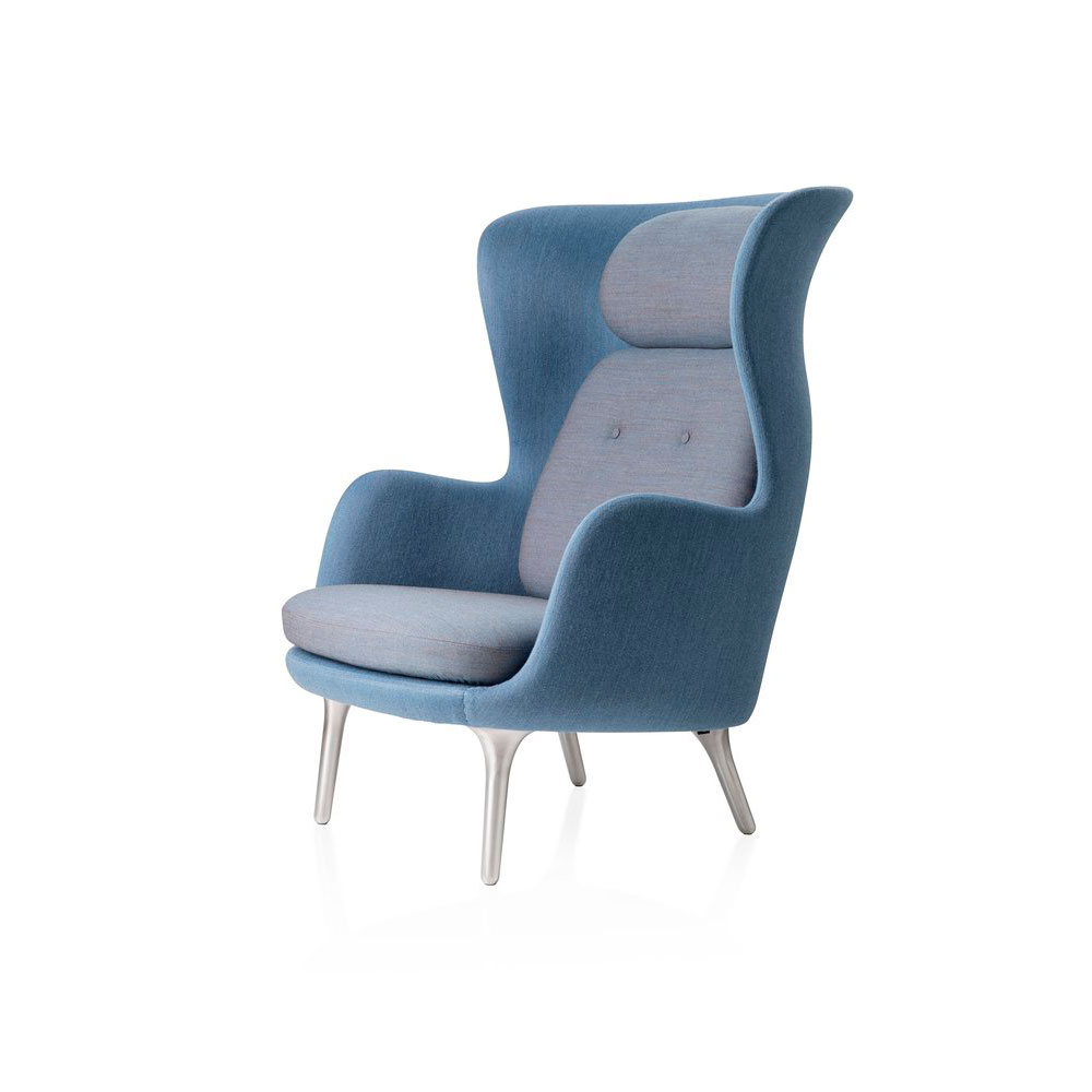 Ro™, designet av Jamie Hayon, fås i et utvalg av unike Designer Selections-farger bestående av en kombinasjon av to forskjellige typer stoff; ét til skallet og ét til putene. Lounge stolen fås også polstret i et stort utvalg av standard tekstil og skinn kvaliteter. Understellet fås med 4 ben i børstet aluminium eller med treben i eik. Til stolen fås også en matchende fotskammel.