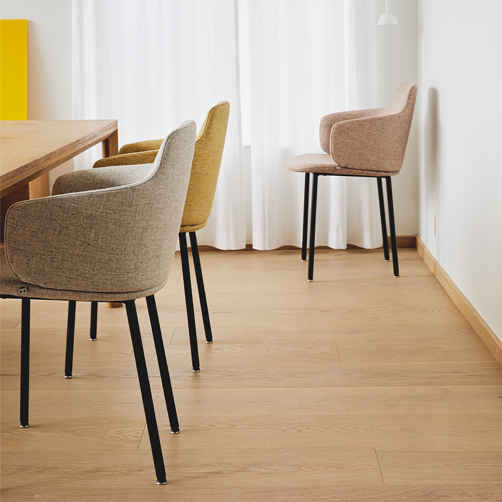Adam er en slank og delikat stol som ønsker deg velkommen med en enestående komfort med ekstra fokus på korsryggstøtte. Med tre forskjellige benvalg kan den tilpasses et hvert behov. Tilgjengelig i et stort utvalg av tekstiler og skinn. Adam er en sirkulær modell som er konstruert for et langt liv. Sete og rygg leveres med avtakbare trekk med glidelås. Dette forlenger levetiden og forenkler omtrekking, reparasjon og resirkulering. Bena leveres standard i sort, men kan leveres i annen standard RAL på forespørsel.