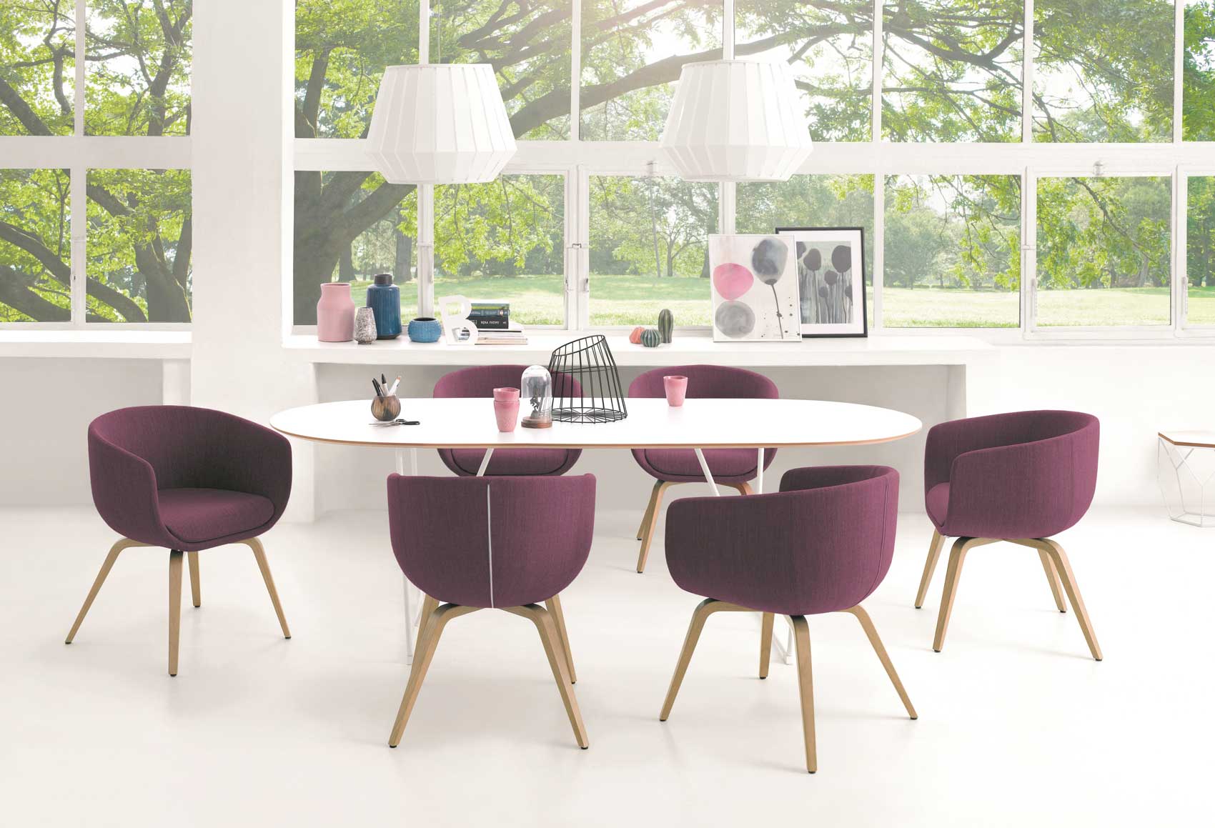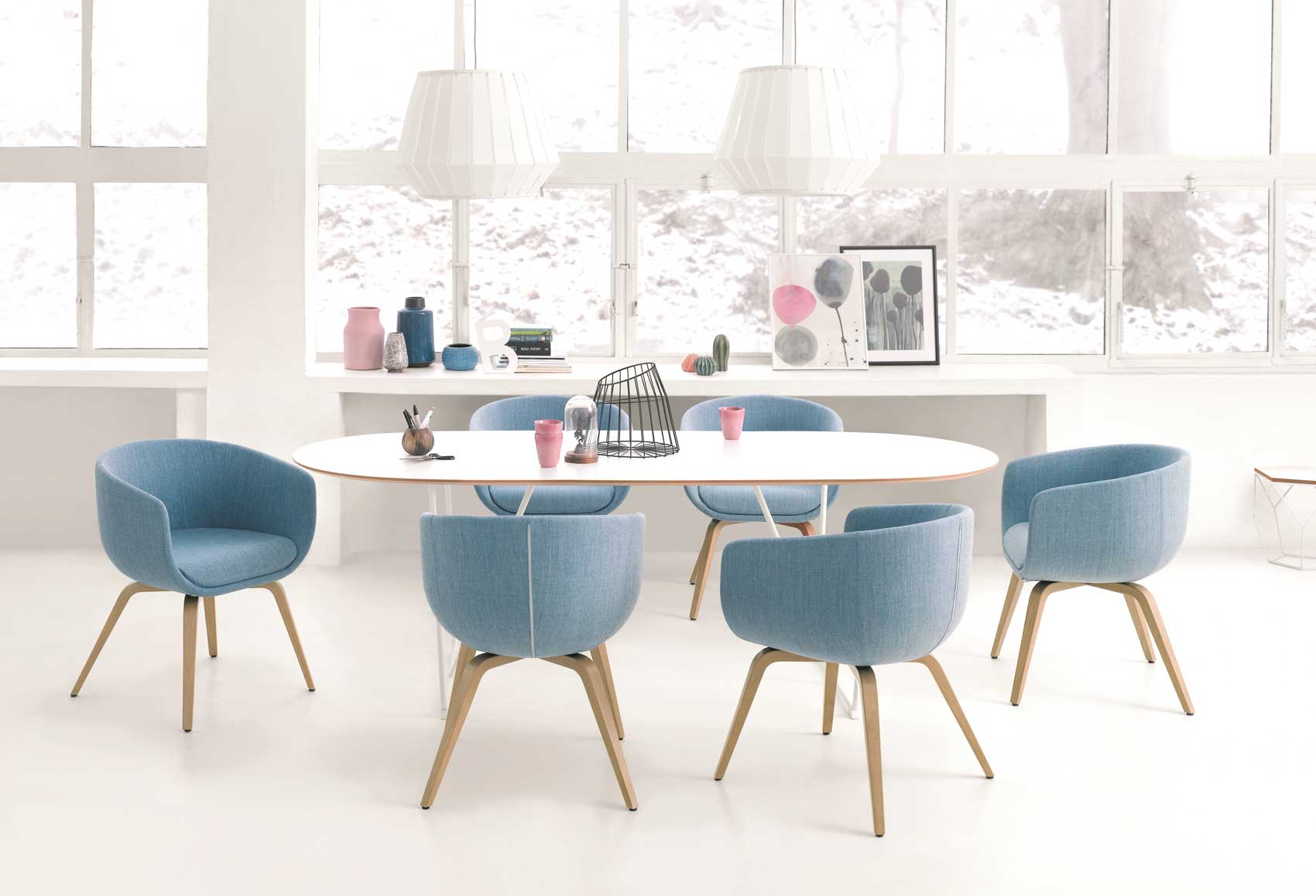 Nu er en omsluttende, elegant stol med god sittekomfort og som kommer i mange ulike varianter. Stolen gir karakter til kontorlokaler, foajéer, møterom, så vel som til hjemmet.