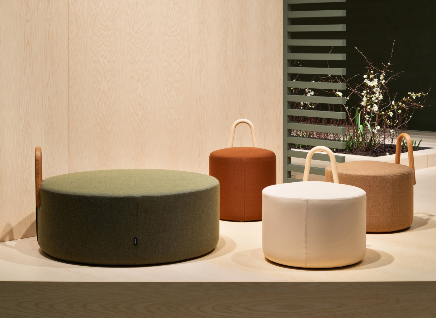 Amstelle Puff er det nyeste tilskuddet til familien og har et praktisk bærehåndtak i heltre; eik eller ask. Til medium og stor puff kan man også velge hjul.
