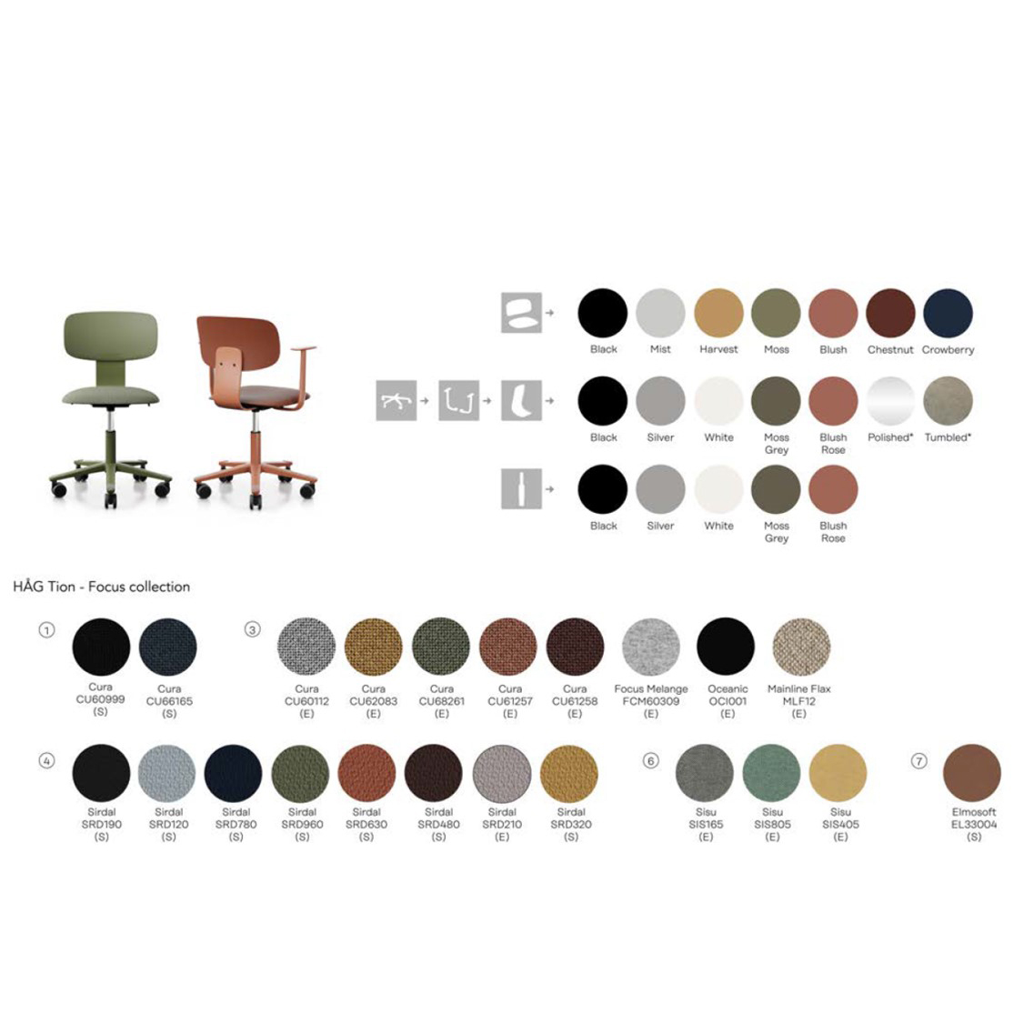 Håg Tion kolleksjonen har et gjennomtenkt utvalg av materialer og farger i ulike kombinasjoner, med og uten tekstil. Se farger i bildeutvalget.