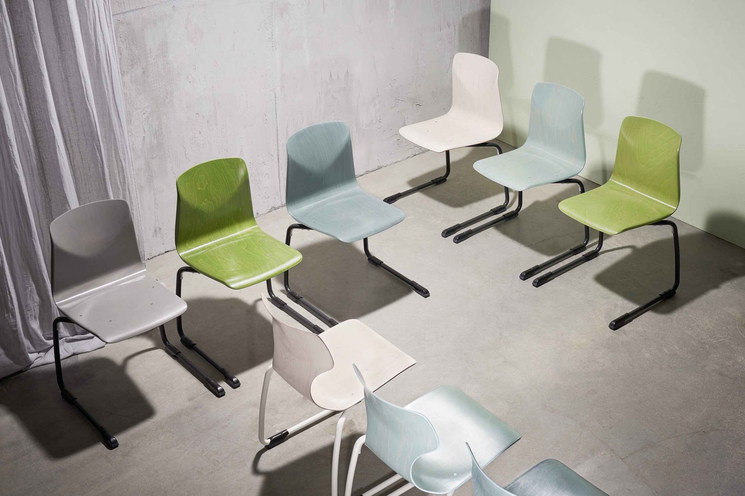 Smart C med formstøpt skall i det ekstremt sterke Pagholz®- materialet. Skallet leveres i helbeiset utførelse med synlig trestruktur, eller laminert med et slitesterkt toppsjikt av dekorpapir i hvit, lønn, bjørk eller bøk og natur kanter. Stolene har utfrest grep i ryggen for lett håndtering.
