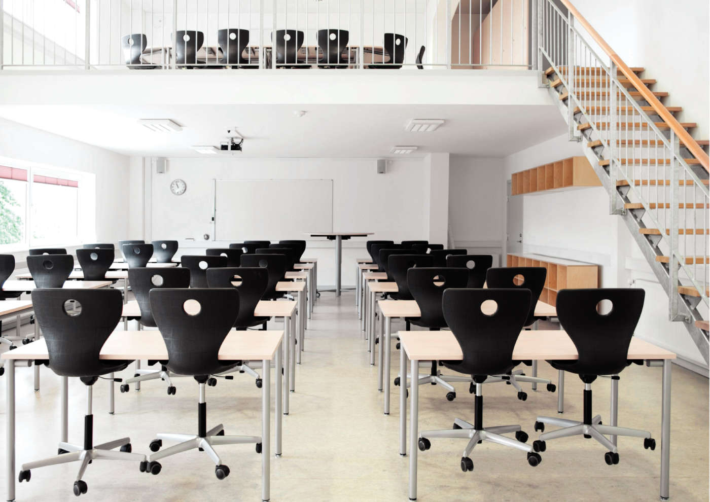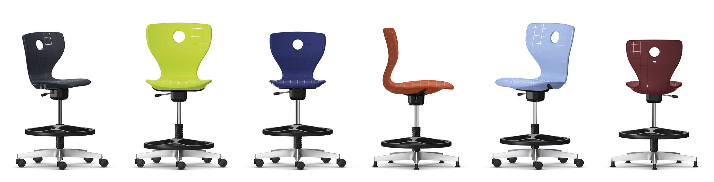 Modell Plus for høyere sitte-/ståarbeidsplasser (68-115 cm) med hjul som bremser under belastning, og med en fotring.
