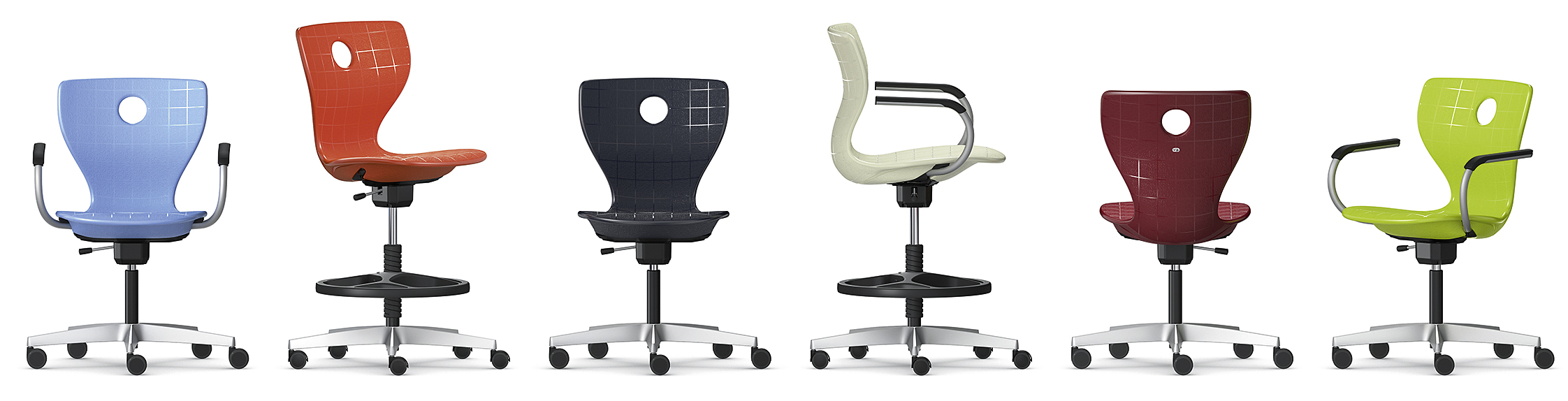 Stol med kryssfot for ergonomisk sittekomfort. Understellet består av en kryssfot i aluminium og en gassfjær med plasttildekking. Alle modeller har høydejustering.