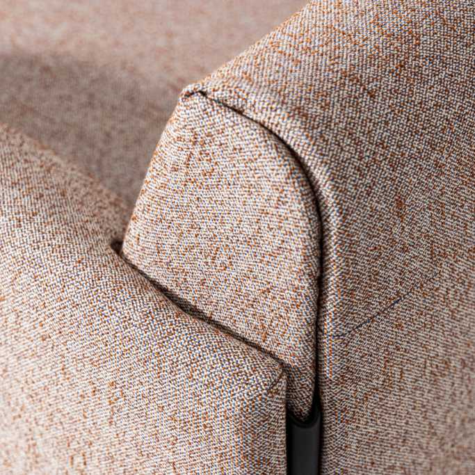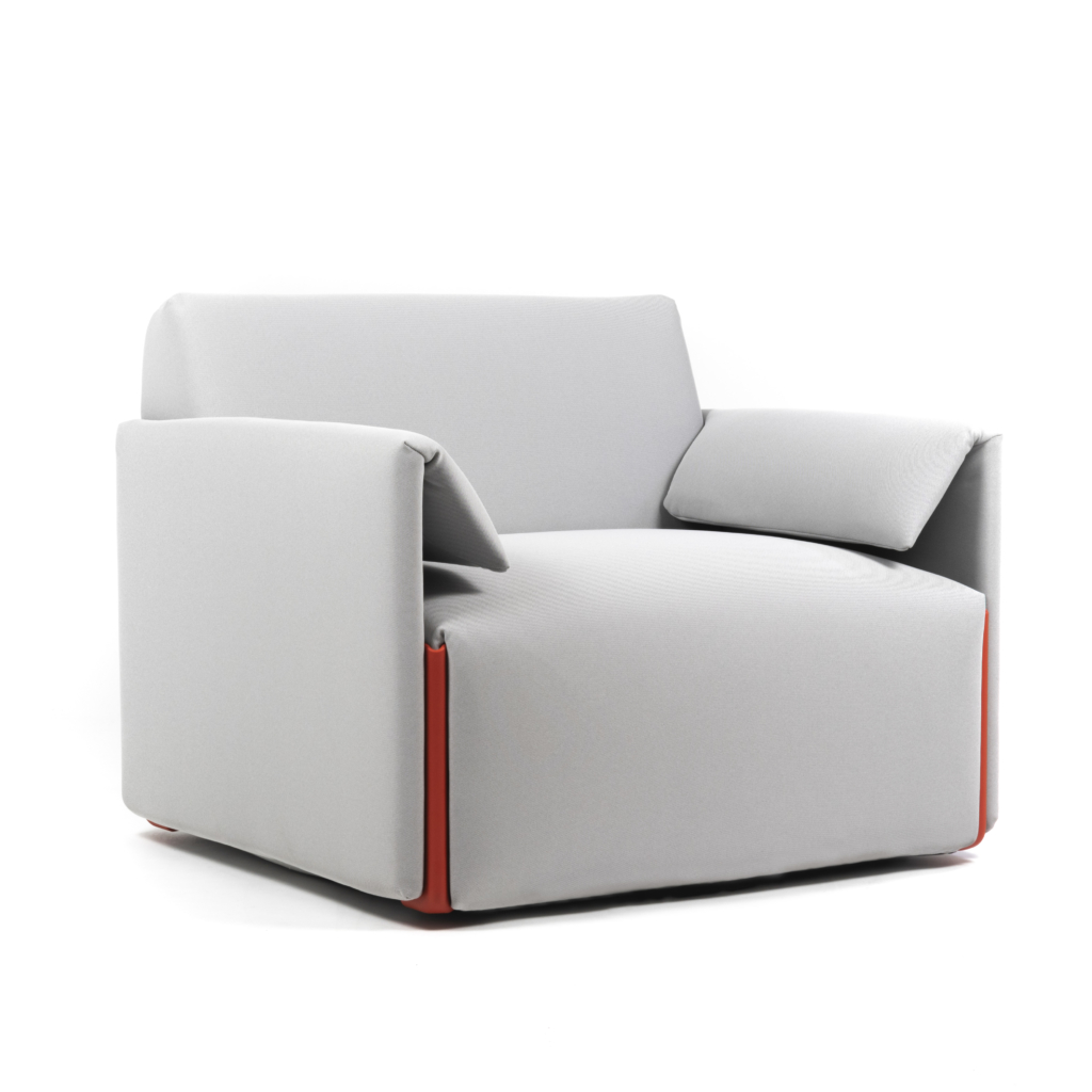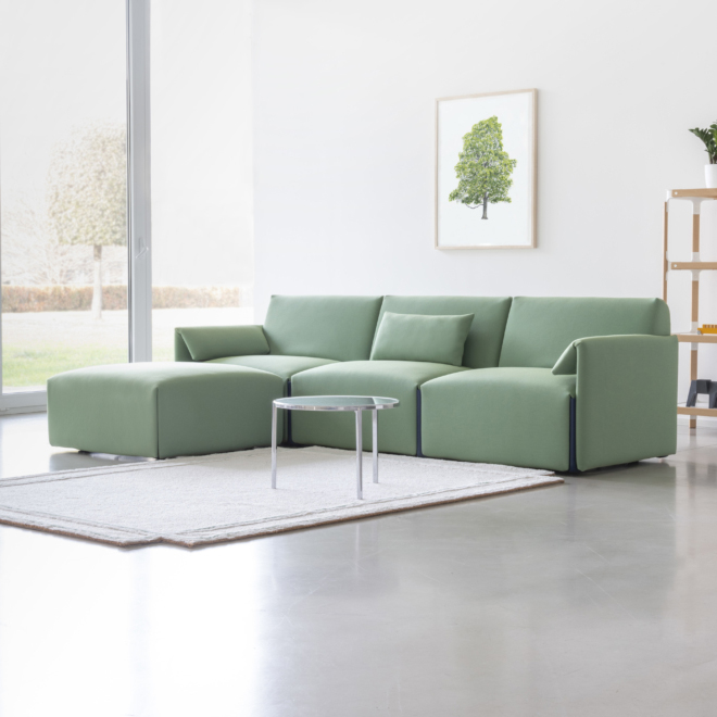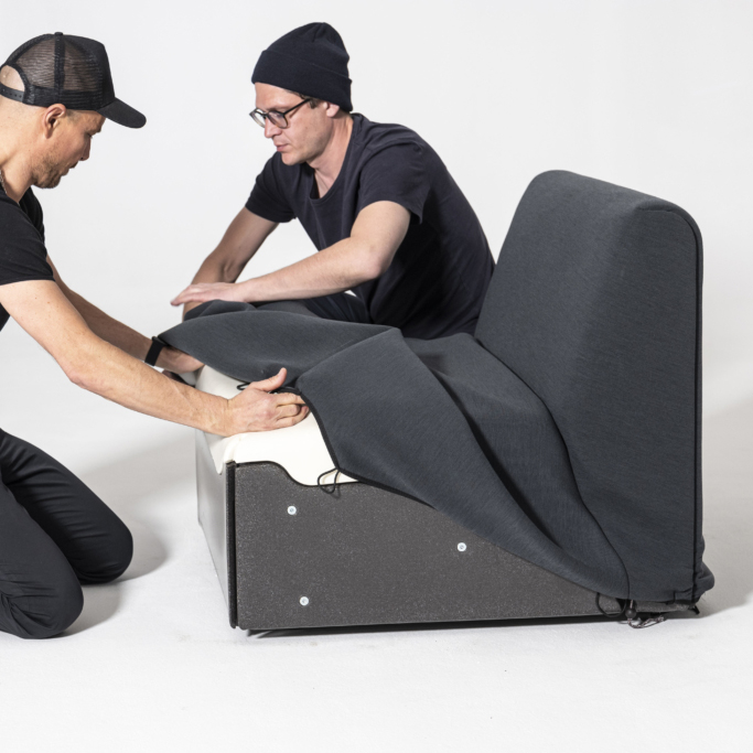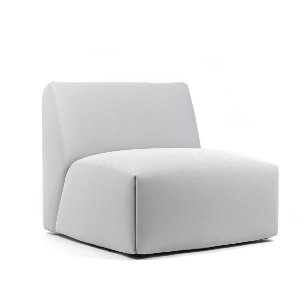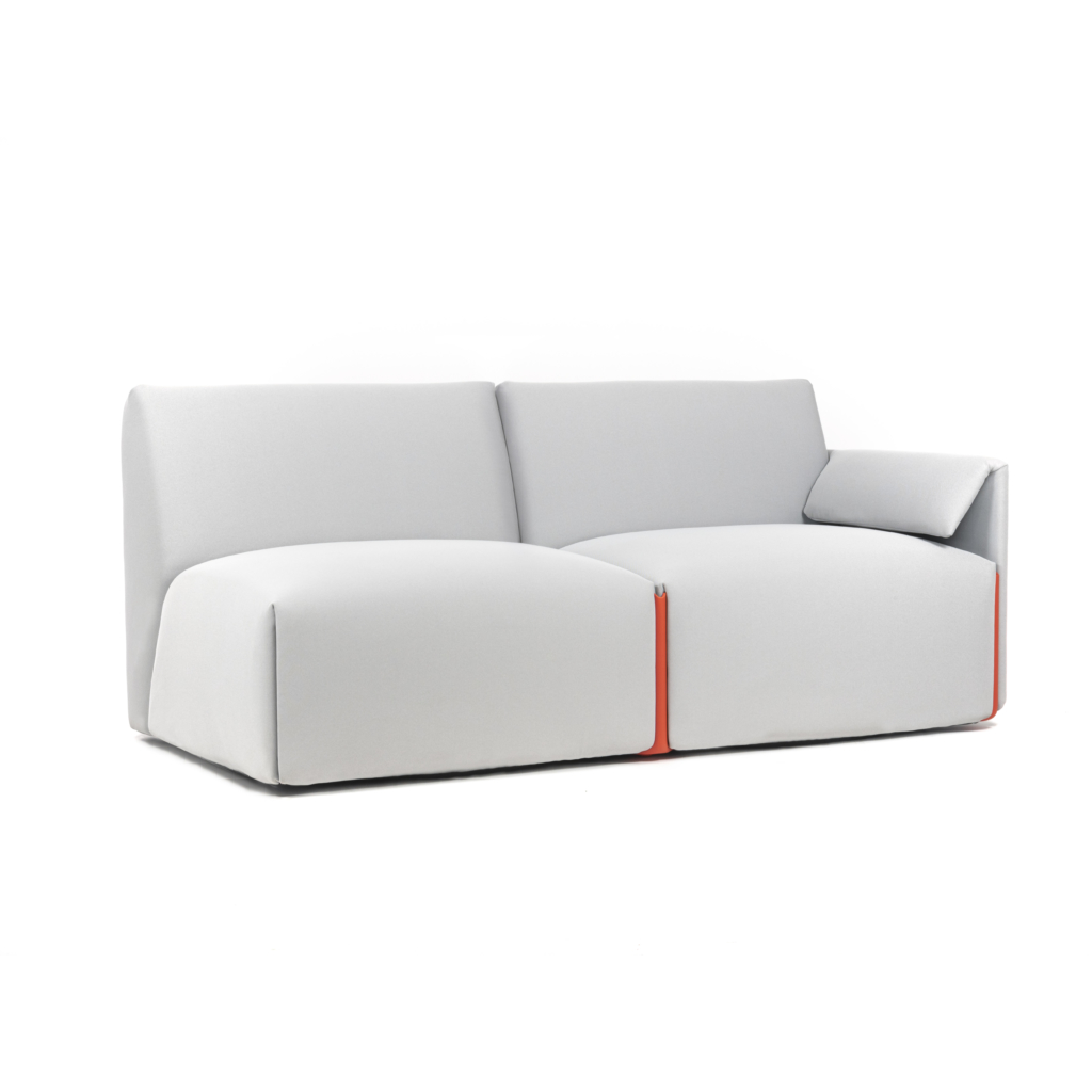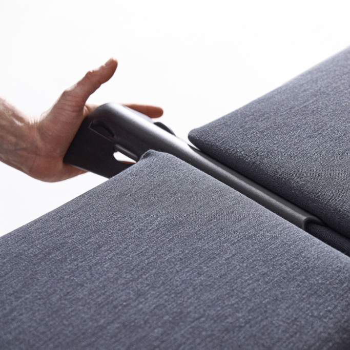 Modulsofa med en 4 mm tynn basemodul laget av resirkulert og resirkulerbar polyetylen fra 100% industriavfall. Sofaen kan enkelt på- og avkles for vask og utskifting. Modulsystemet består av én enkelt enhet, som kan låses sammen i ulike konstellasjoner eller utvides med armlener. Alle deler er separat utskiftbare.