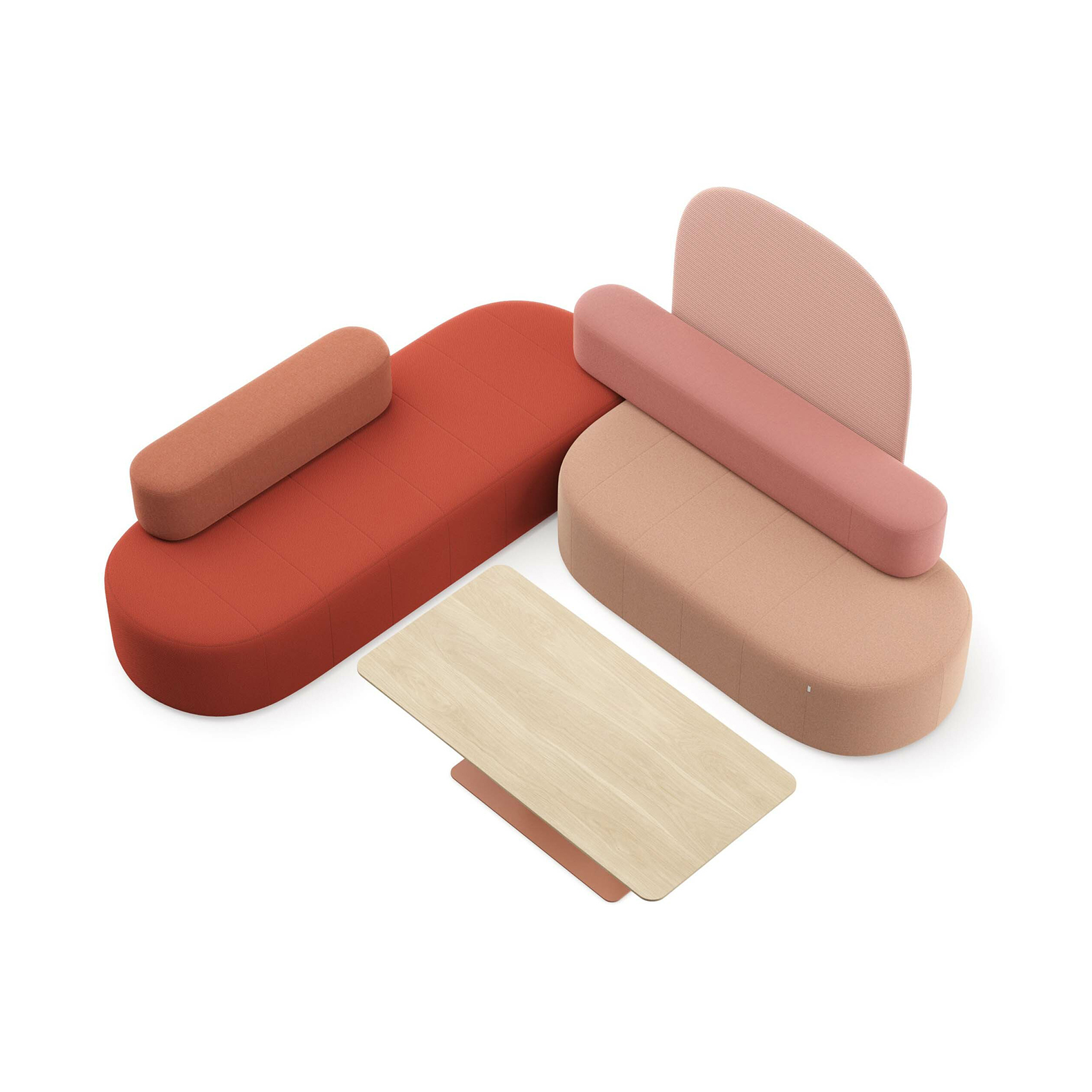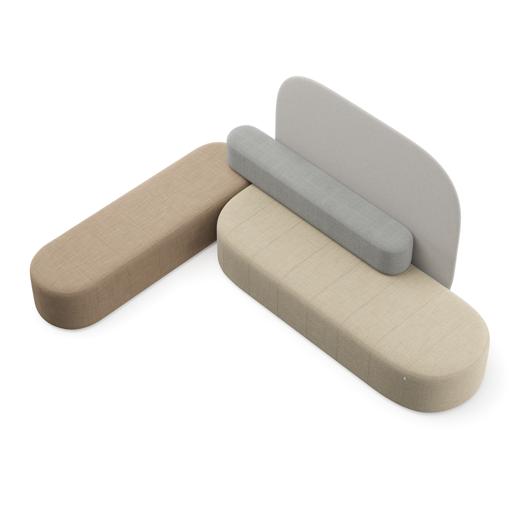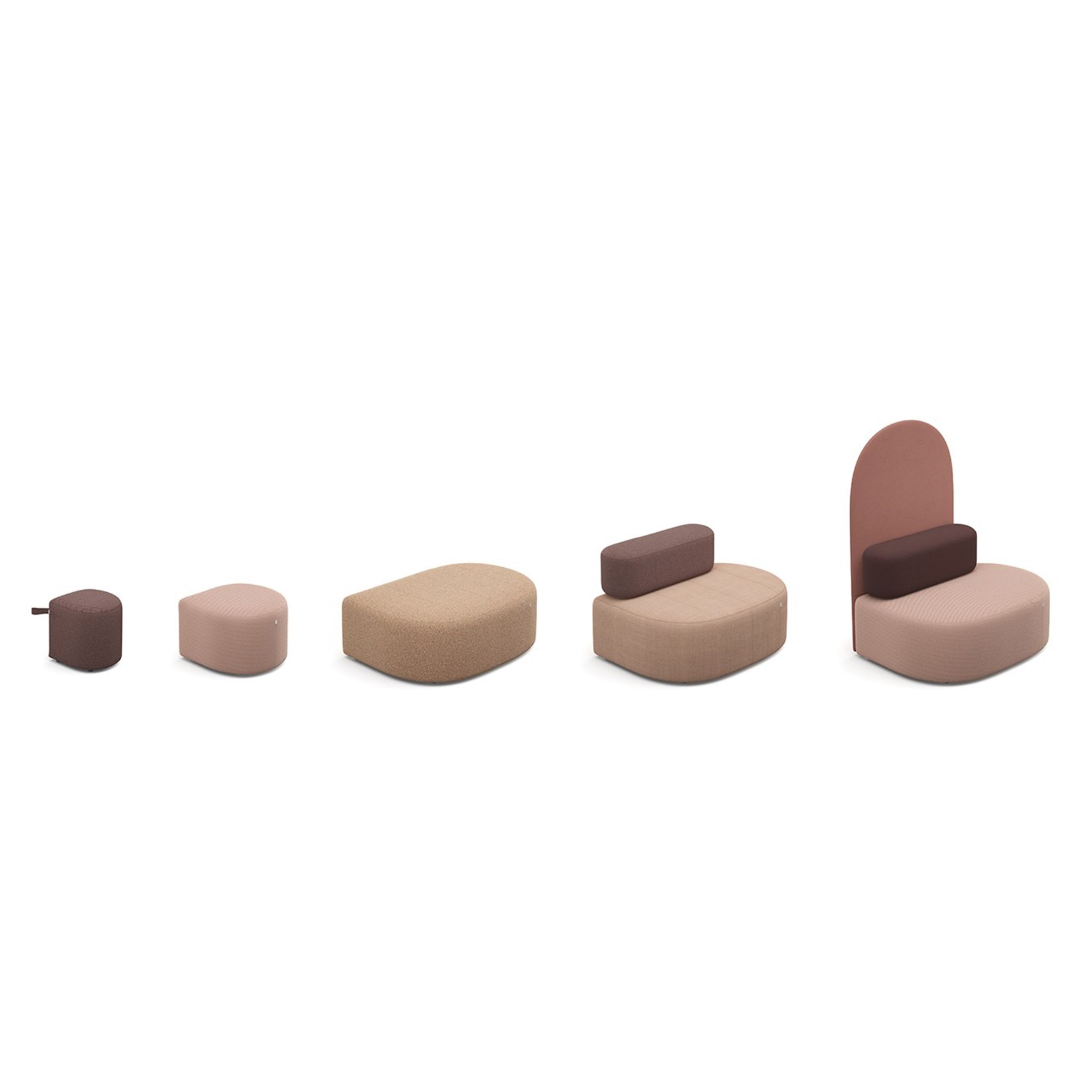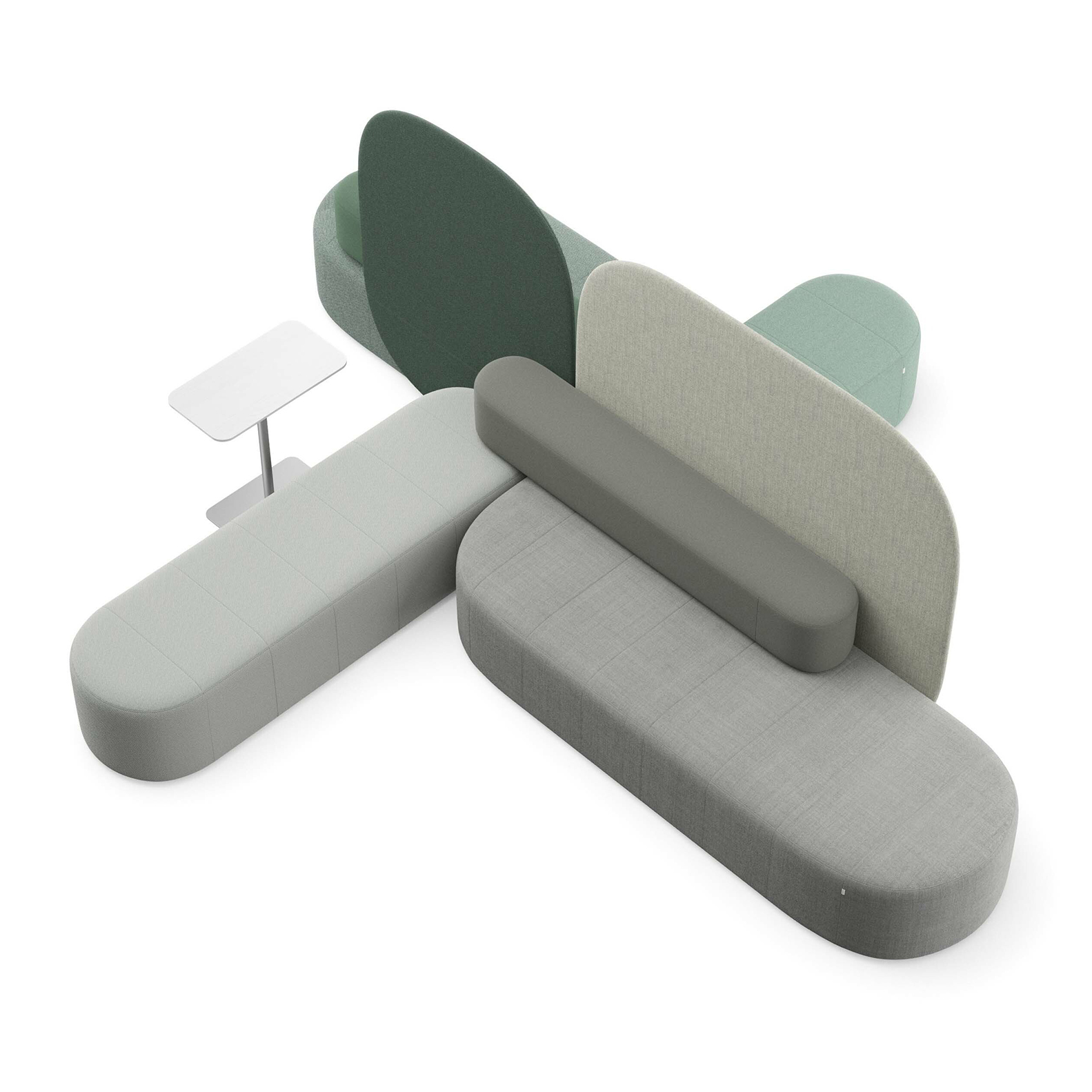 Revo-familien inkluderer sofaer, benker, skjermer, puffer og bord i myke, organiske former.