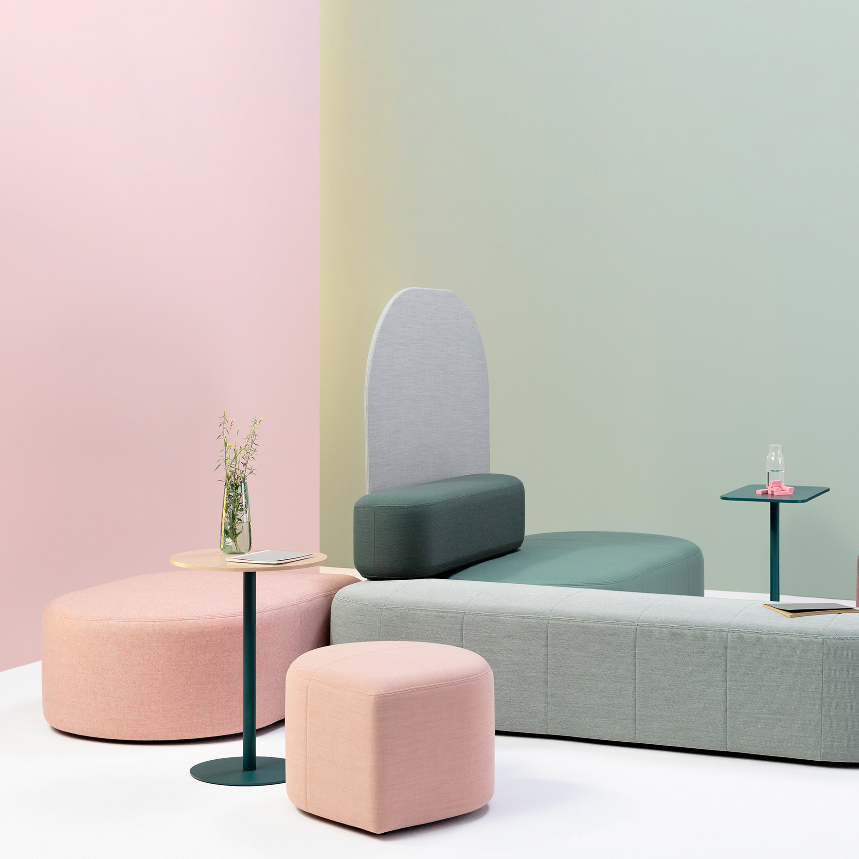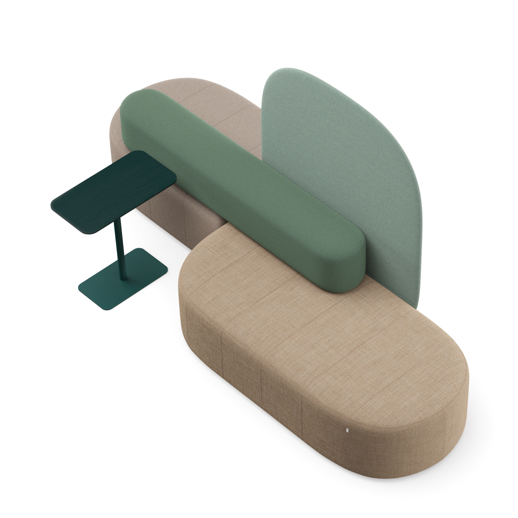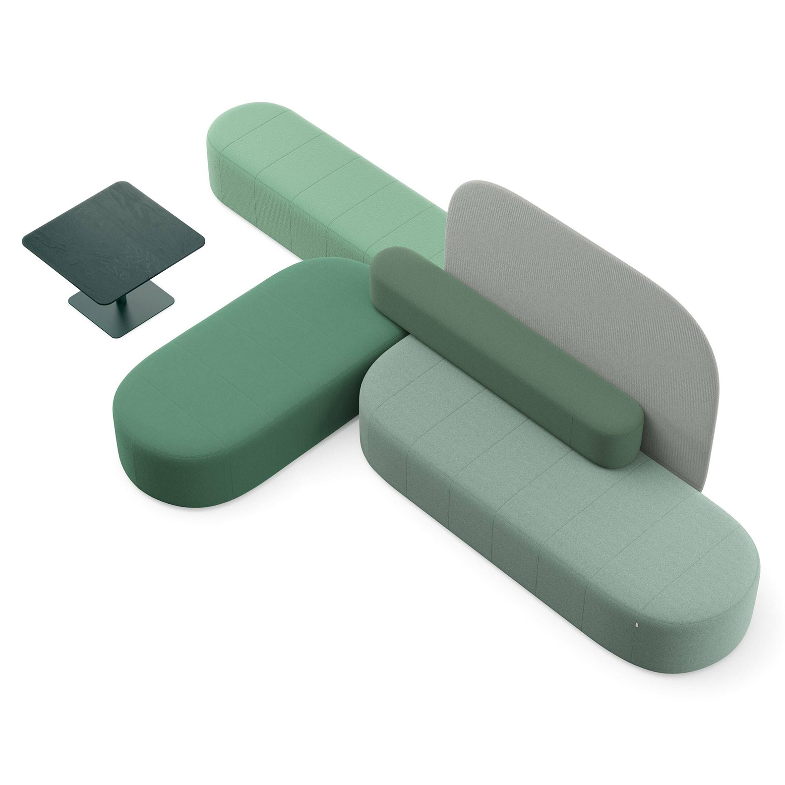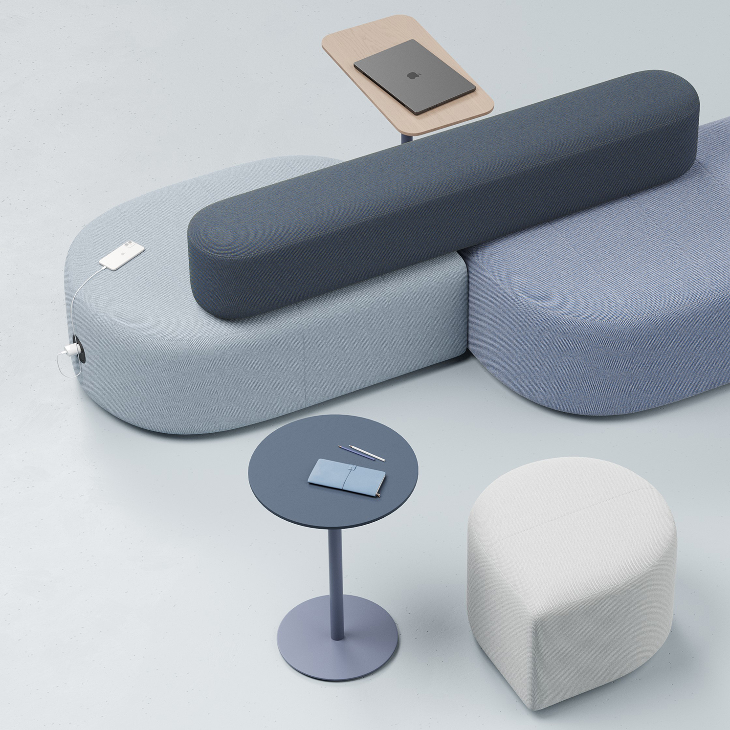 Revo-familien inkluderer sofaer, benker, skjermer, puffer og bord i myke, organiske former.