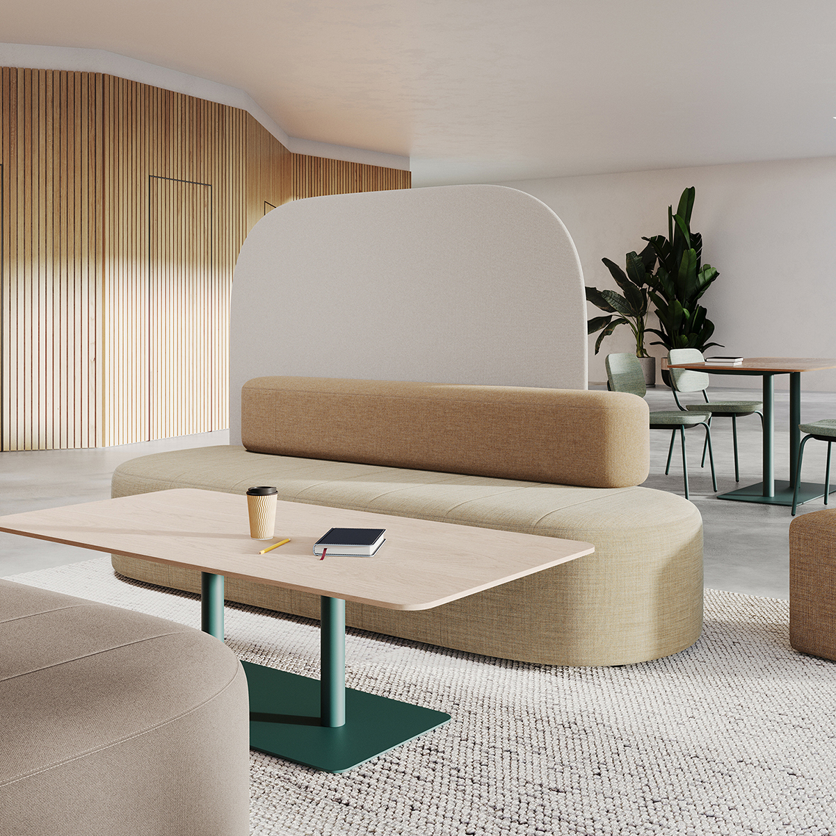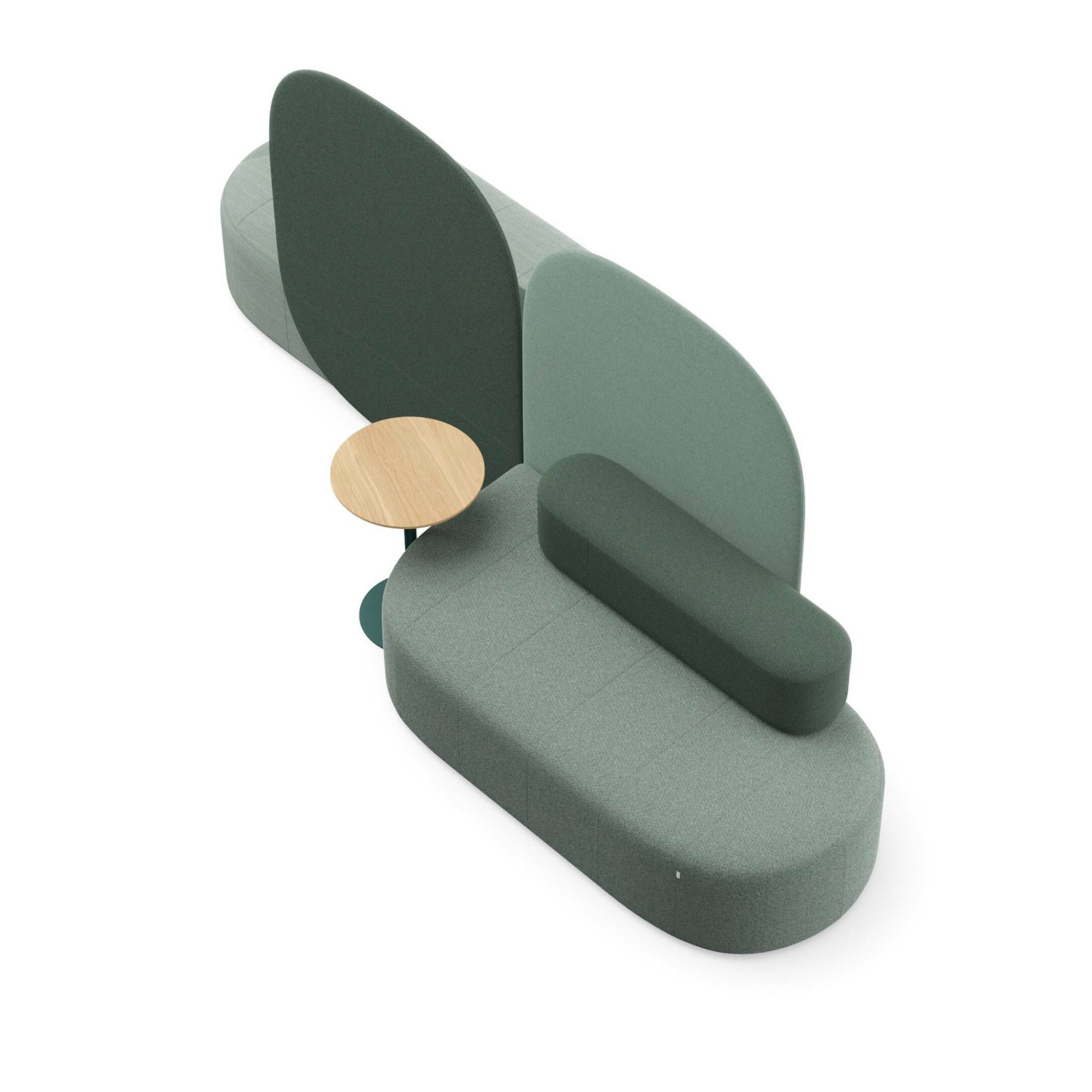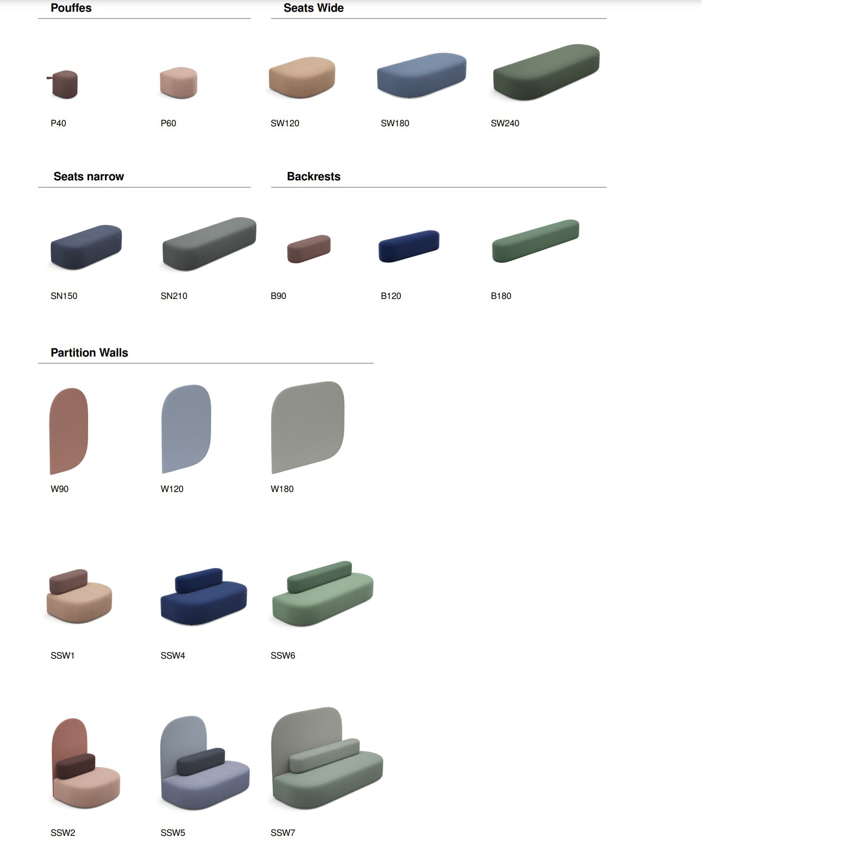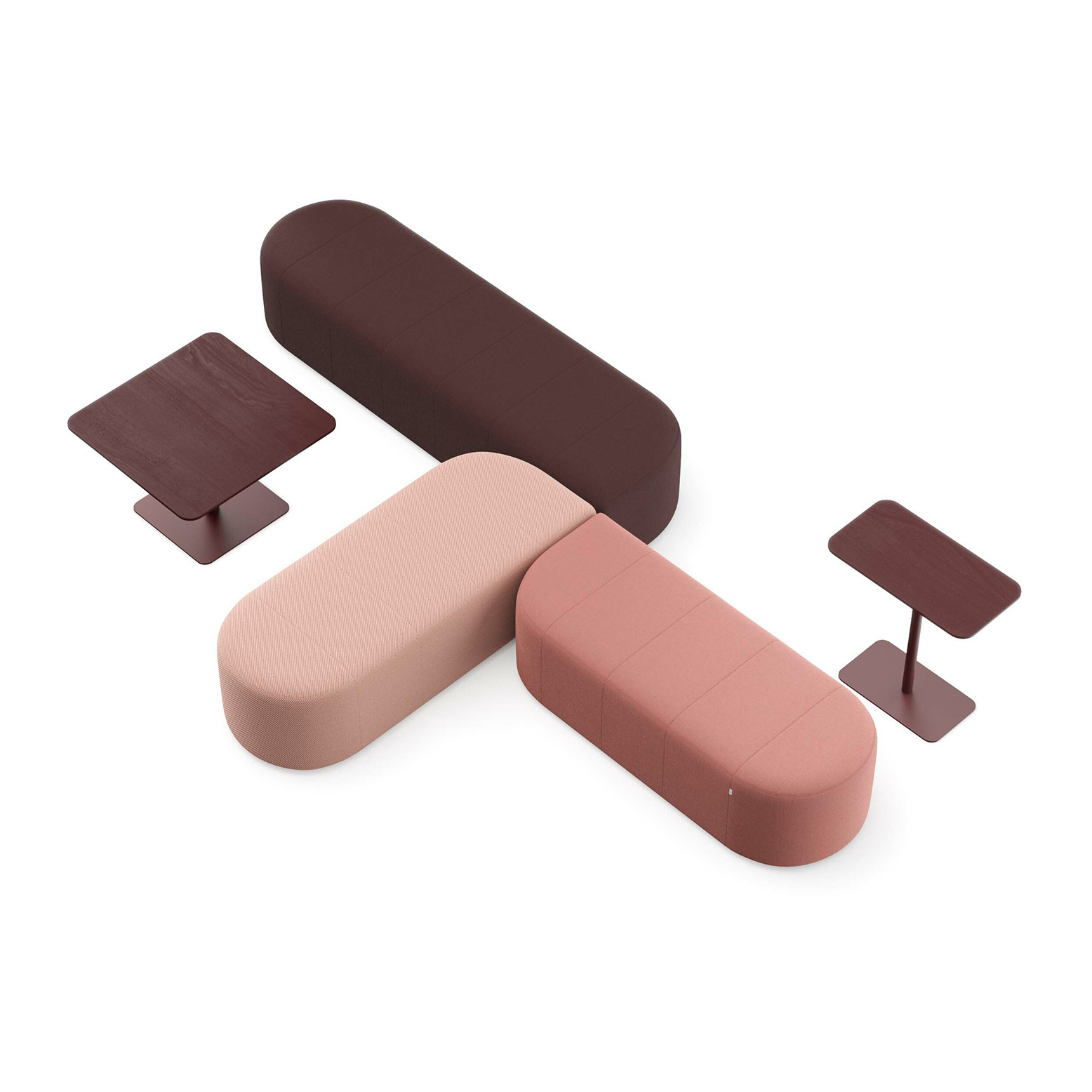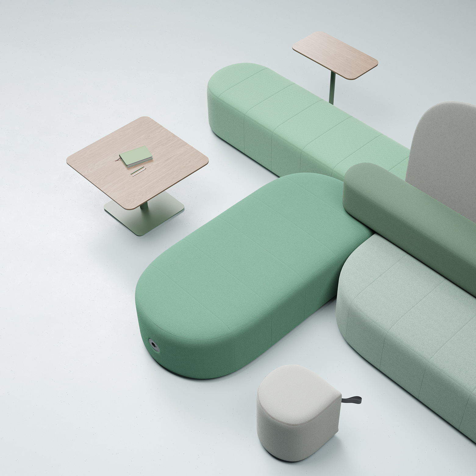 Revo-familien inkluderer sofaer, benker, skjermer, puffer og bord i myke, organiske former.
