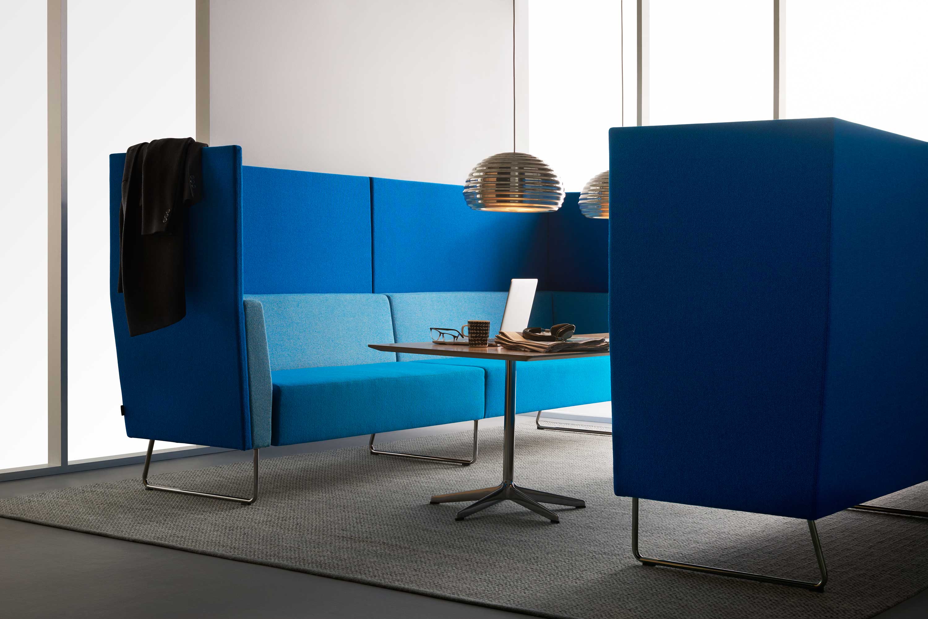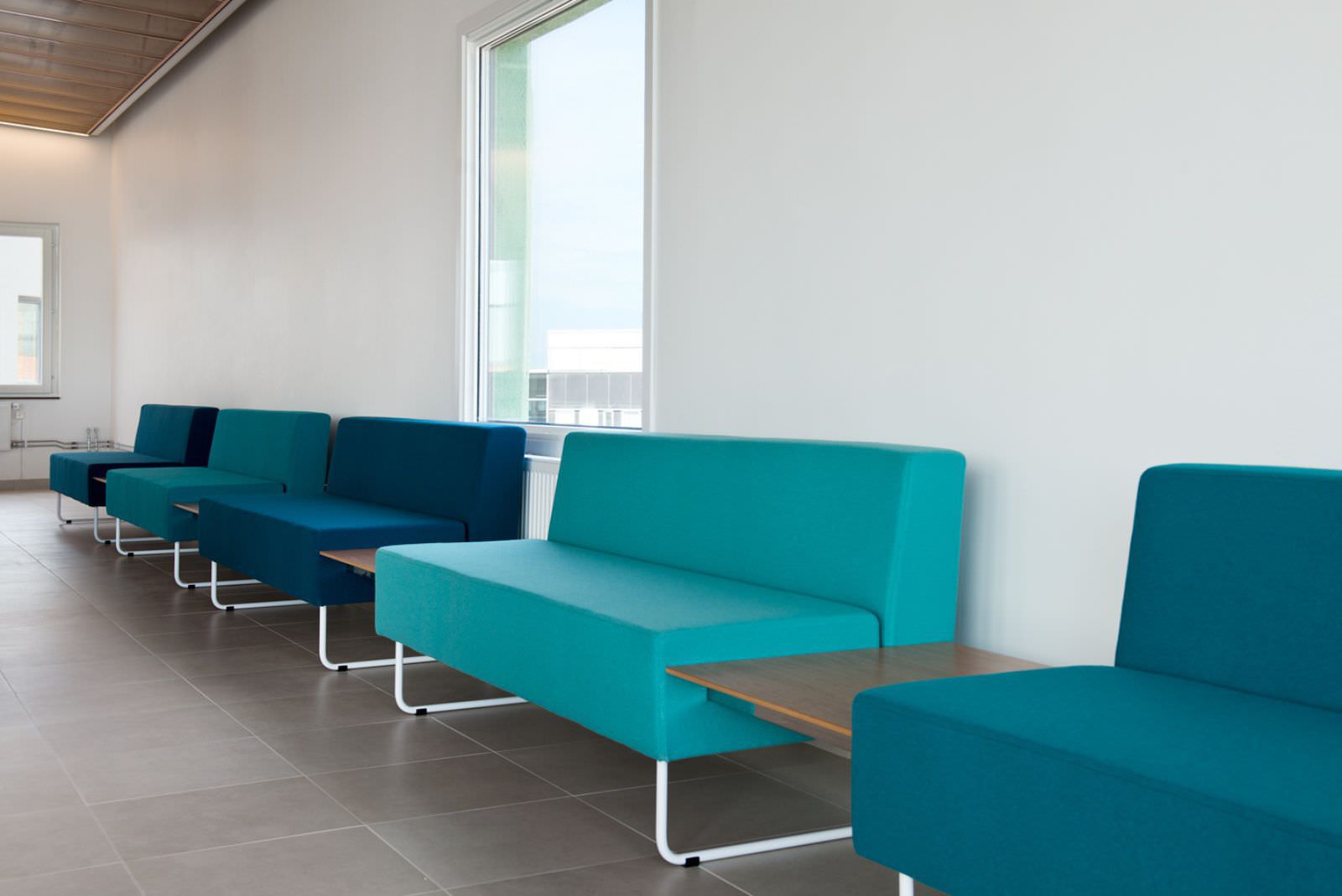 Gap Lounge / Café er et modulsystem som fås i to sittehøyder. Det er et mellomrom mellom setet og rygg for lettere renhold. Meeting har totalhøyde 130cm og fås i samme modulsystem.