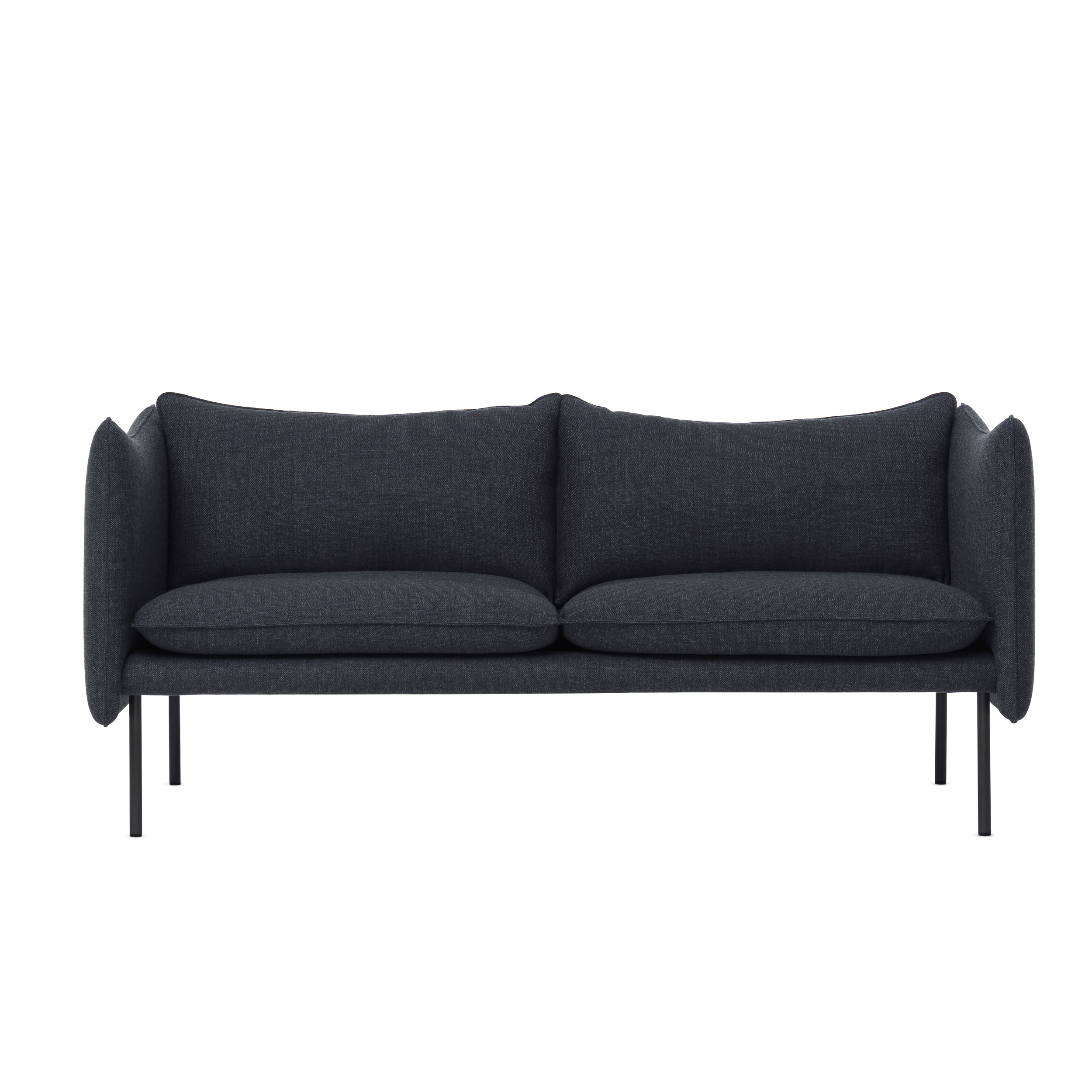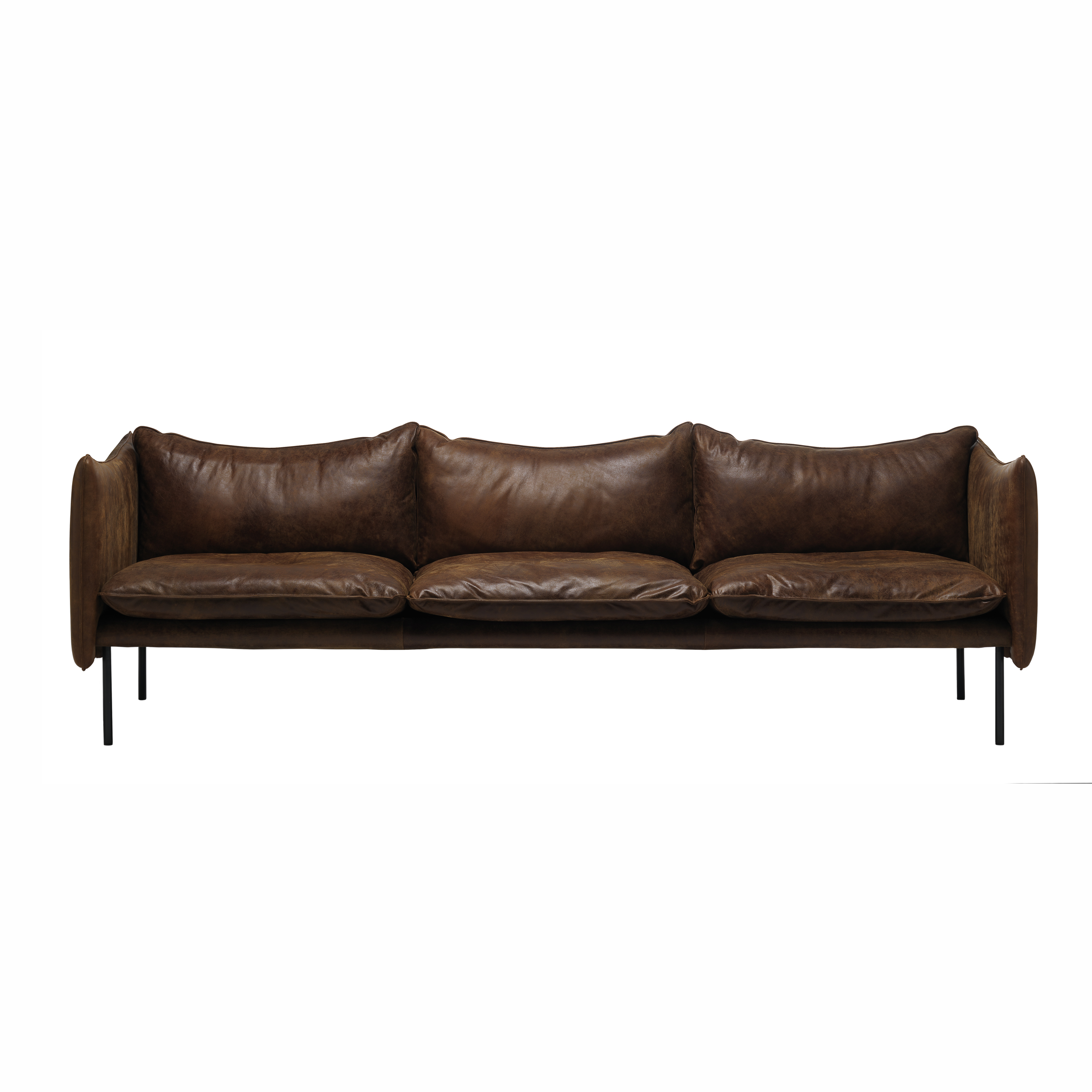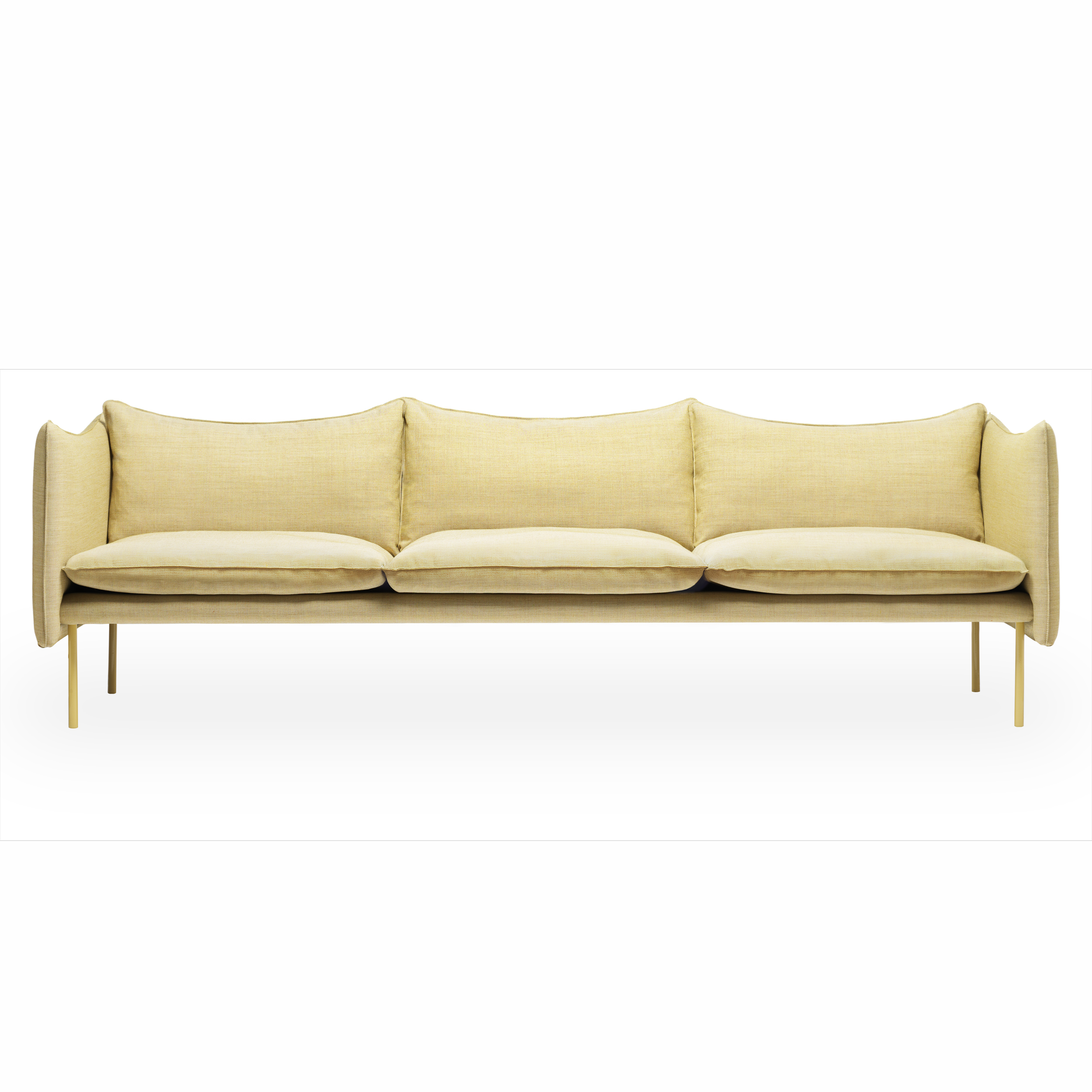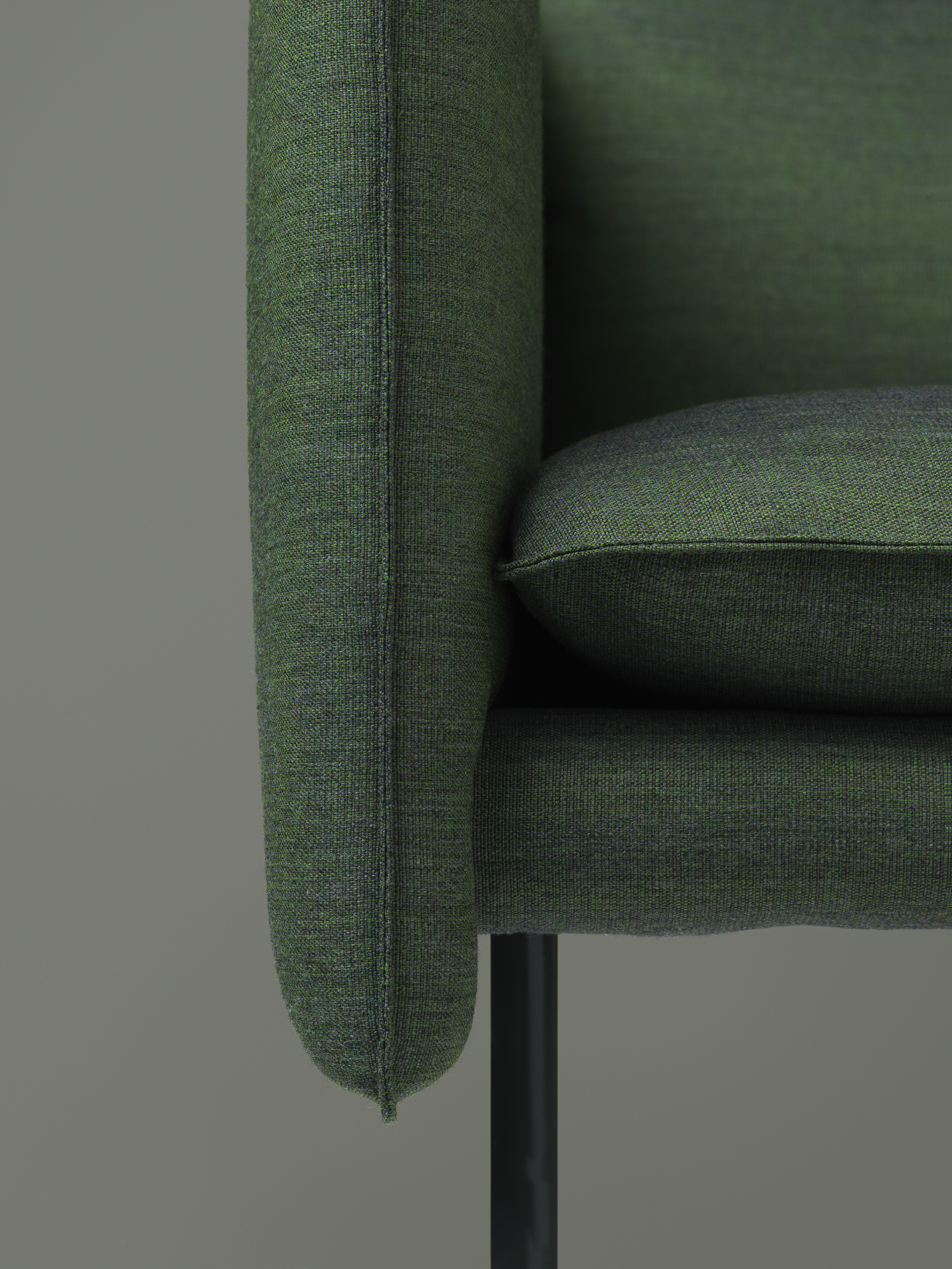 Sofa med stamme i stål og massiv bjørk. Sete med nozagfjærer og kaldskum. Rygg og armlener av kryssfiner med skum dekket med fiberpolstring. Setepute i høyelastisk kaldskum og 50% dun/fjær og 50% krympet silikonisert ballfiber. Fast trekk.