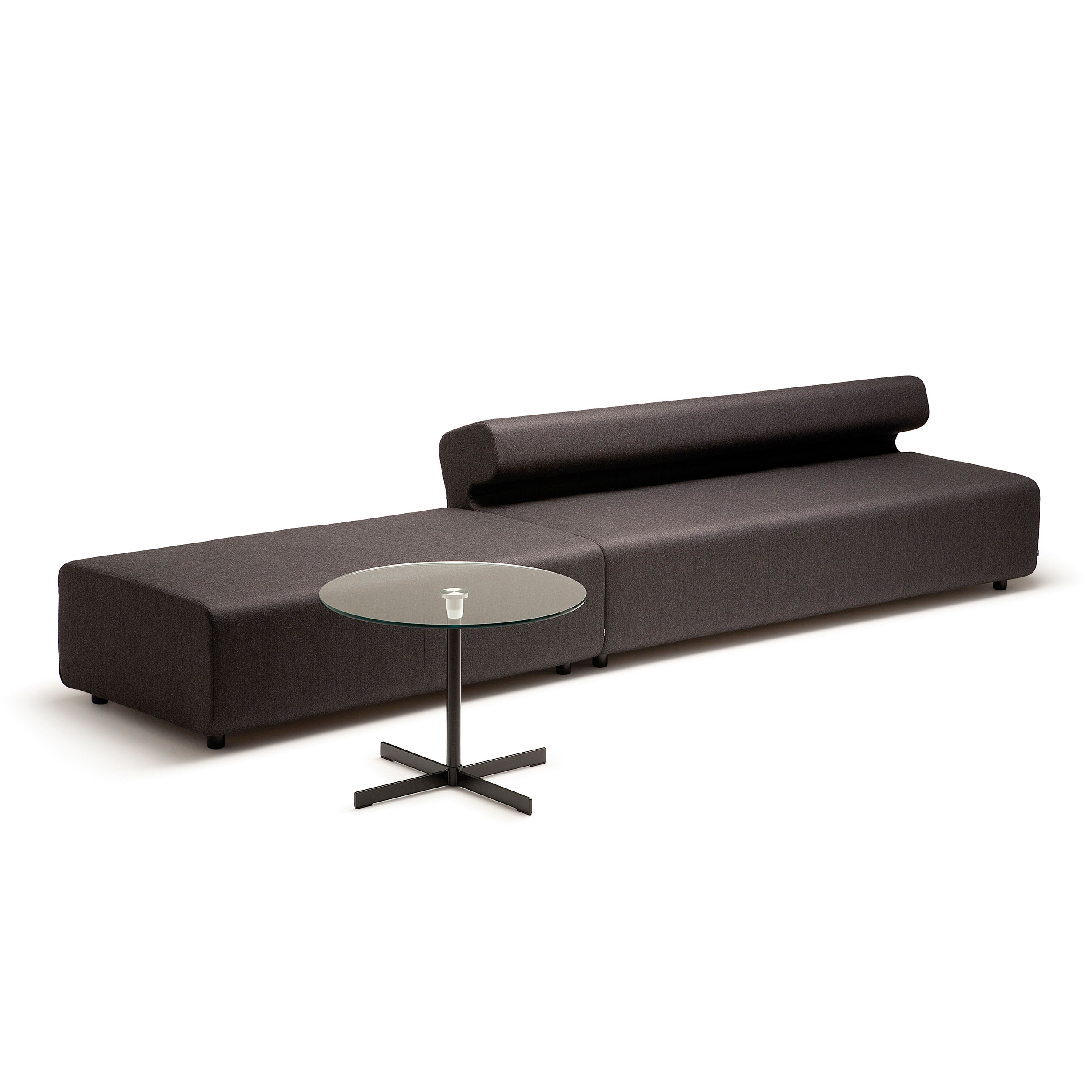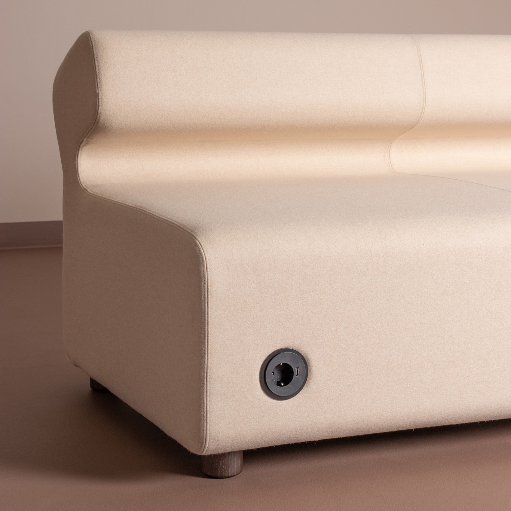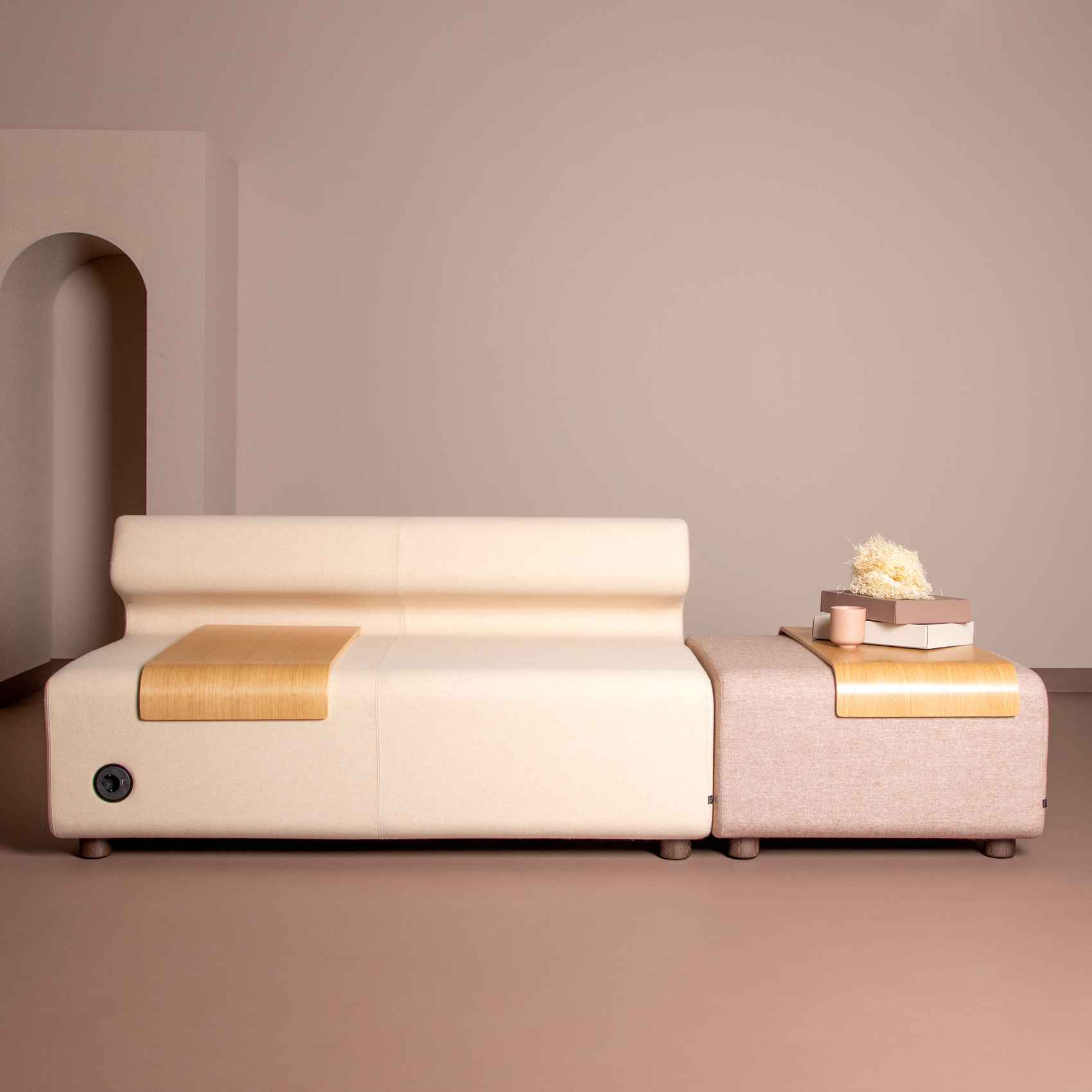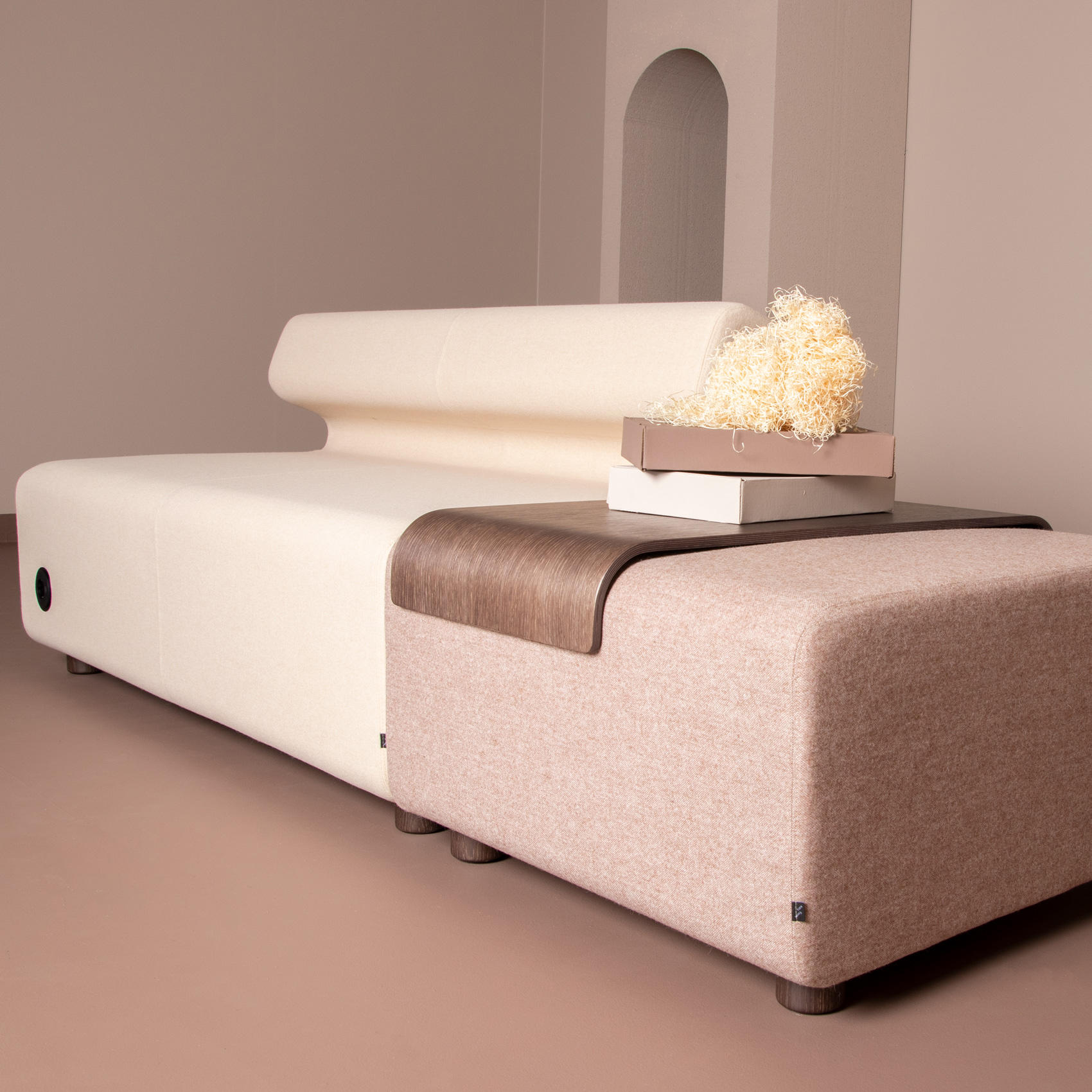 Velg også tilhørende bord i natur eik finèr som kommer i 3 varianter; smal og bredt bord til puffmodul og smalt bord til puffmodul.