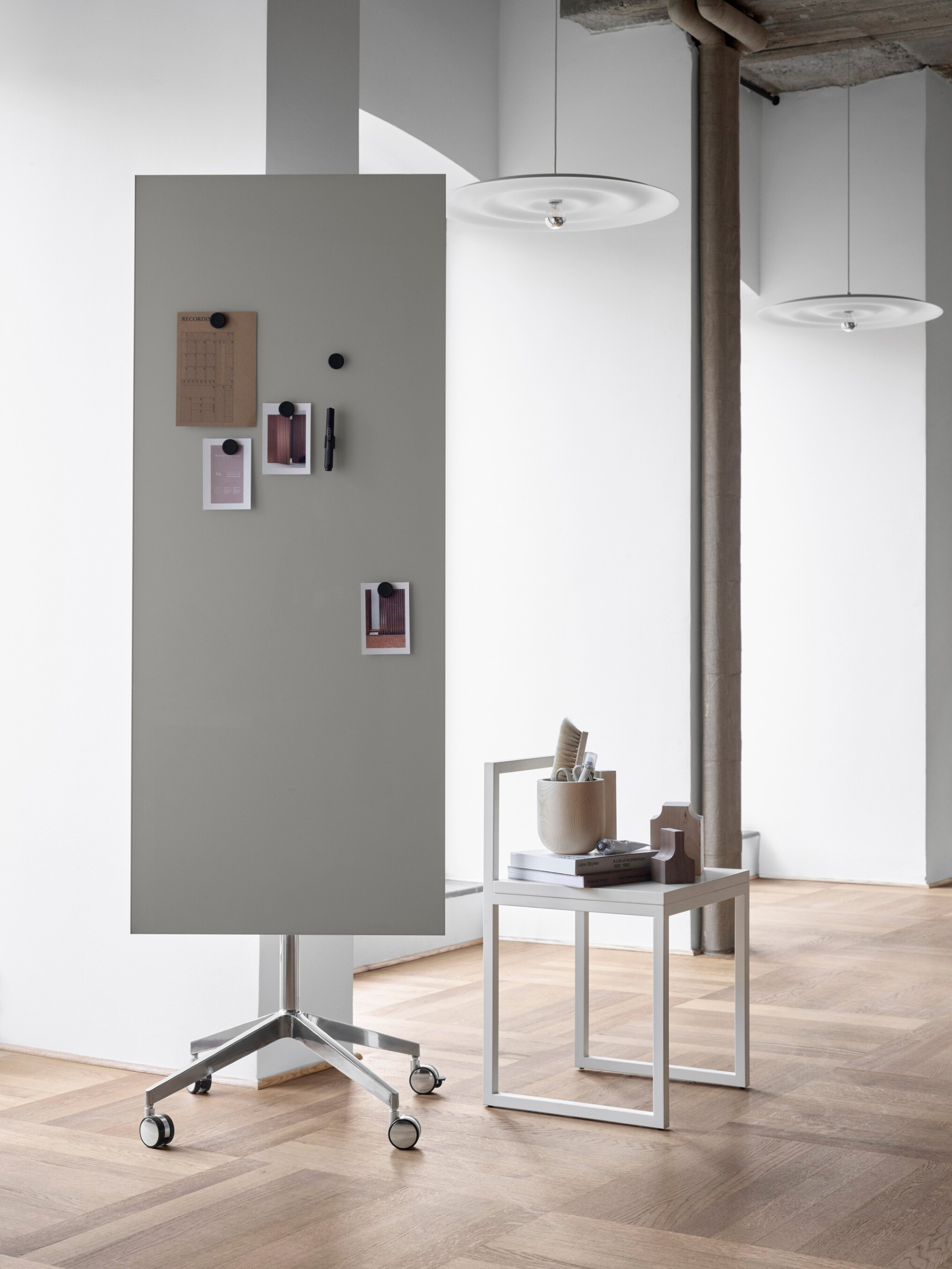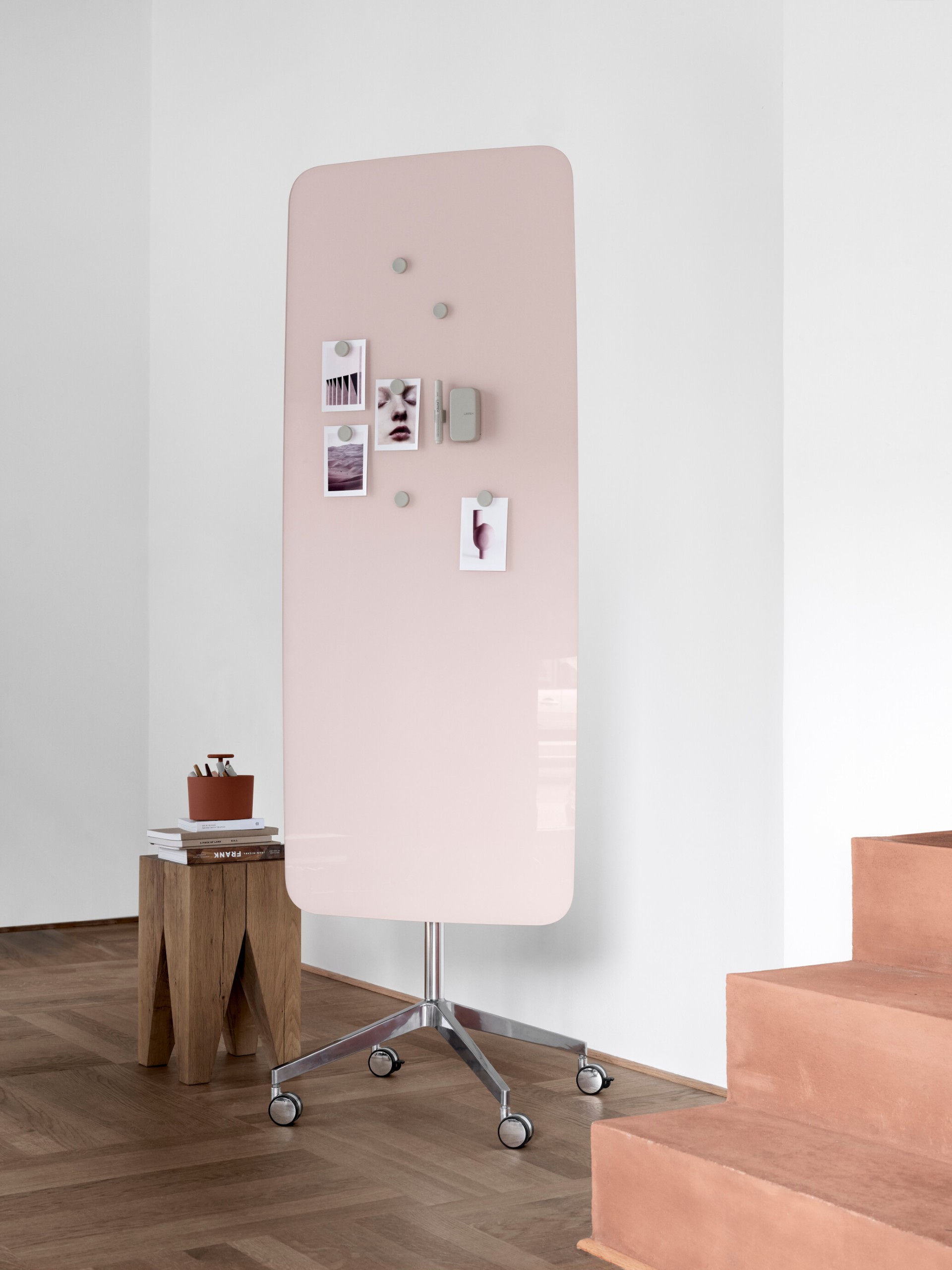 Mood Mobile er en minimalistisk, stilren og mobil skrivetavle-serie i glass. Den svevende følelsen forsterkes gjennom fraværet av ramme. Mood finnes i 24 ulike farger. Føtter og ben i polert aluminium gir et elegant uttrykk på både framside og bakside. Flip over-kroker i polert aluminium medfølger.