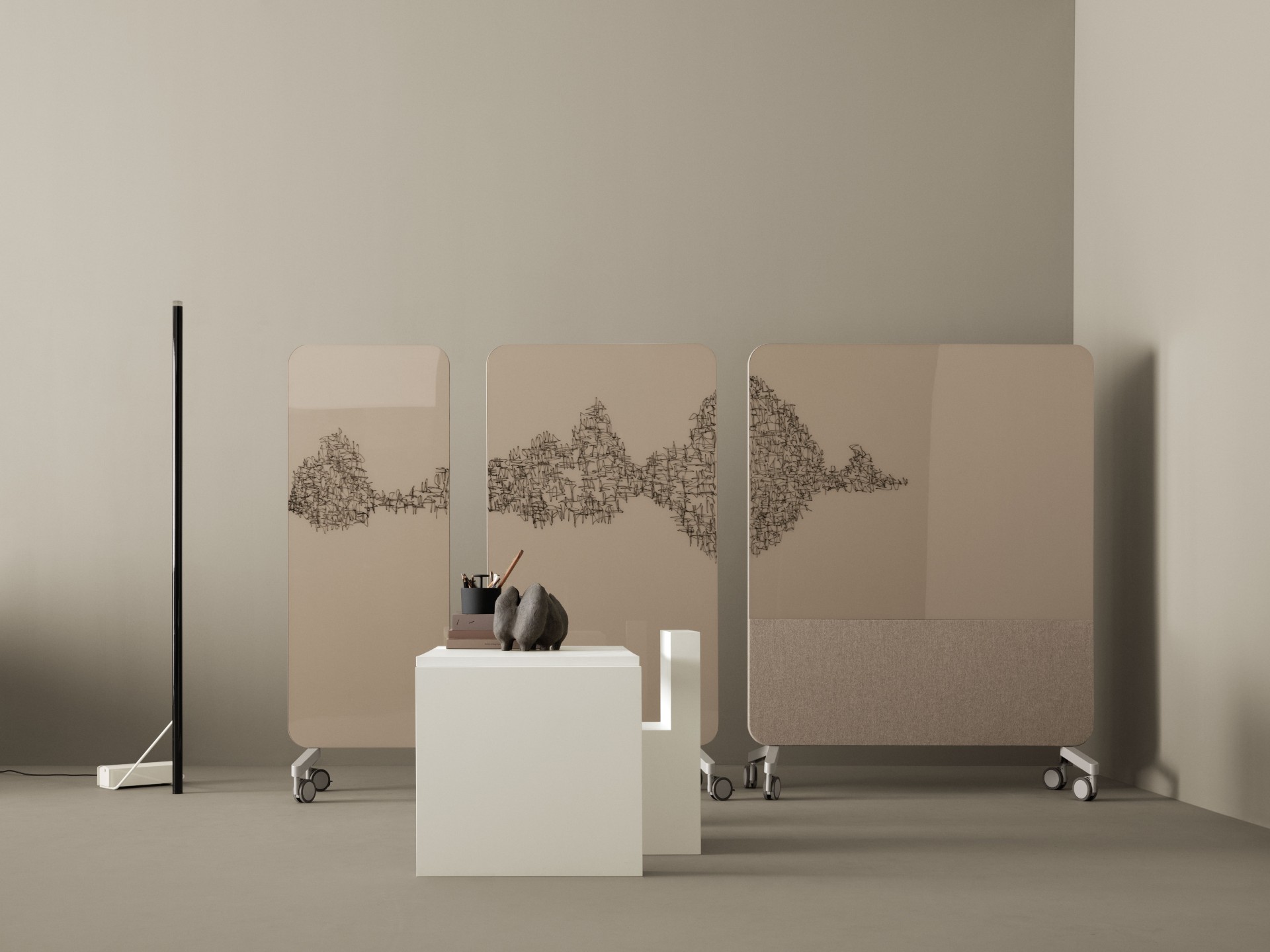 Mobil skrivetavle i glass med tekstilkledd lydabsorberende bakside. Mood Fab…