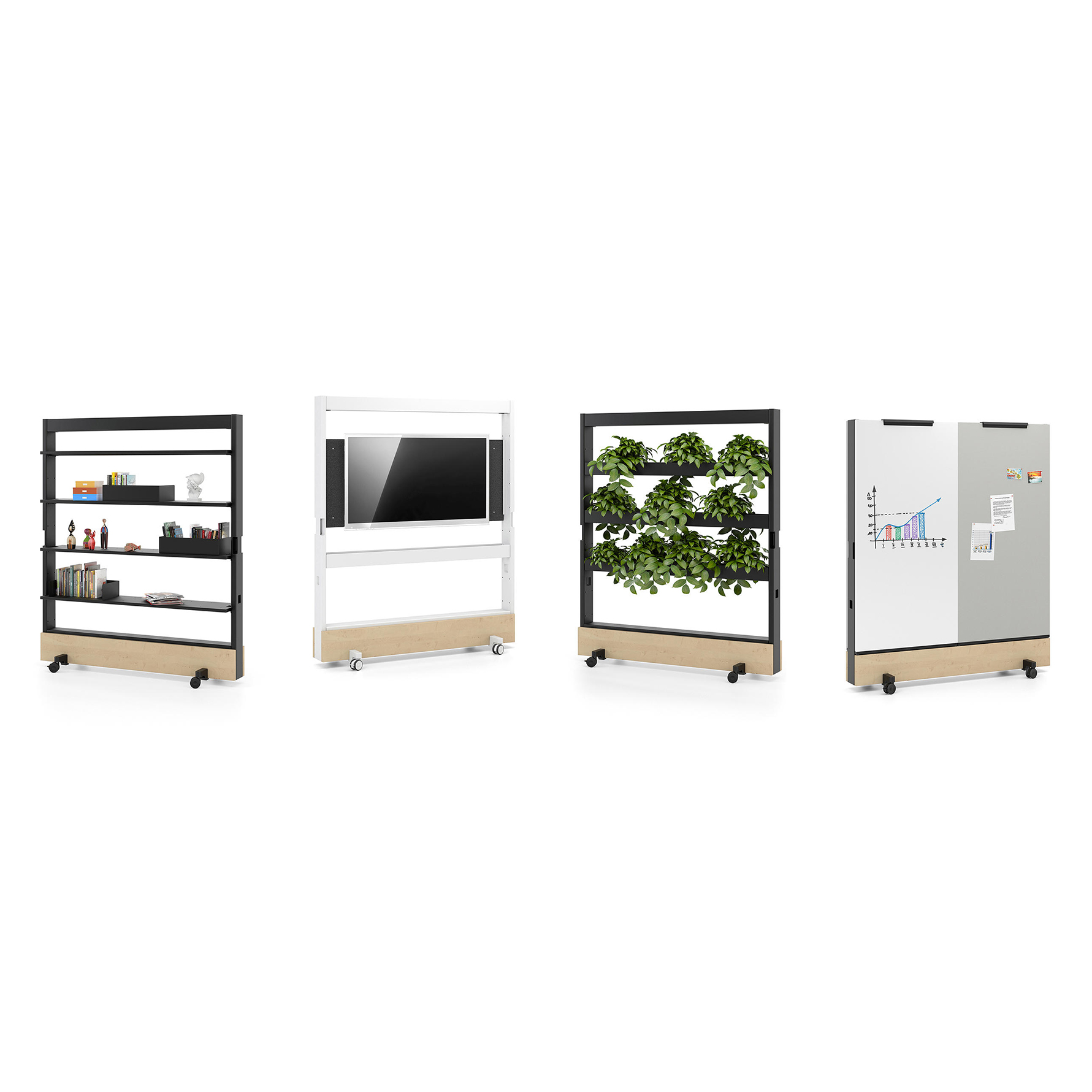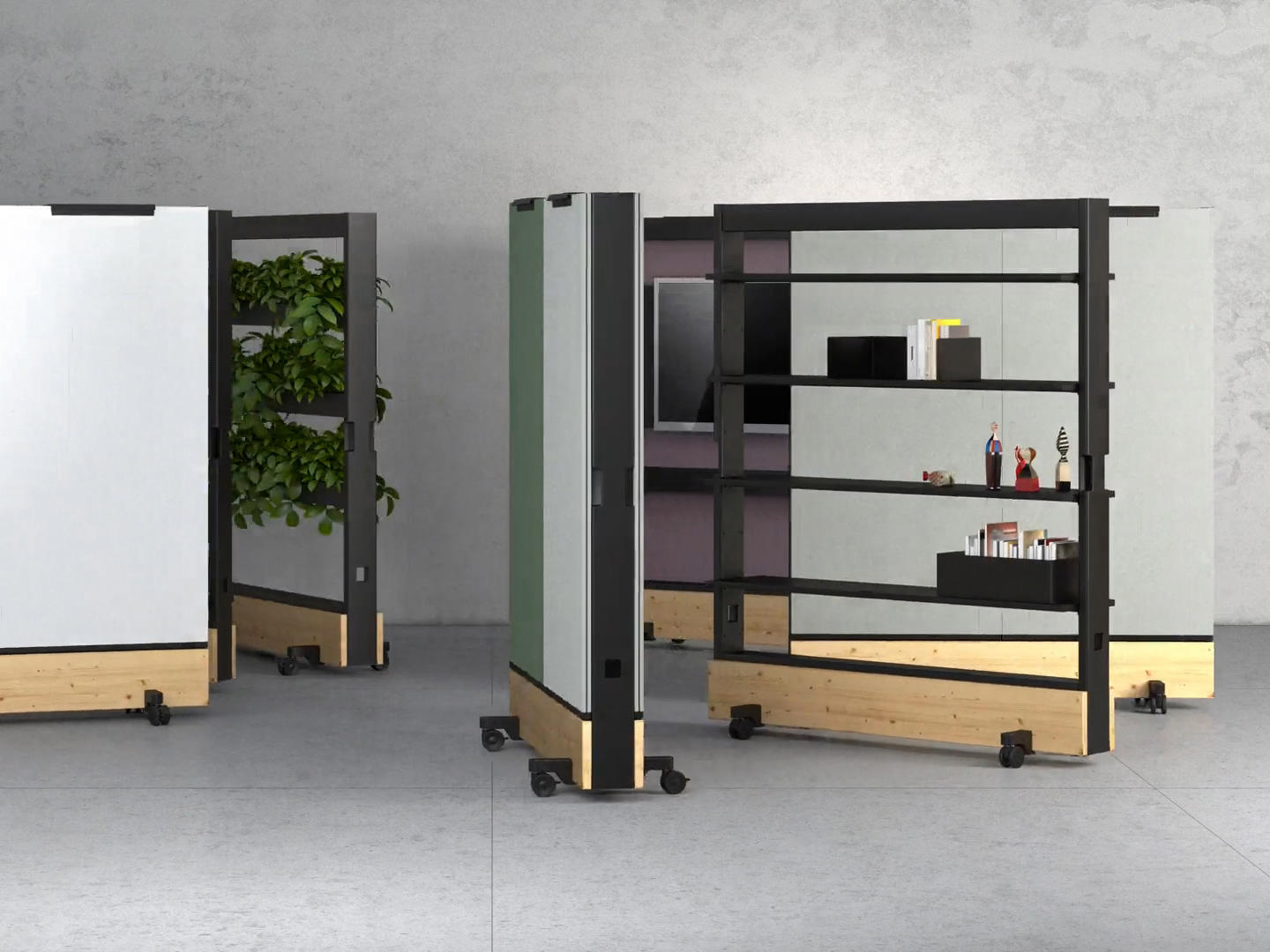 Dancing Wall består av en metallramme som kan utstyres i ulike konfigurasjoner: som bokhylle, TV-enhet, garderobe, plantevegg, eller som romdeler med flyttbare magnetiske tavler og tavler.