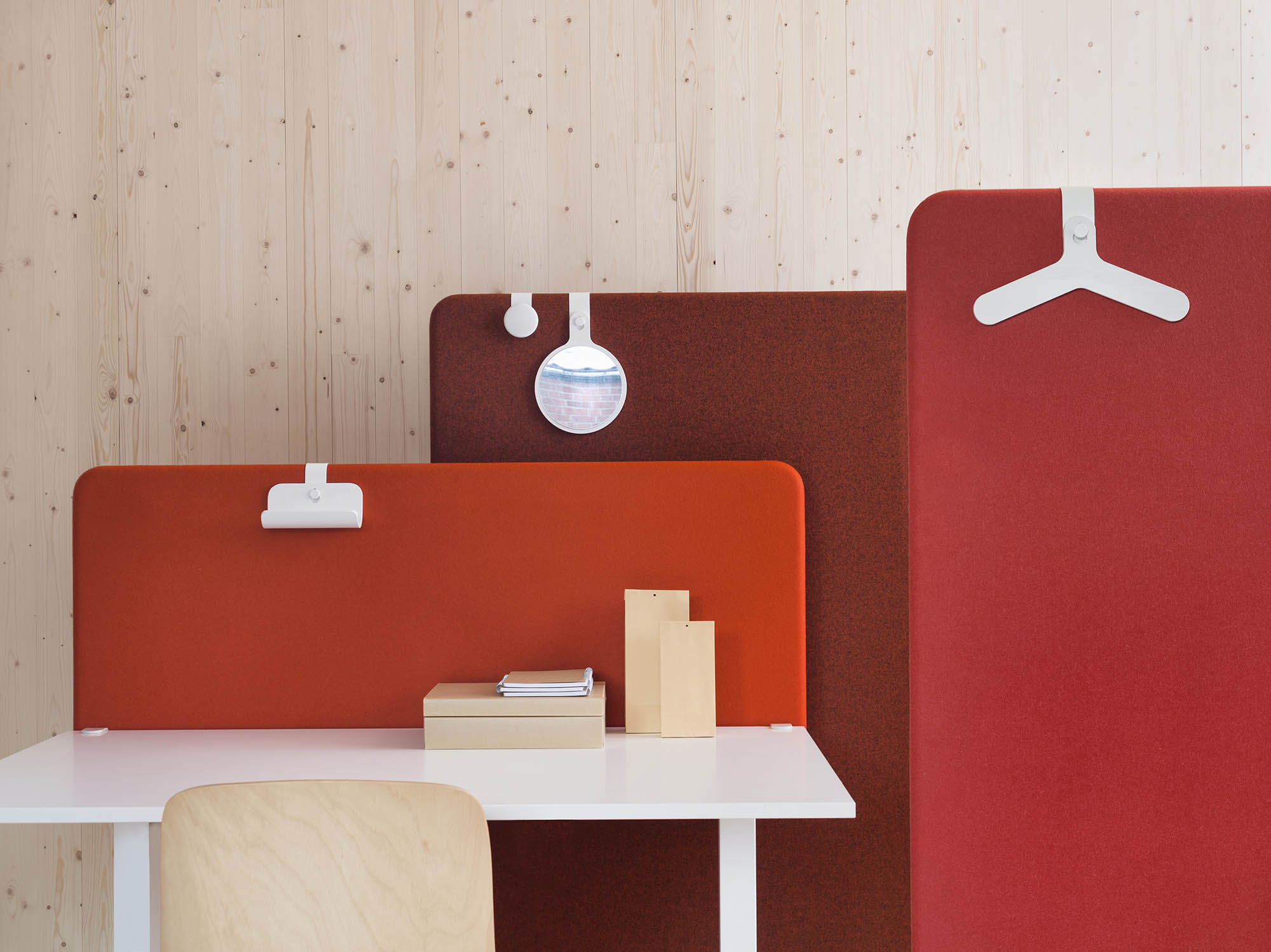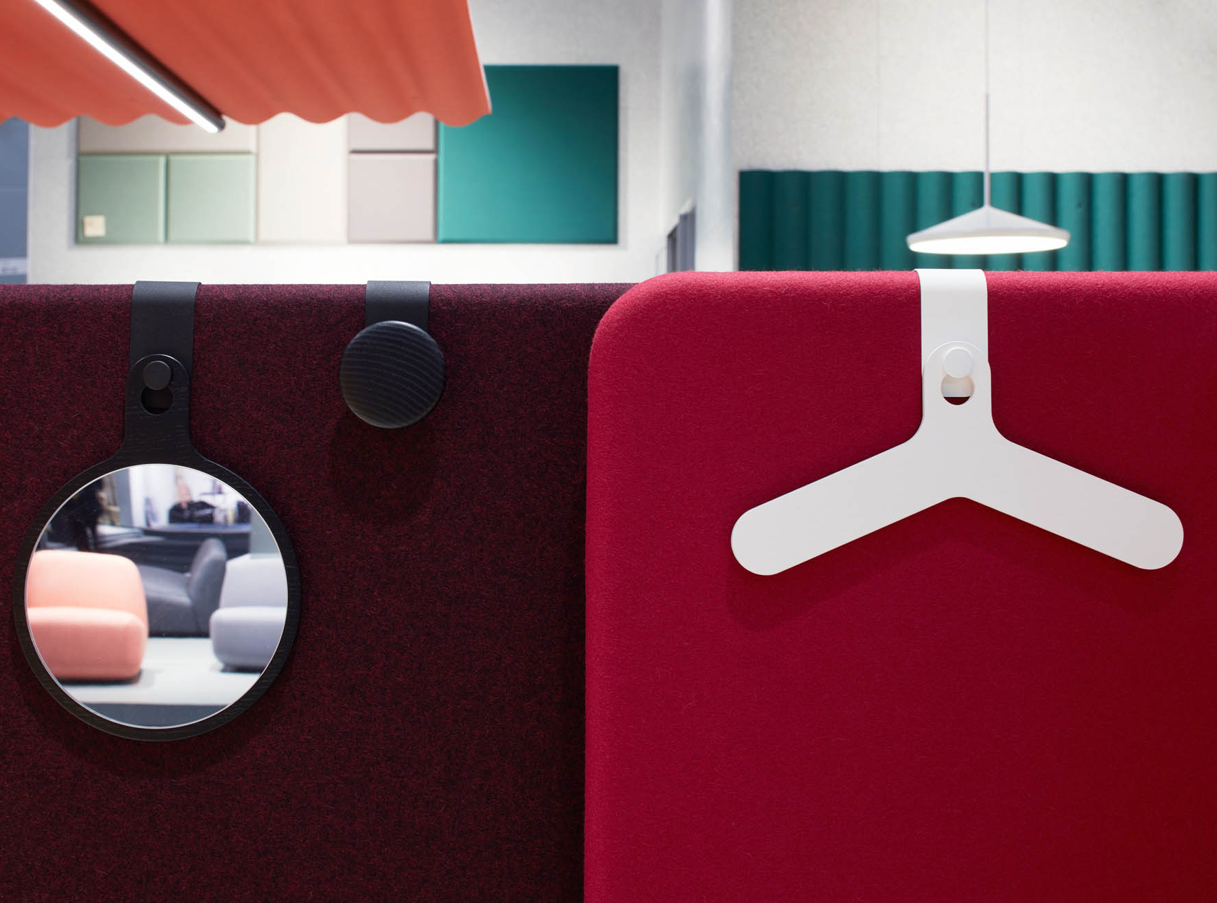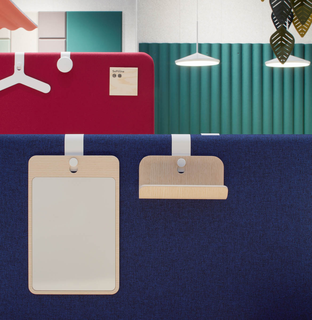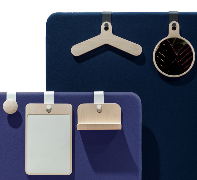 Designeren Nina Jobs nye serie av accessoarer kan anvendes til alla skjermer fra Abstracta – uansett form og dybde. Formspråket er mykt og lekent. Her inngår små skrivetavler, speil, pennehylle, kleshenger og knagger, som enkelt henges på skjermen. Tilbehøret er i ask; natur, sort- og hvitbeis.