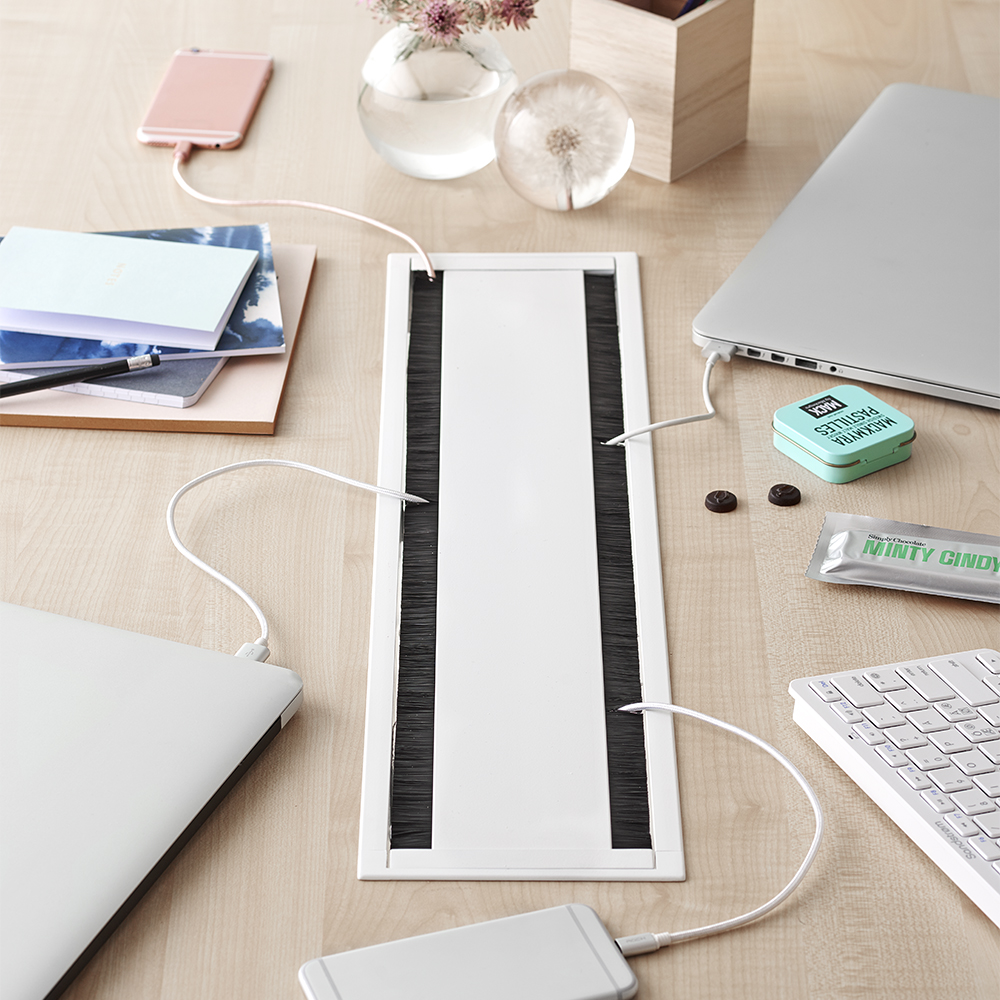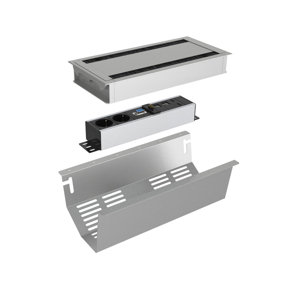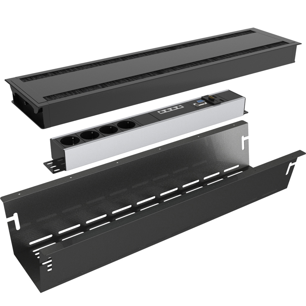 Komplett pakke for en stilig og funksjonell løsning på konferansebordet. Gjør det enkelt å installere et komplett sett med produkter i bordet. Velg mellom sort, hvit eller alu.