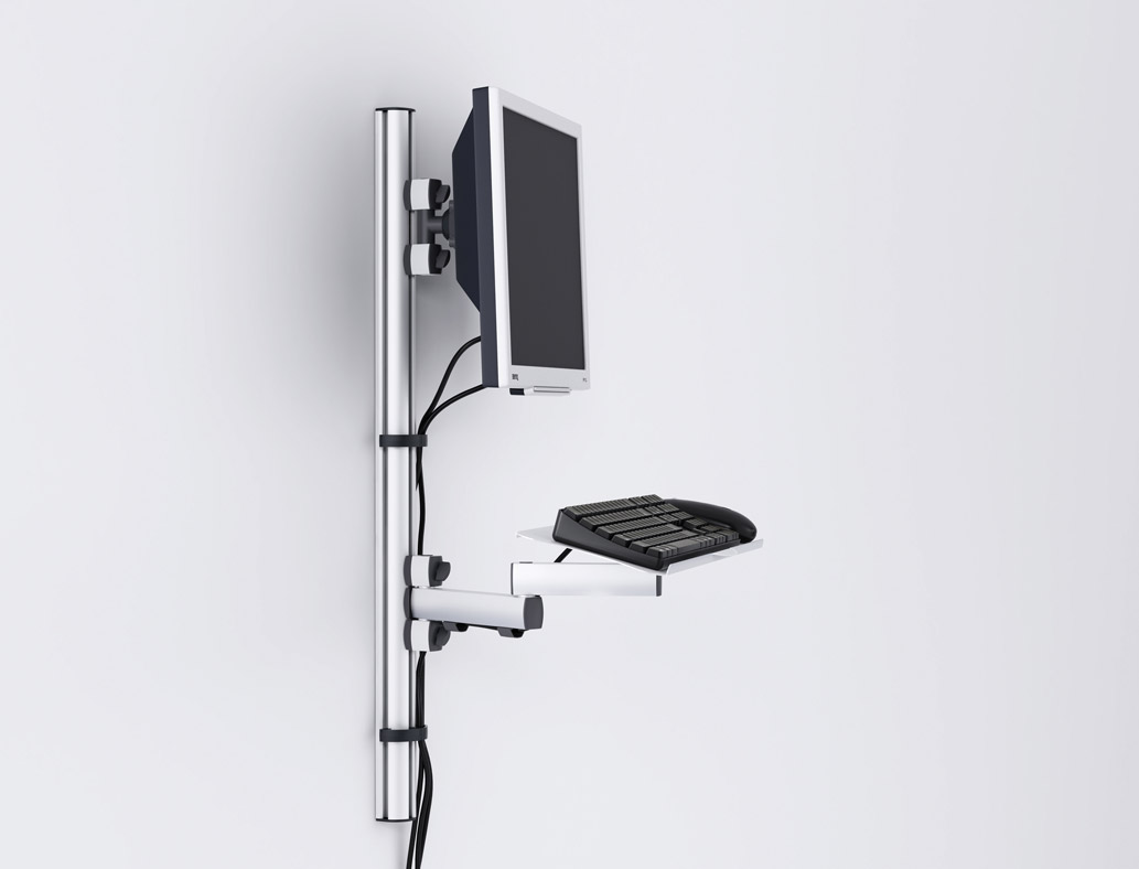 NOVUS TSS løsninger for skjerm med tastatur på vegg eller stolpe. Laptop på vegg eller stolpe. LiftTEC armer kombinert med tastaturbord. Flere mulige løsninger fra NOVUS fleksible systemer.