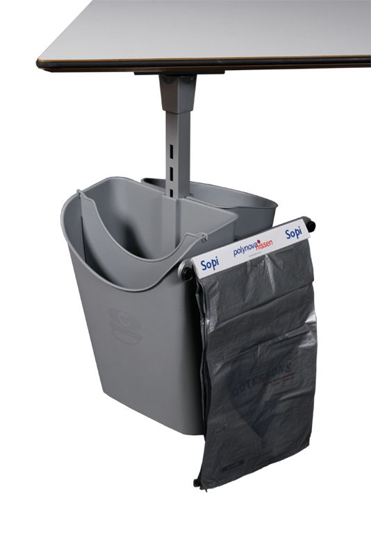 En roterende gjenvinningstasjon som tar liten plass under skrivebordet og frigjør plass på gulvet. Patentert konstruksjon som bygger på en roterende aksle med avtagbare behållere for papir og øvrig avfall. Finnes med eller uten glideskinne. Fås i ulike modeller som SetUpit standard, SetUpit 3-sortering, SetUpit med lokk og SetUpit med Sopi poser. Farger: hvit, svart og sølv.