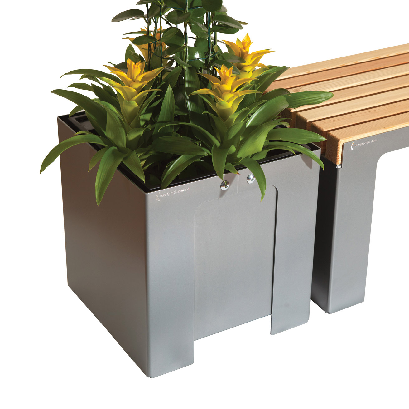 Nobel plantekasse er i pulverlakkert stål. Kan leveres i andre størrelser og andre former, samt lakkeres i andre farger. Tilpasses eksisterende selvvanningsinsatser i plast.