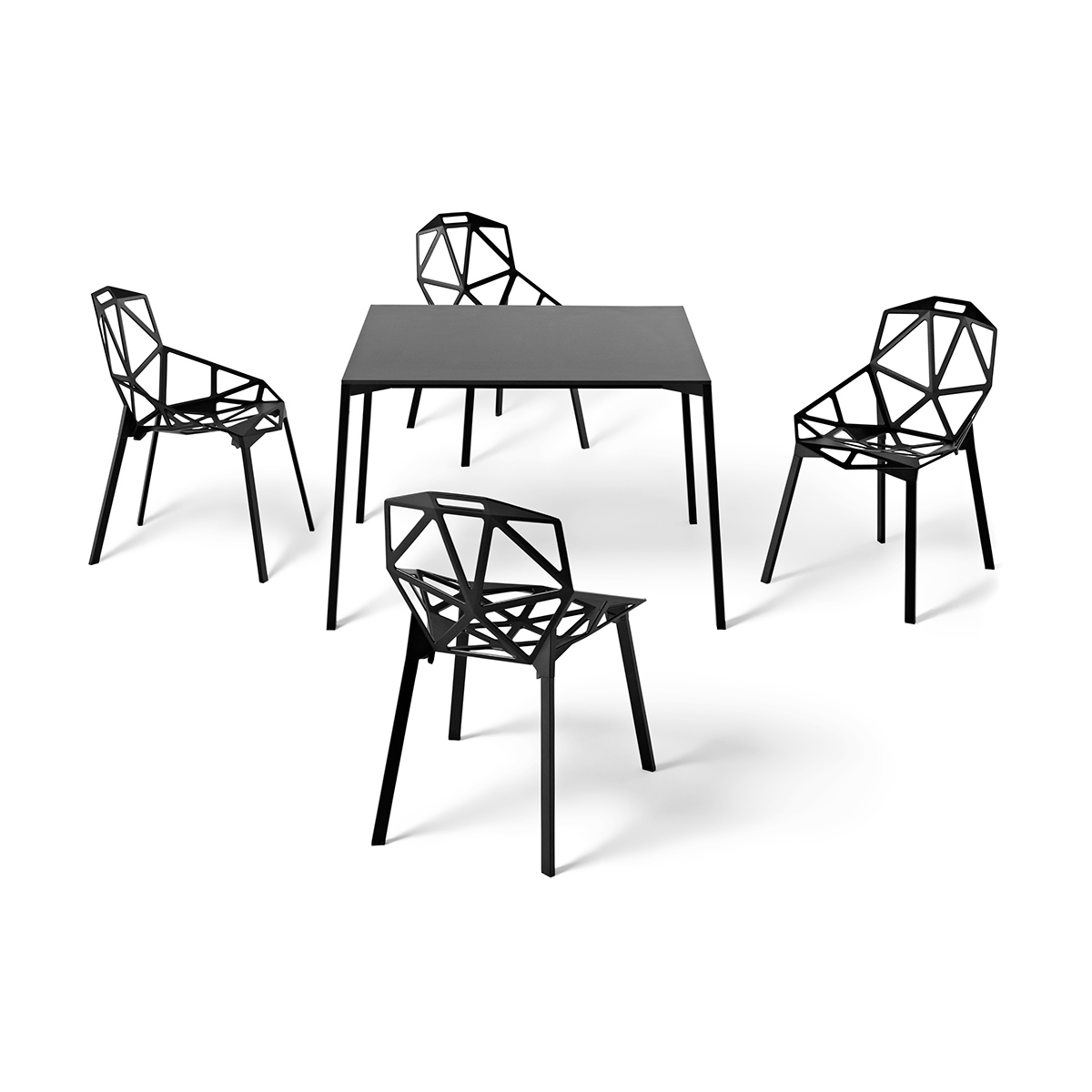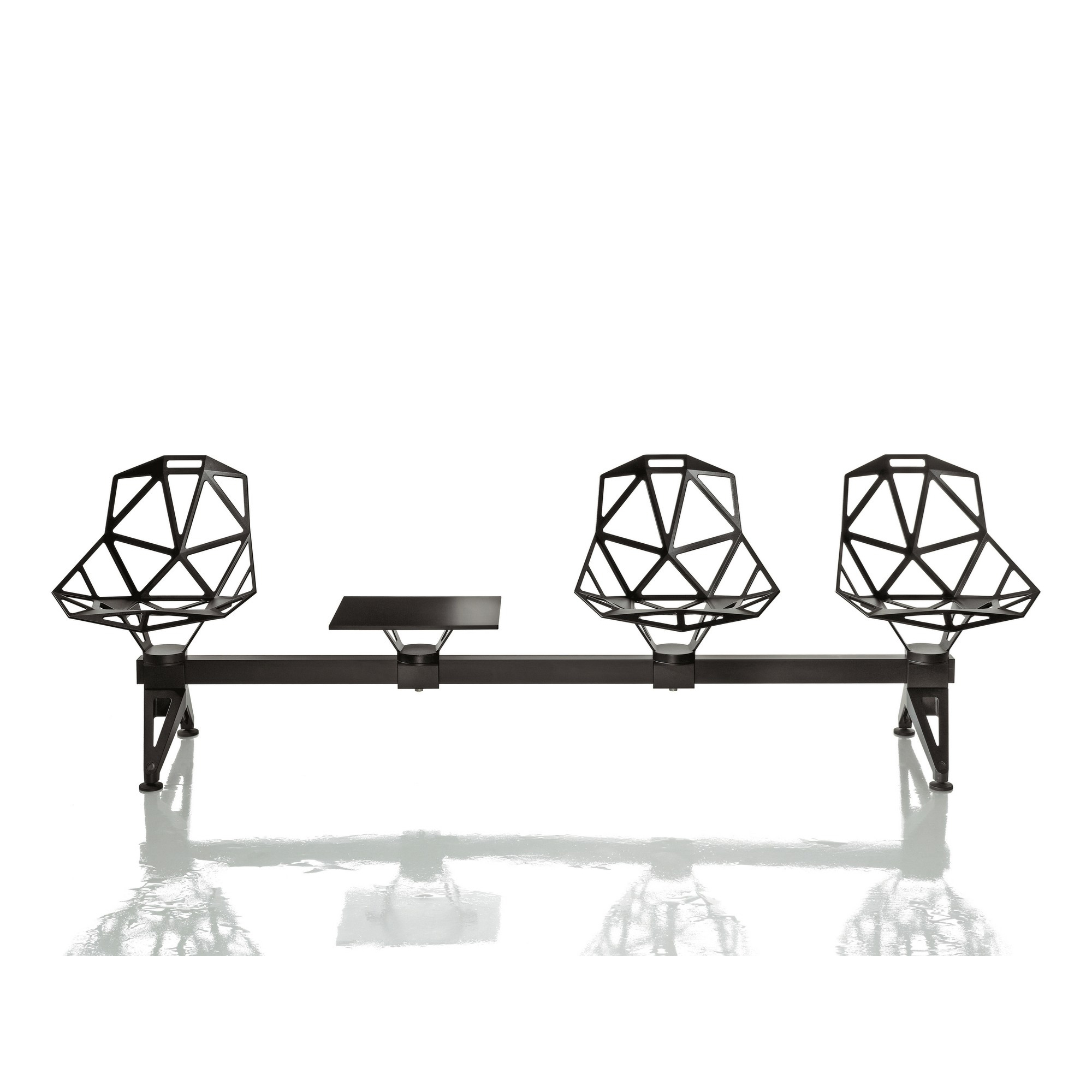 Leveres i to utgaver på ben i aluminium- med farget sete og blanke ben, eller sort sete og sorte ben. Pute til sete og / eller rygg bestilles separat. Begge versjonene er flammeresistente.