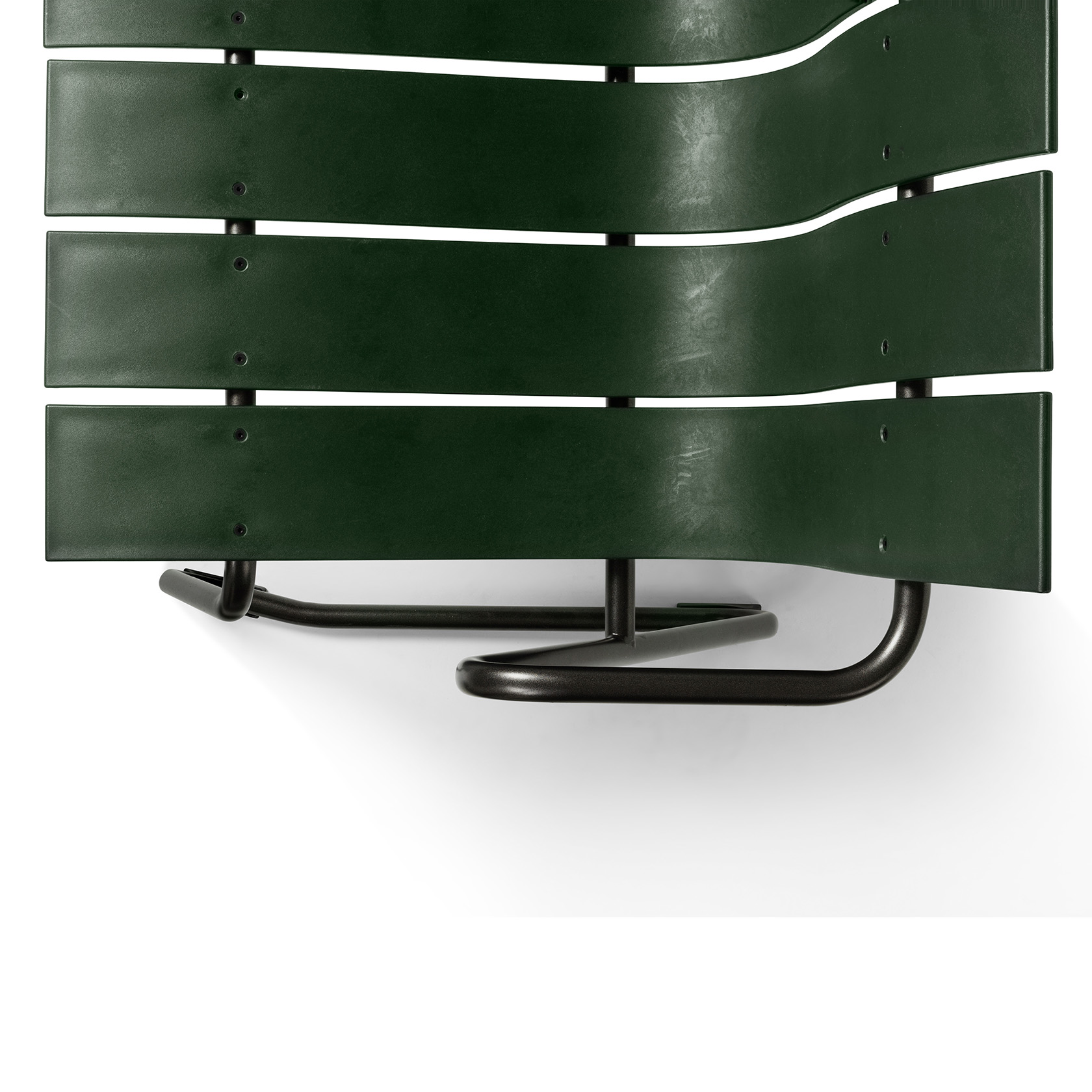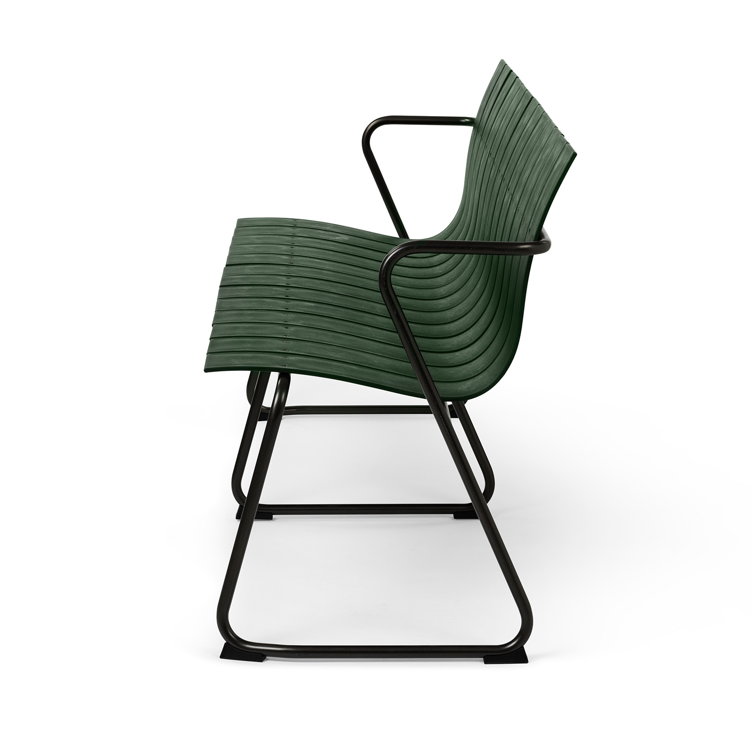 Grønn: Lameller laget av kasserte ølfat blandet med resirkulert hardplast. En benk inneholder 3640g ølfat plastavfall.