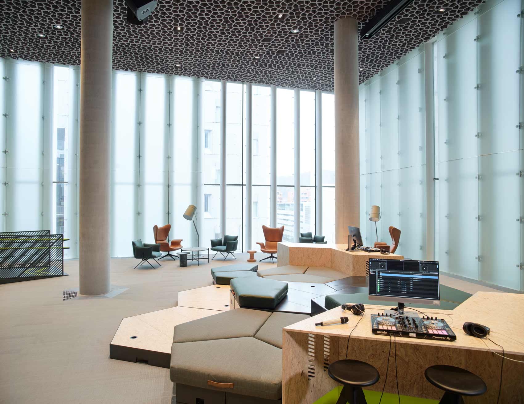 Bygget er tilrettelagt for mest aktivitet i plan én, som avtar mot plan fem som er tiltenkt roligere soner for konsentrasjon.