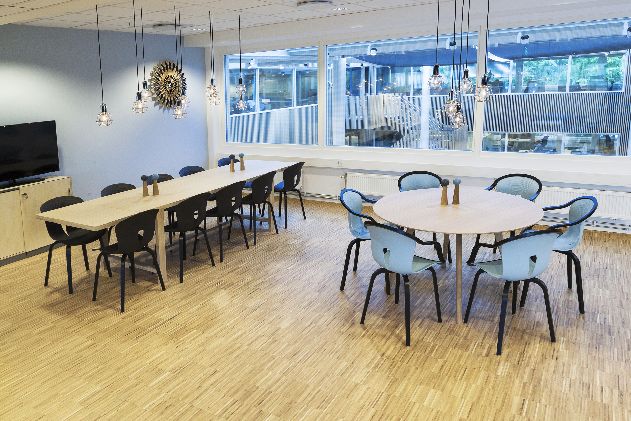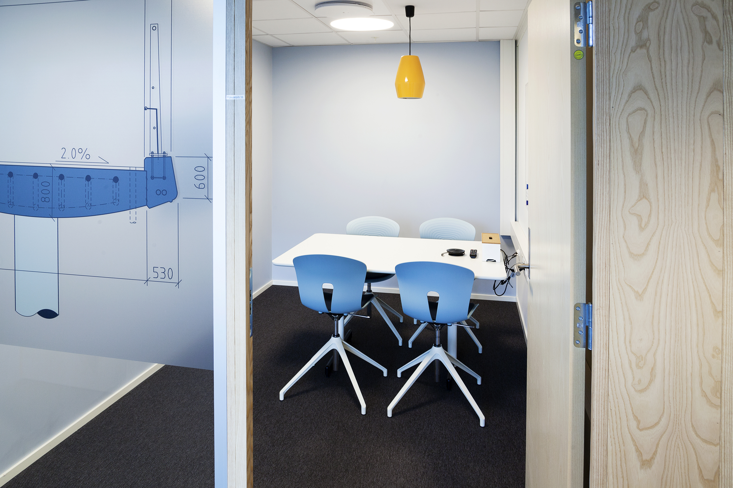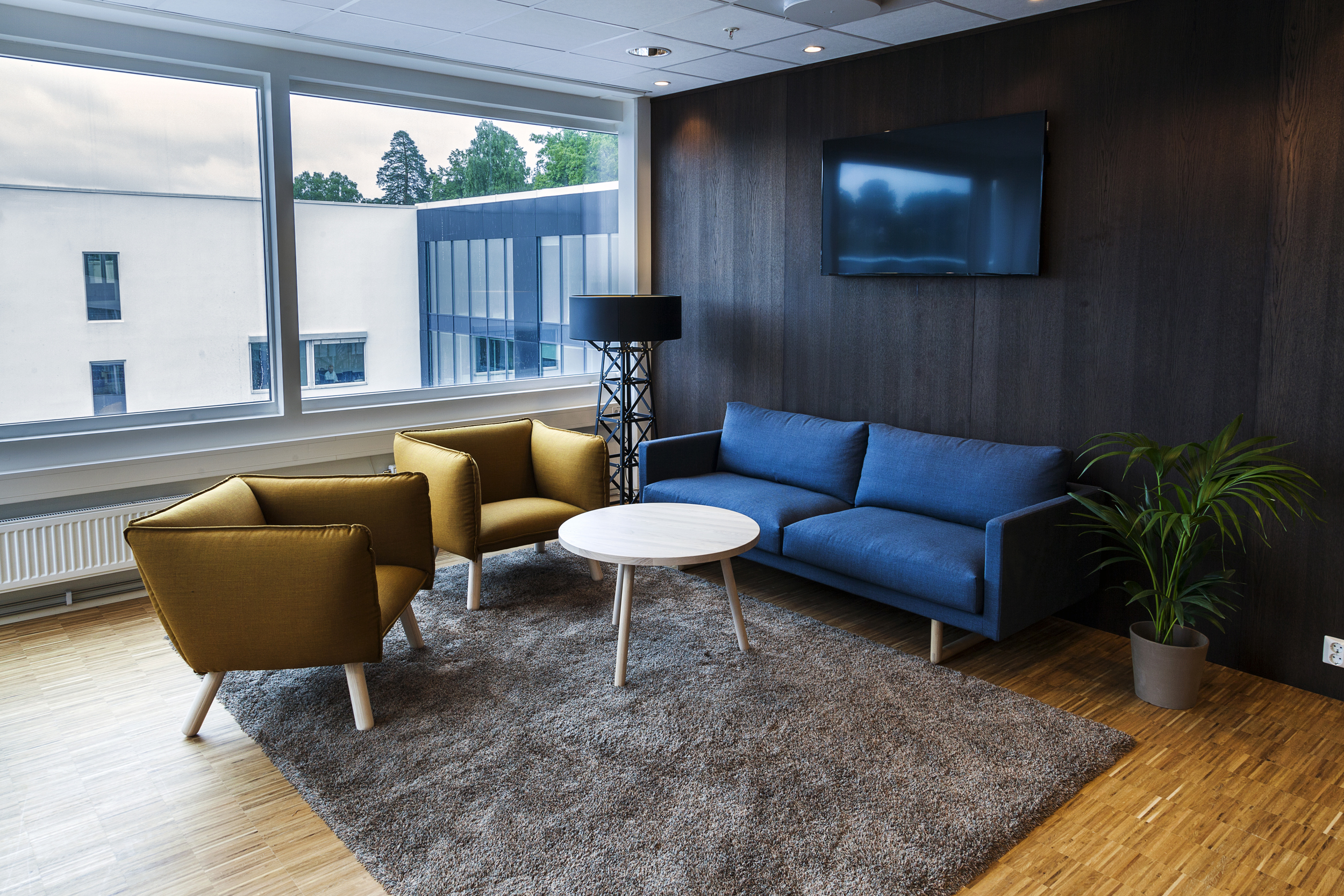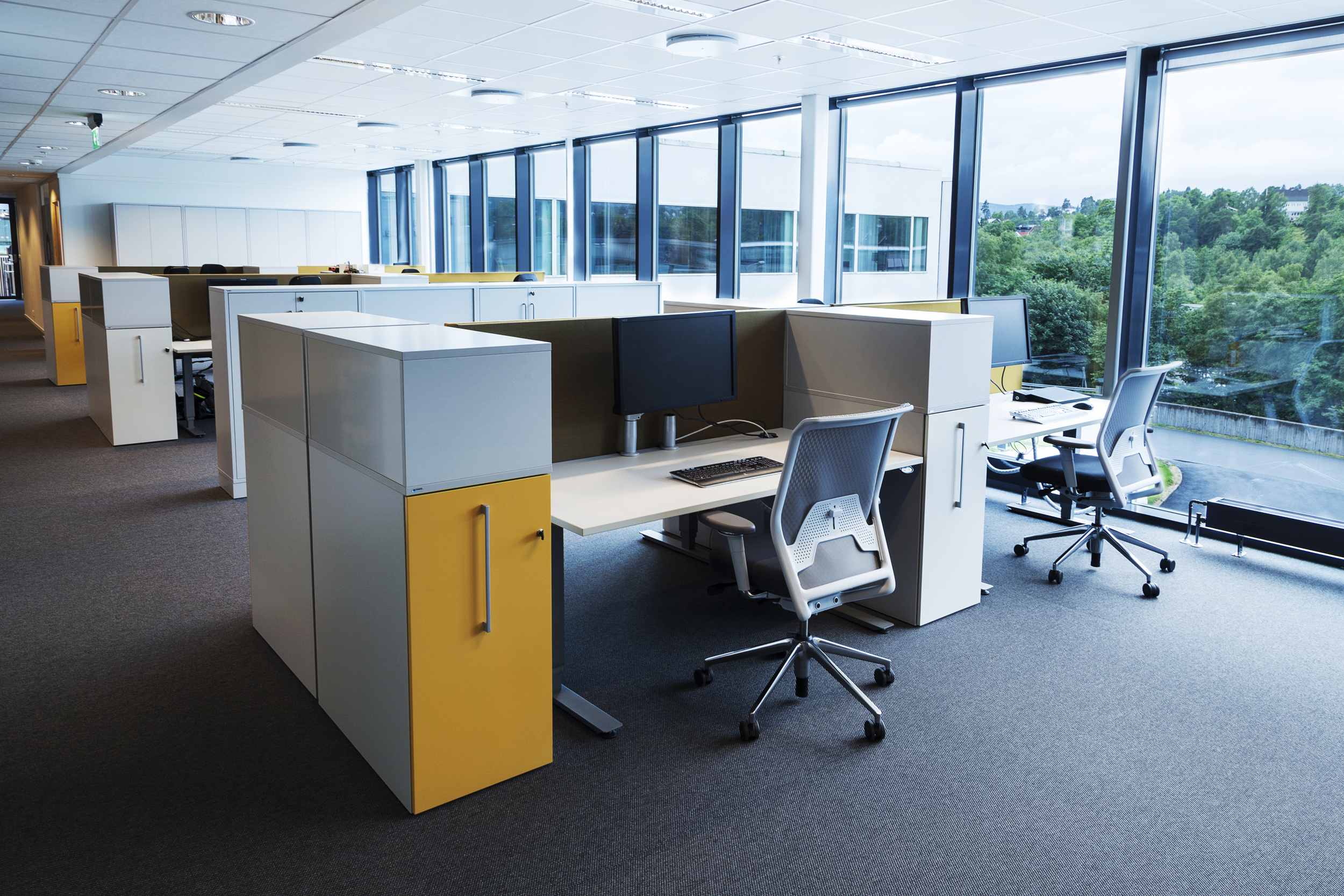 Vi leverte blant annet arbeidsplasser til åpne landskap, personlig og felles oppbevaring, møtebord og stoler til konferanserom og stillerom. Vi leverte også dekorativ belysning og avskjerming, samt tepper i sosiale soner.