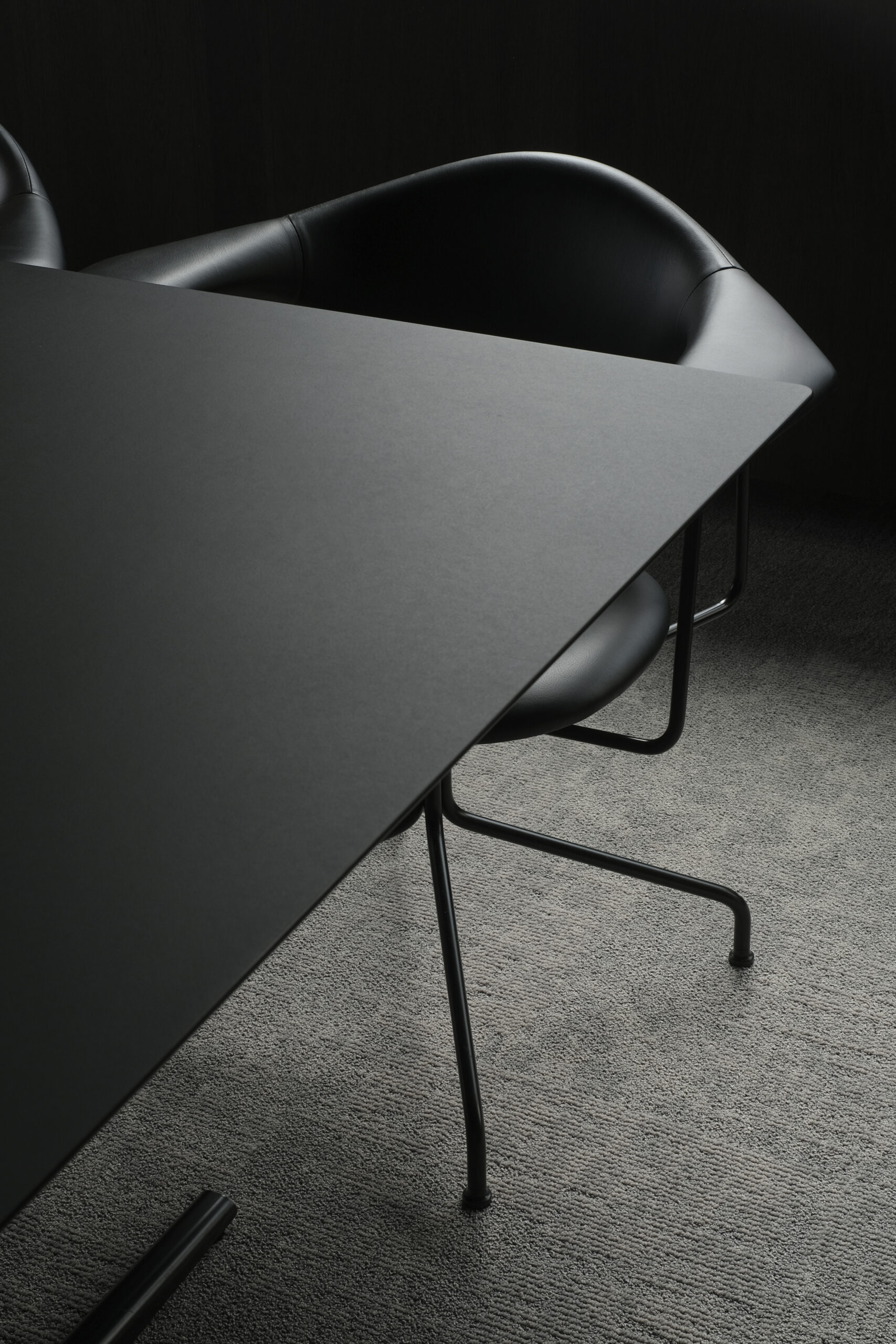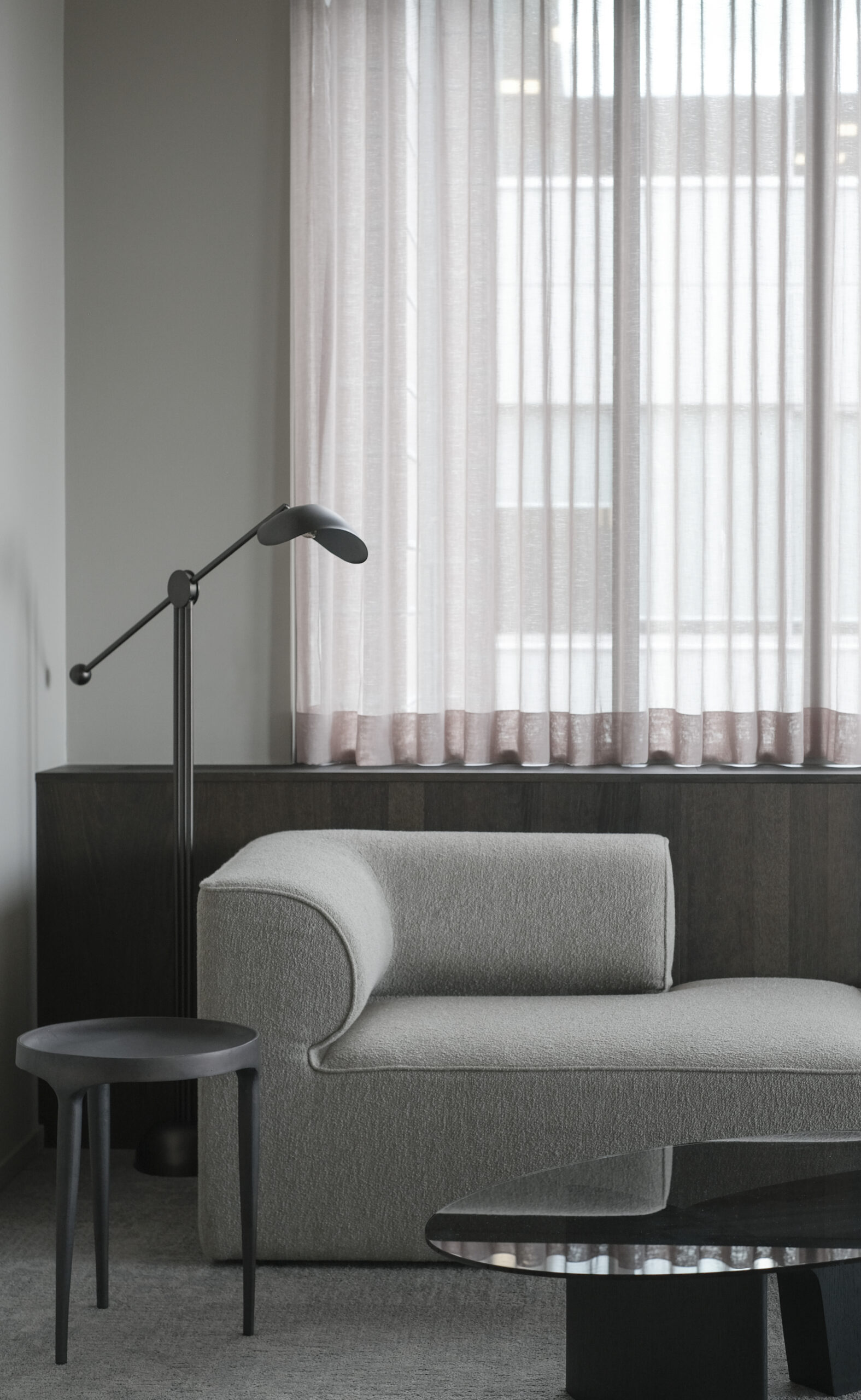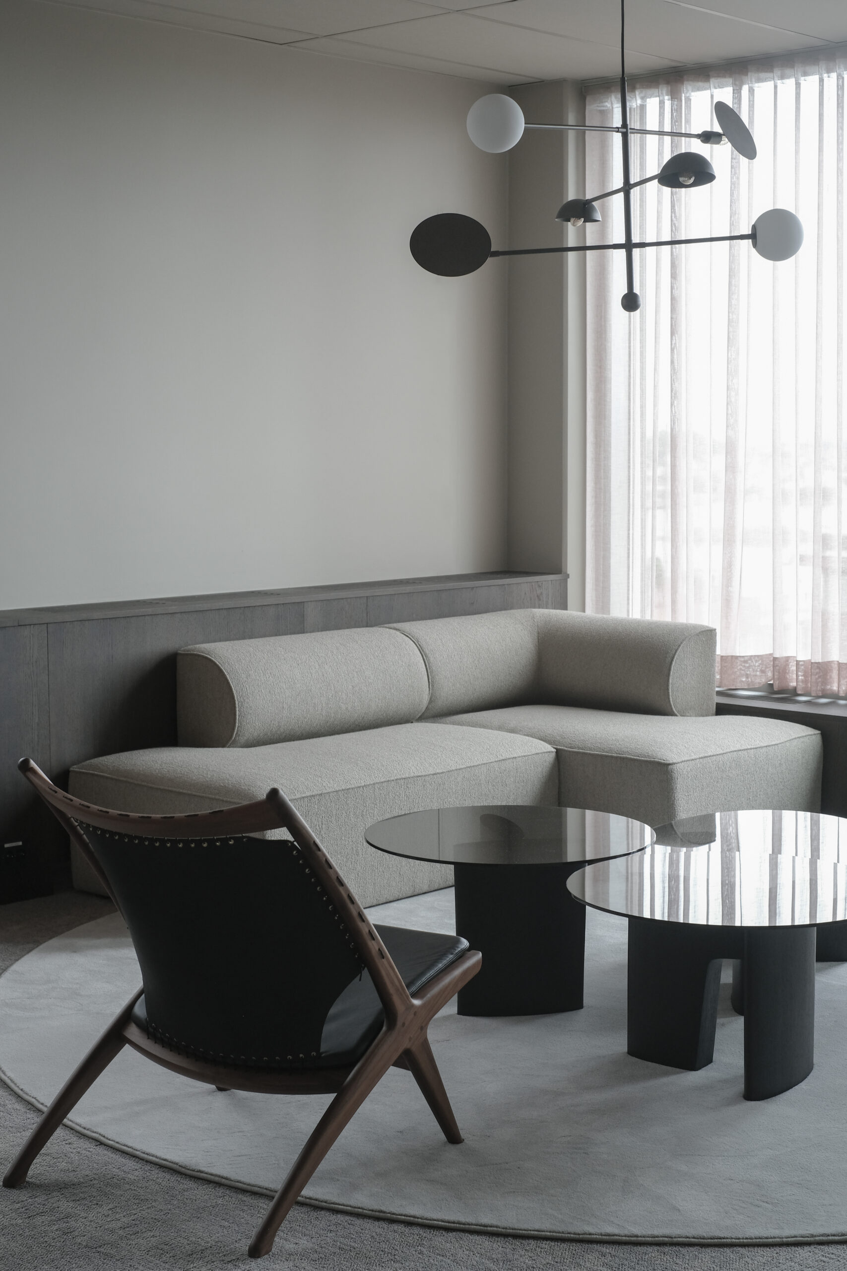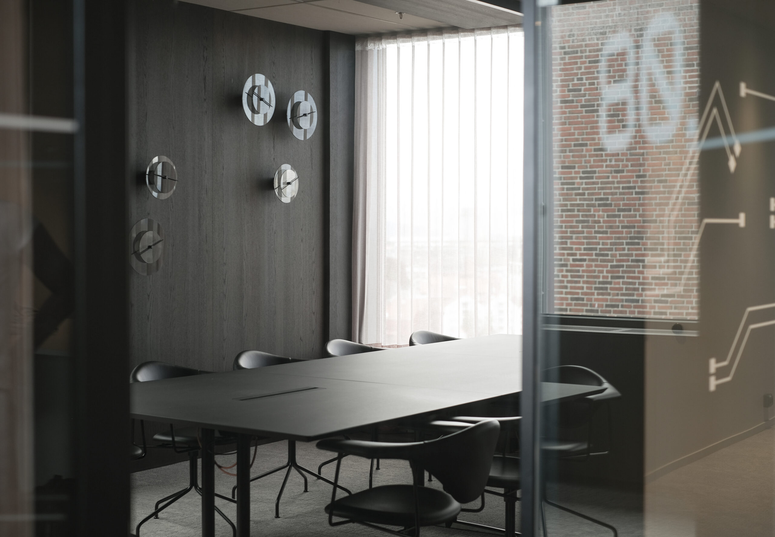 Totalt 900 kvadratmeter er totalrenovert og tilpasset med gjennomtenkte materialvalg og løsninger. En nedtonet og elegant palett i lyse beige toner, sort og mørkbeiset eik gir interiøret et sofistikert preg. Naturlig lys og utsikten spiller en viktig rolle – her er det rom for fokus, samarbeid og nytenkning.